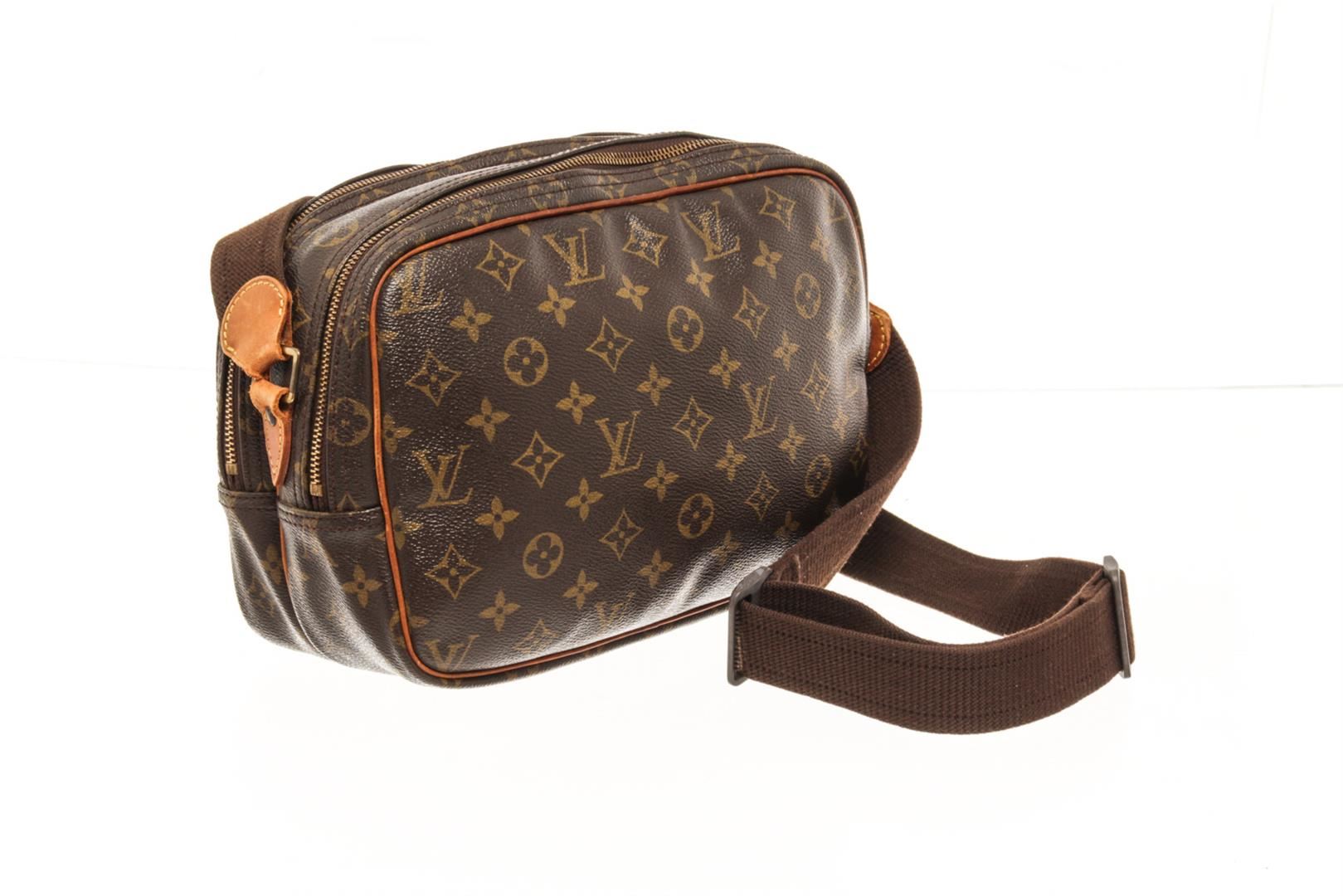 One Louis Vuitton Brown Monogram Reporter PM Crossbody Bag. Item is sold AS-IS. All available information is listed in the description and shown in the photo. louis vuitton brown monogram reporter pm crossbody bag with the reporter pm features a monogram canvas body with leather trim, an exterior front slip pocket, an adjustable flat strap, double compartments with top zip closures, and interior slip pockets. Height: 7.1" Width: 10.6" Depth: 4.7", Handle Drop: 5" / 18.03 x 26.92 x 11.93 Cm