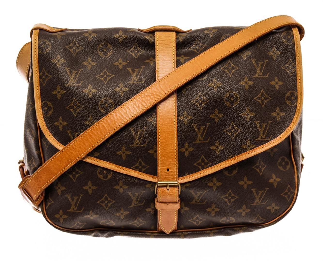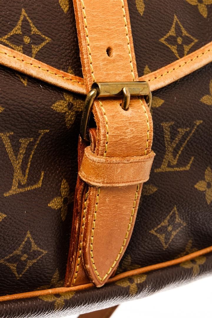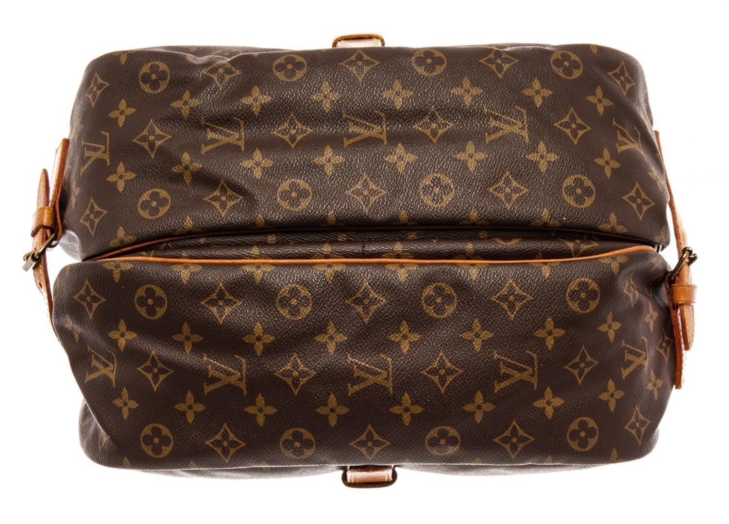 Louis Vuitton Brown Monogram Saumur 35cm Crossbody Bag. All available information is listed in the description and shown in the photos. Louis Vuitton Brown Monogram Saumur 35cm Crossbody Bag with material monogram canvas, gold ton hardware, tan vachetta leather trim, interior slip pockets, canvas lining, shoulder strap and trun-lock closures. Height: 10.5" Width: 8" Depth: 13.5", 26.67 x 20.32 x 34.29 Cm