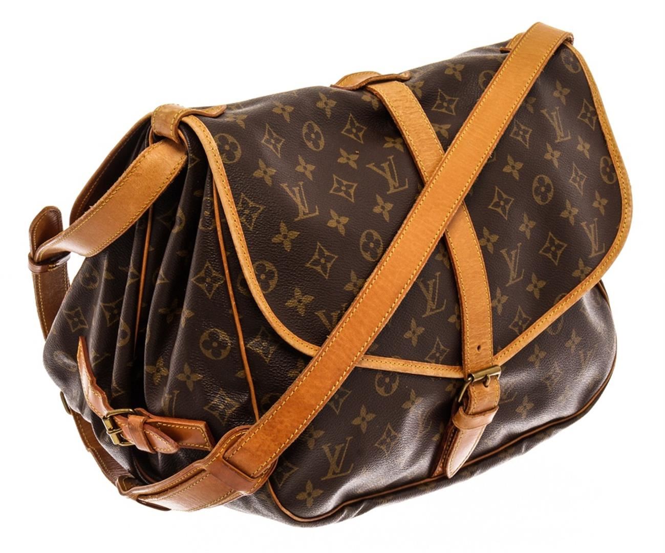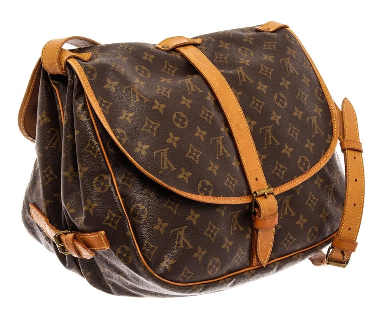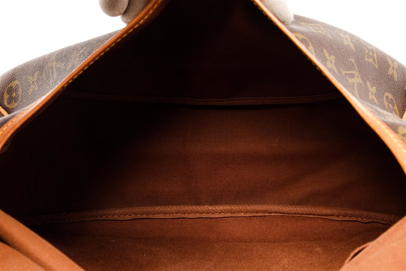 Louis Vuitton Brown Monogram Saumur 35cm Crossbody Bag. All available information is listed in the description and shown in the photos. Louis Vuitton Brown Monogram Saumur 35cm Crossbody Bag with material monogram canvas, gold ton hardware, tan vachetta leather trim, interior slip pockets, canvas lining, shoulder strap and trun-lock closures. Height: 10.5" Width: 8" Depth: 13.5", 26.67 x 20.32 x 34.29 Cm