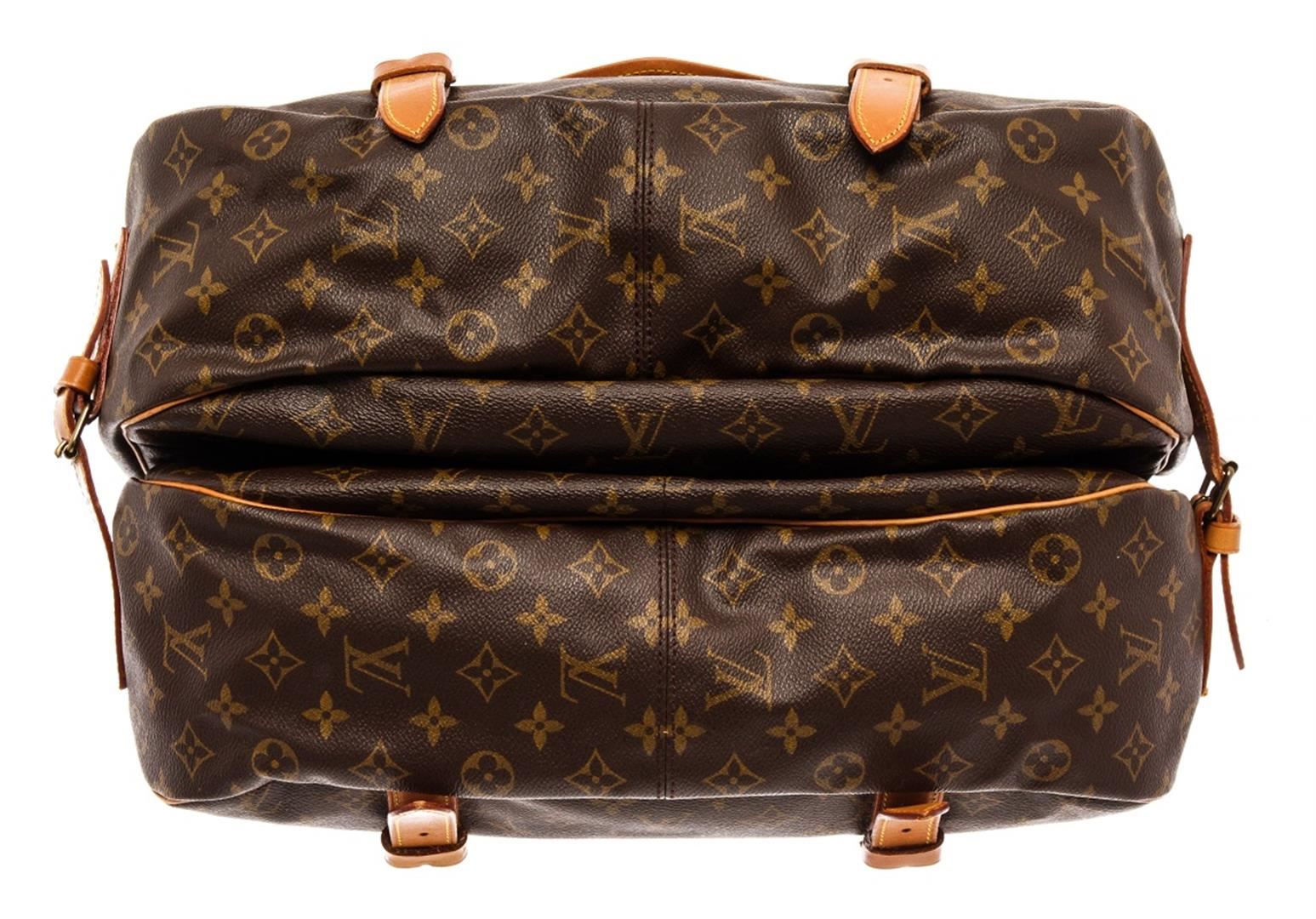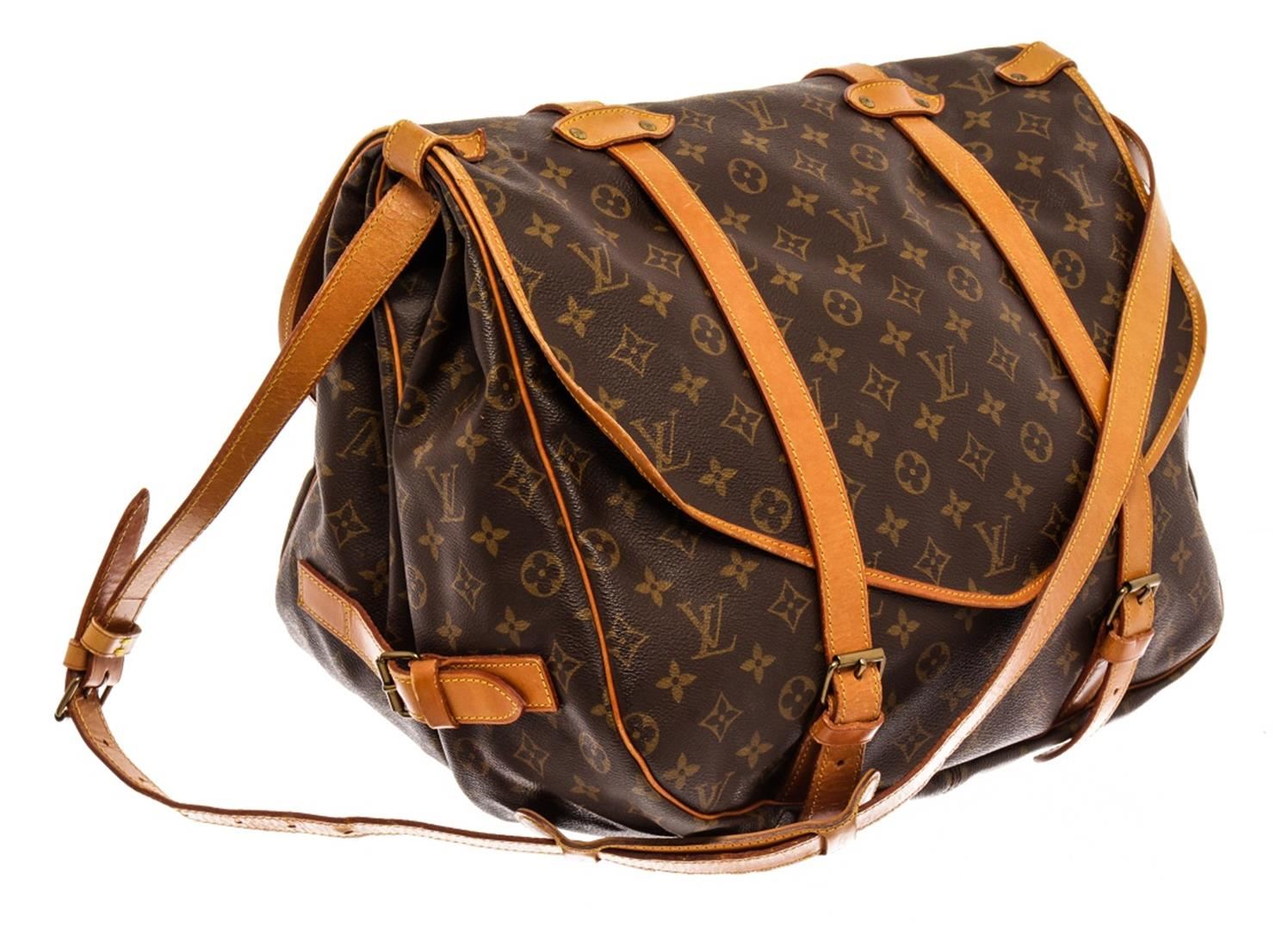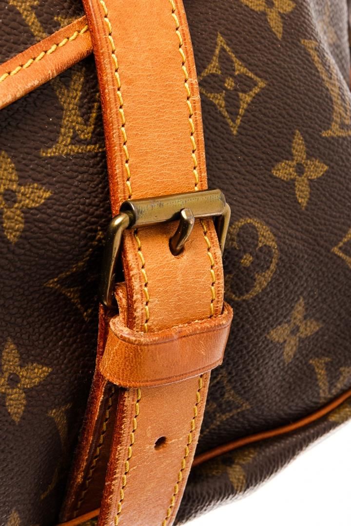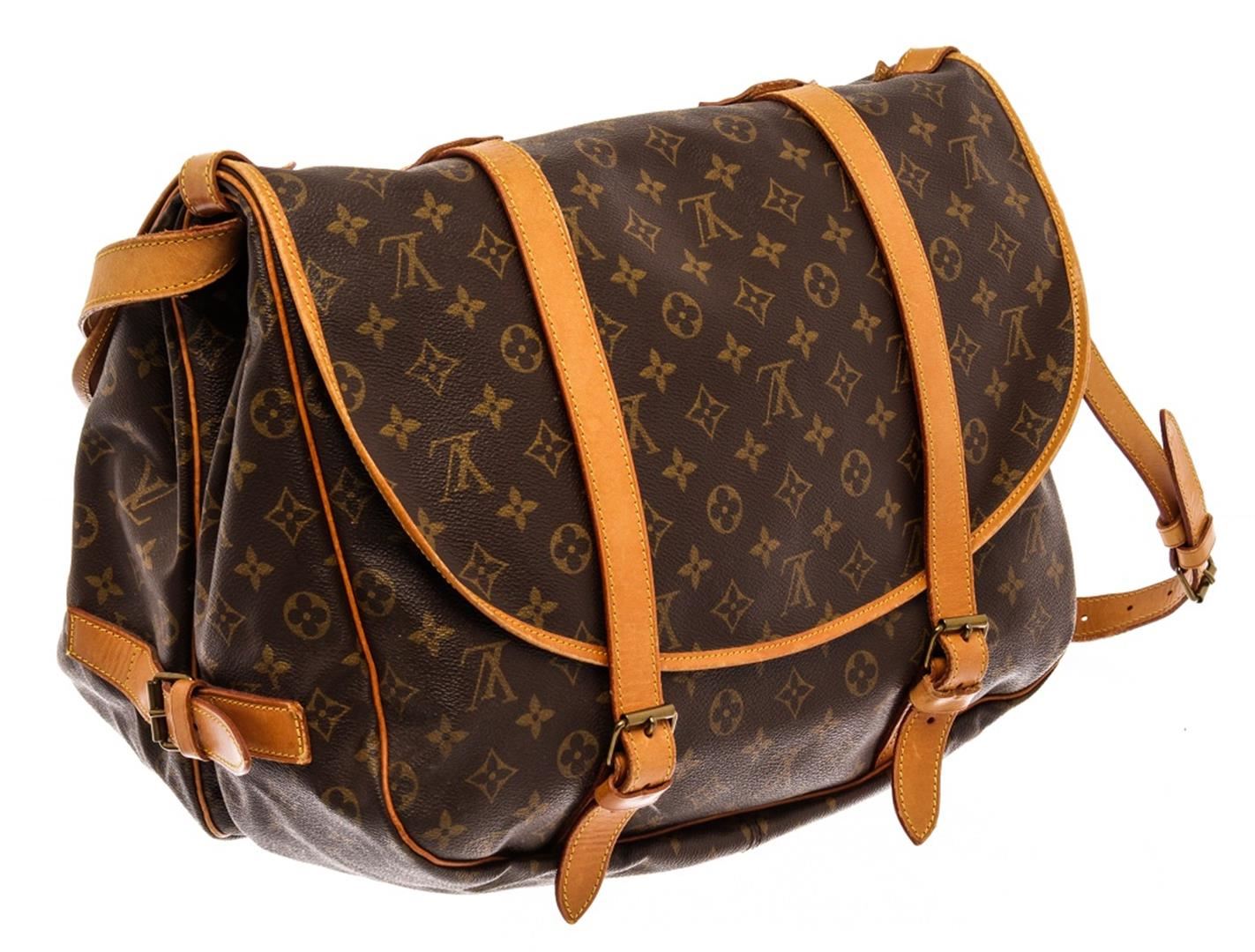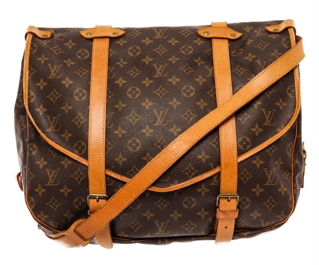 Louis Vuitton Brown Monogram Saumur 43cm Shoulder Bag. All available information is listed in the description and shown in the photos. Louis Vuitton Brown Monogram Saumur 43cm Shoulder Bag with vintage, brown coated canvas, brass hardware, single adjustable shoulder strap, leather trim embellishment, canvas lining & three interior pockets, buckle closure at front, includes dust bag. Height: 13.75" Width: 17" Depth: 8.25", Shoulder Strap Drop Max: 19.5" / 34.92 x 43.18 x 20.95 Cm