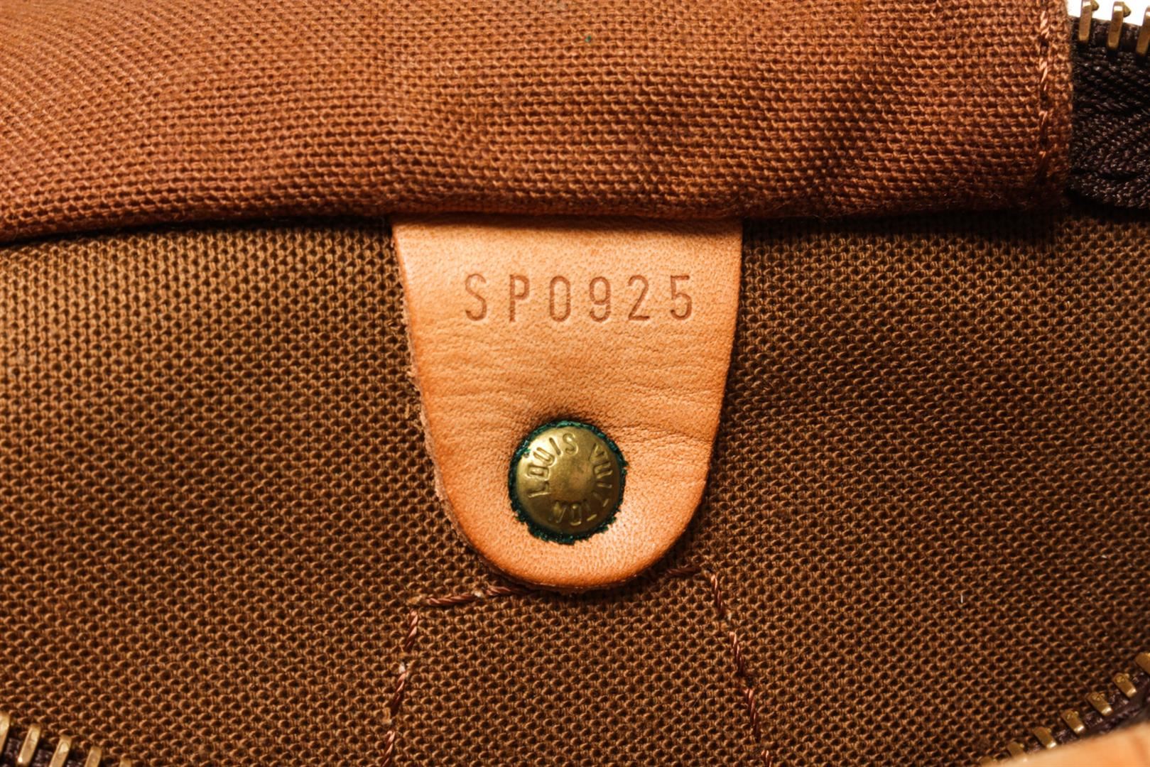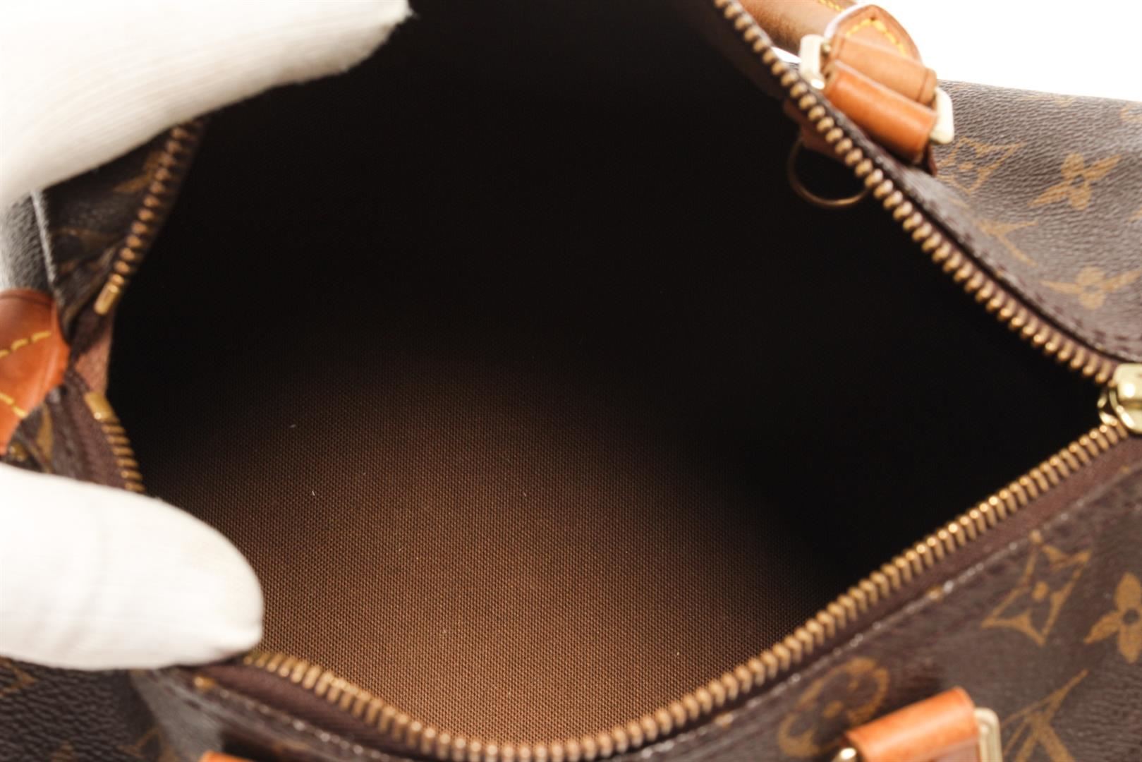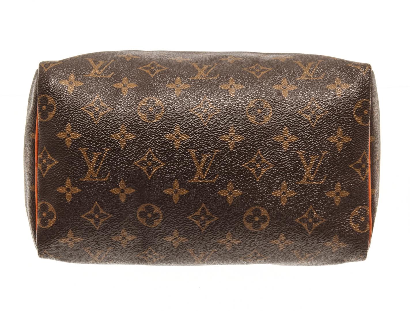 One Louis Vuitton Brown Monogram Speedy 25 Handbag. Item is sold AS-IS. All available information is listed in the description and shown in the photo. Louis Vuitton Brown Monogram Speedy 25 Handbag with brown and tan monogram coated canvas, brass hardware, tan vachetta leather trim, dual rolled top handles, brown interior canvas, single slit pocket at interior, zip closure on top. Height 7", Width 10", Depth 6", Handle Drop 3.25 Inch / 17.78 x 25.4 x 15.24 CM, Handle Drop 8.25 CM