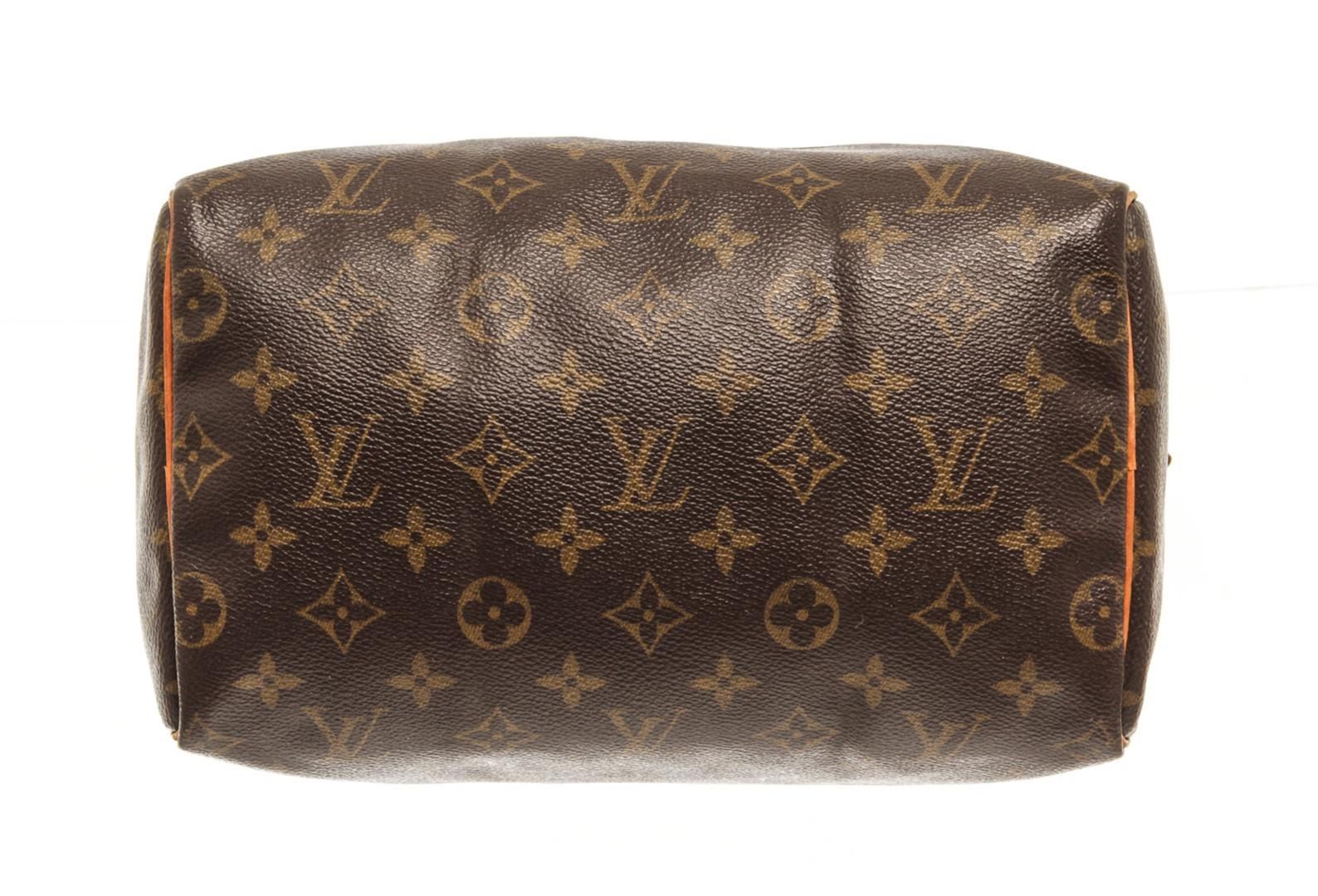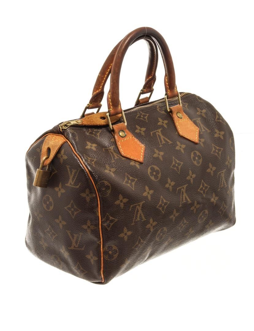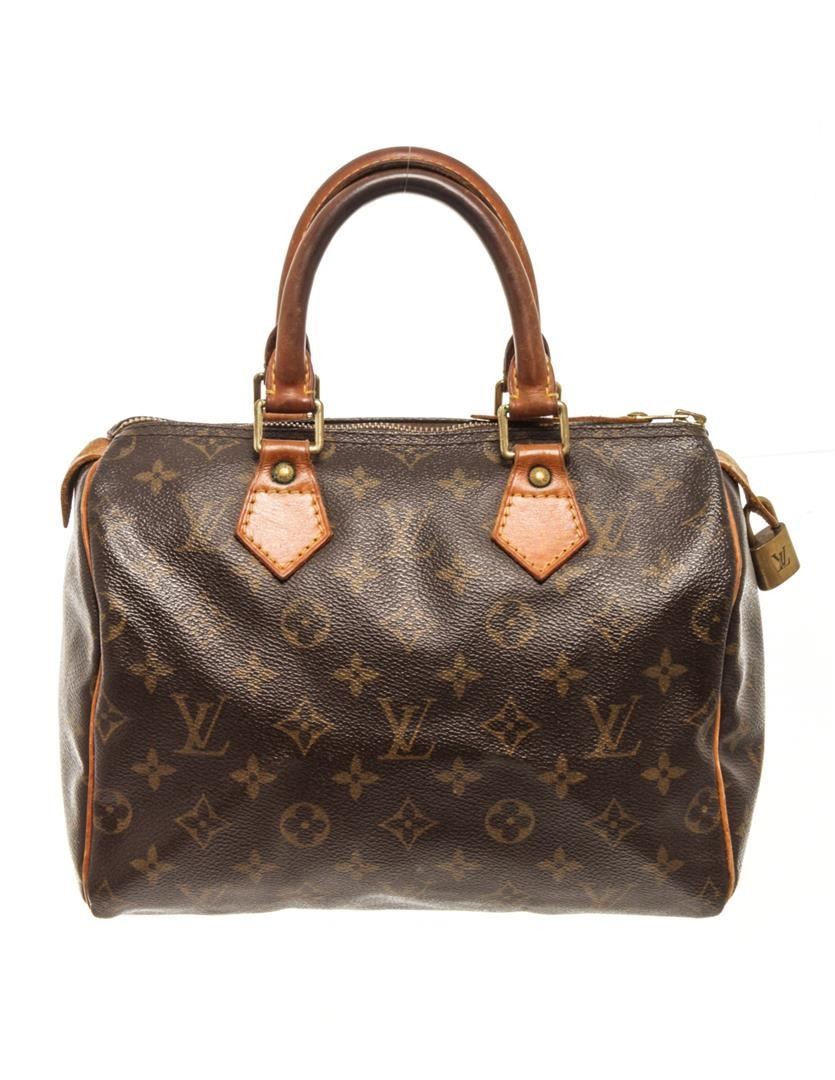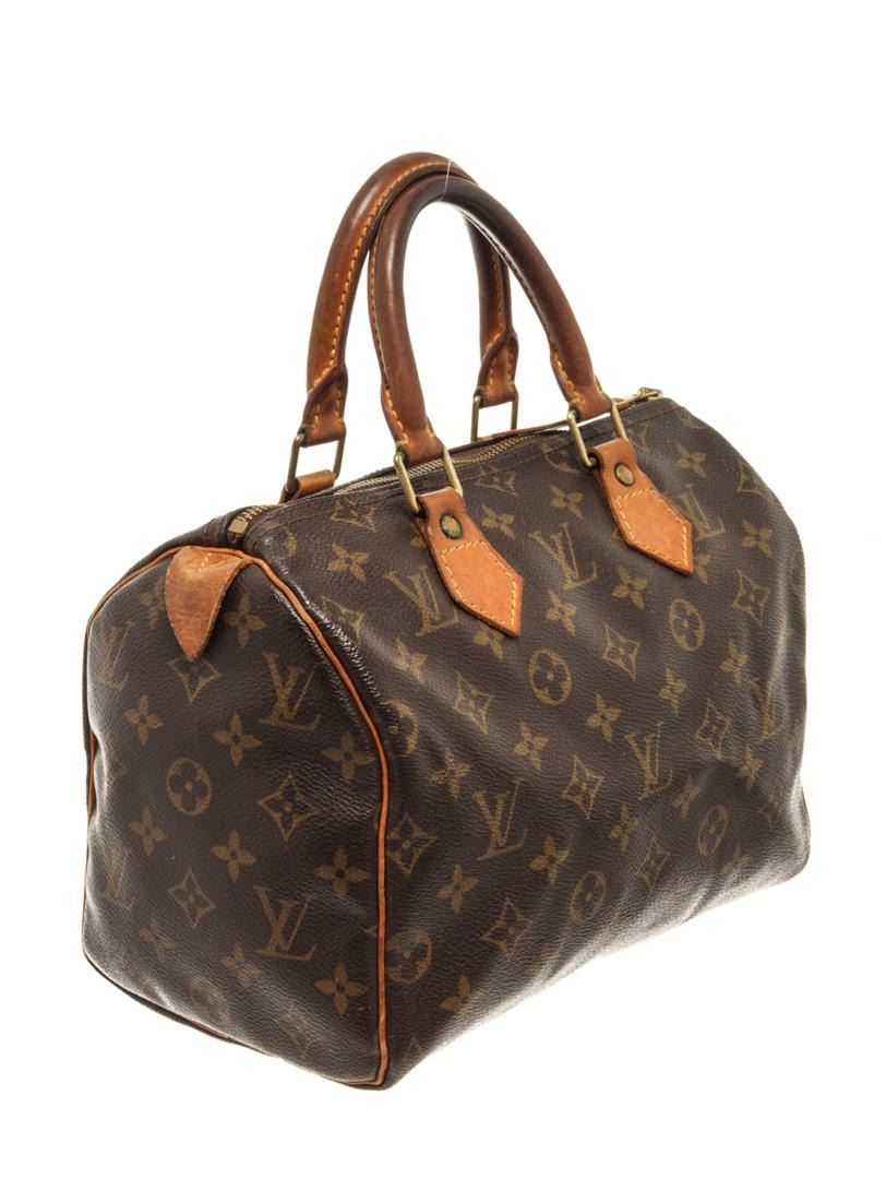 One Louis Vuitton Brown Monogram Speedy 25 Handbag. Item is sold AS-IS. All available information is listed in the description and shown in the photo. Louis Vuitton Brown Monogram Speedy 25 Handbag with brown and tan monogram coated canvas, brass hardware, tan vachetta leather trim, dual rolled top handles, brown interior canvas, single slit pocket at interior, zip closure on top. Height 7", Width 10", Depth 6", Handle Drop 3.25 Inch / 17.78 x 25.4 x 15.24 CM, Handle Drop 8.25 CM