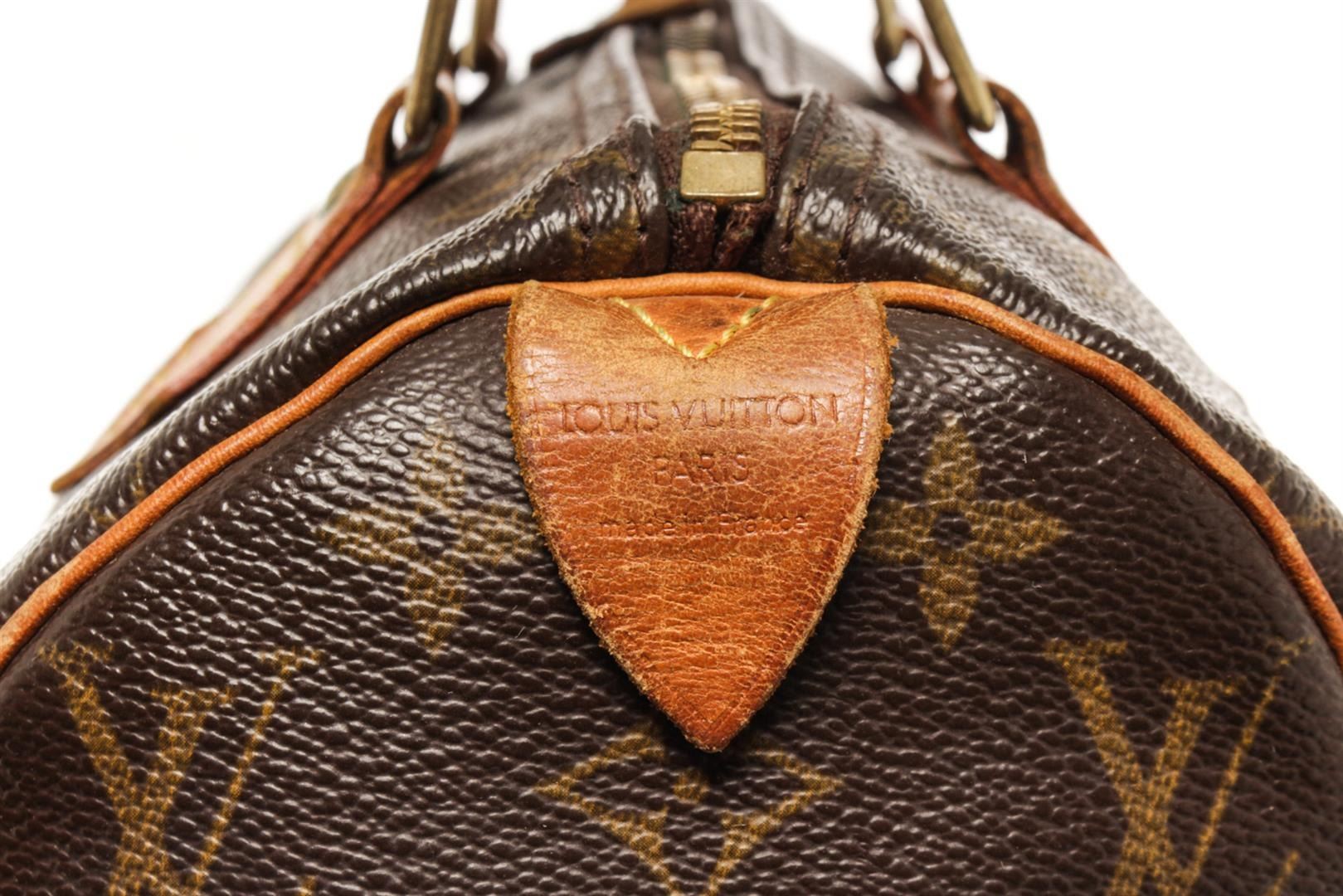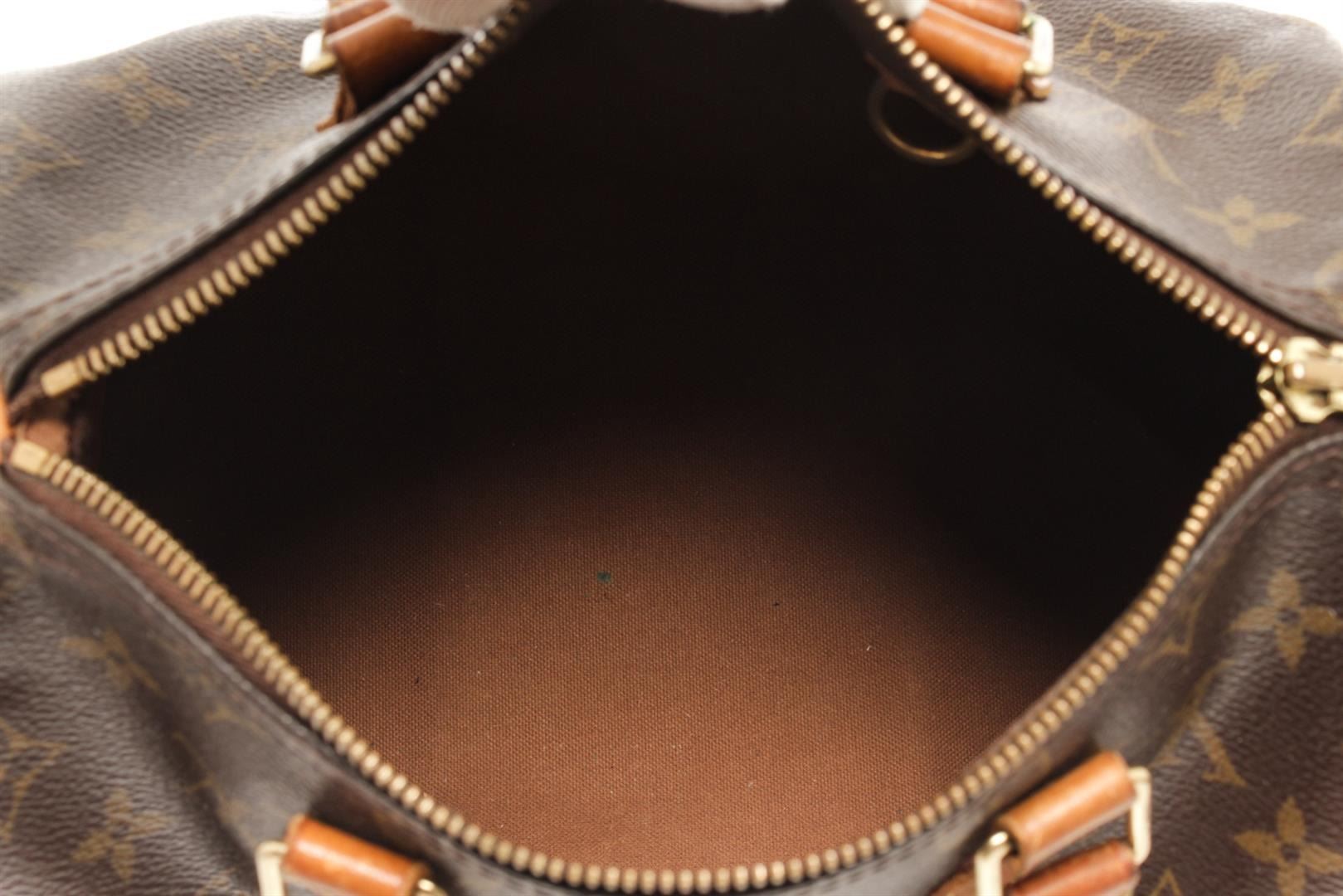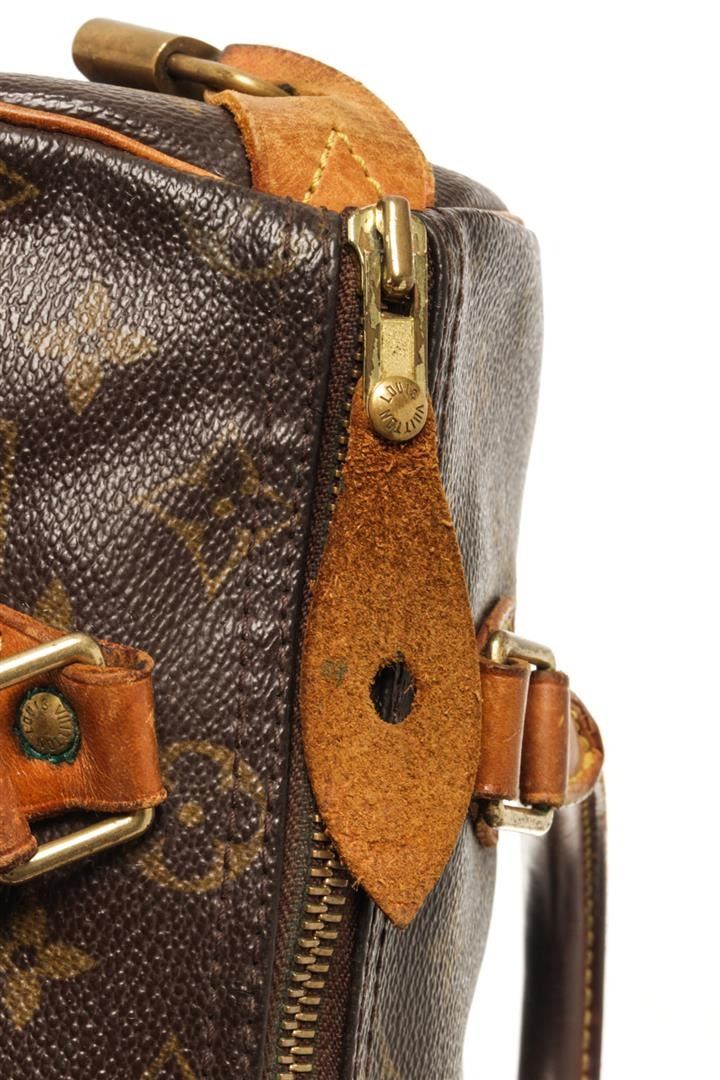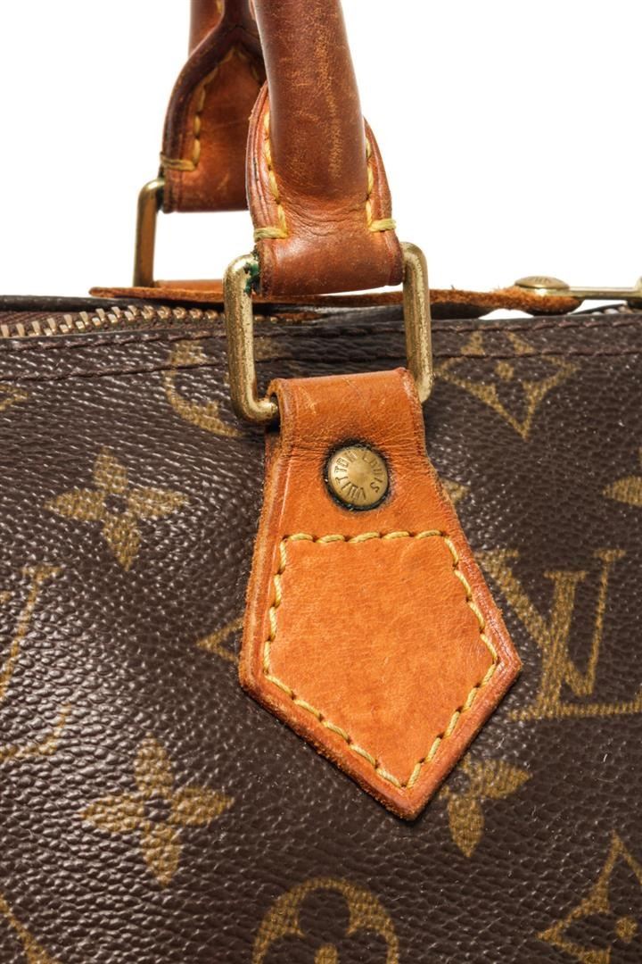 One Louis Vuitton Brown Monogram Speedy 25 Handbag. Item is sold AS-IS. All available information is listed in the description and shown in the photo. Louis Vuitton Brown Monogram Speedy 25 Handbag with brown and tan monogram coated canvas, brass hardware, tan vachetta leather trim, dual rolled top handles, brown interior canvas, single slit pocket at interior, zip closure on top. Height 7", Width 10", Depth 6", Handle Drop 3.25 Inch / 17.78 x 25.4 x 15.24 CM, Handle Drop 8.25 CM