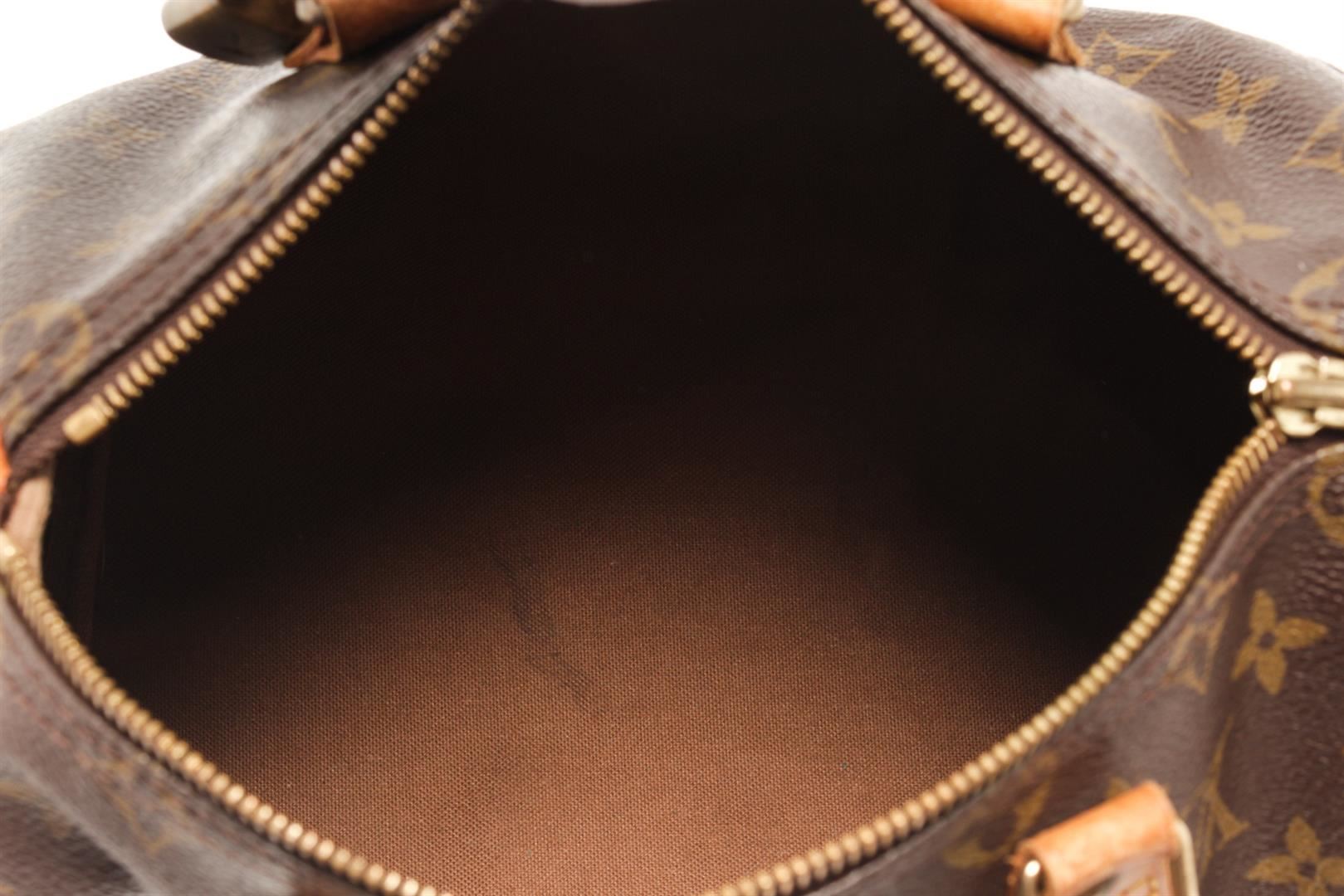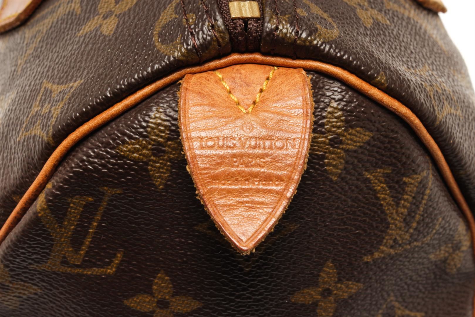 One Louis Vuitton Brown Monogram Speedy 25 Handbag. Item is sold AS-IS. All available information is listed in the description and shown in the photo. Louis Vuitton Brown Monogram Speedy 25 Handbag with brown, monogram pattern, brass hardware, handles, canvas lining, zip closure at top. Height: 7", Width: 10", Depth: 5.5", Handle Drop: 3.5" / 17.78 x 25.4 x 13.97 CM, Handle Drop 8.25 CM
