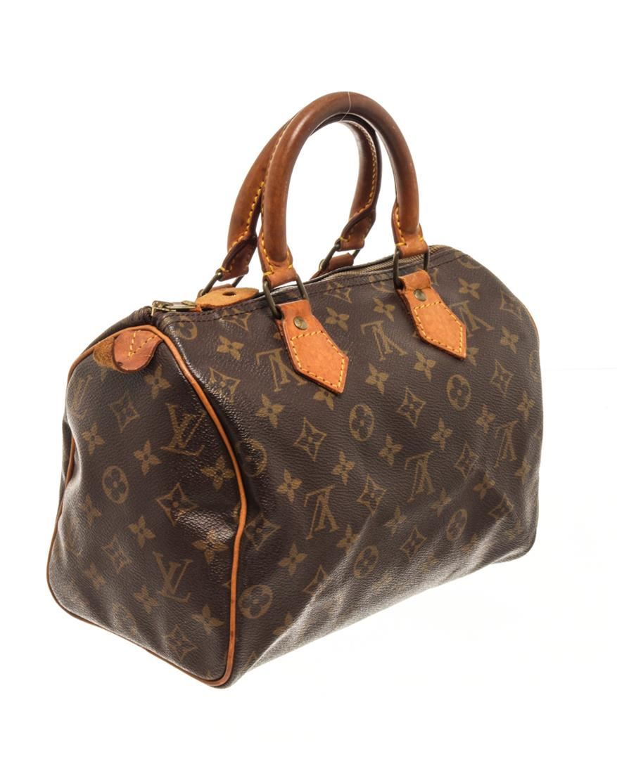 One Louis Vuitton Brown Monogram Speedy 25 Handbag. Item is sold AS-IS. All available information is listed in the description and shown in the photo. Louis Vuitton Brown Monogram Speedy 25 Handbag with brown and tan monogram coated canvas, brass hardware, tan vachetta leather trim, dual rolled top handles, brown interior canvas, single slit pocket at interior, zip closure on top. Height 7", Width 10", Depth 6", Handle Drop 3.25 Inch / 17.78 x 25.4 x 15.24 CM, Handle Drop 8.25 CM