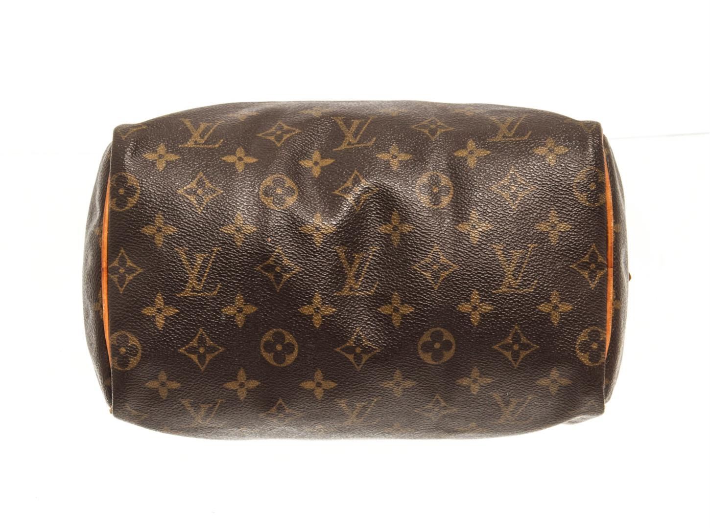 One Louis Vuitton Brown Monogram Speedy 25 Handbag. Item is sold AS-IS. All available information is listed in the description and shown in the photo. Louis Vuitton Brown Monogram Speedy 25 Handbag with brown louis vuitton monogram speedy 25 bag. the speedy 25 features the monogram canvas, vachetta handles and trim, a top zip closure, and an interior pocket. 7.5" L x 9.8" W x 5.9" D, 3.5" drop / 19.05 L x 24.89 W x 14.98 D CM, 8.89 CM drop