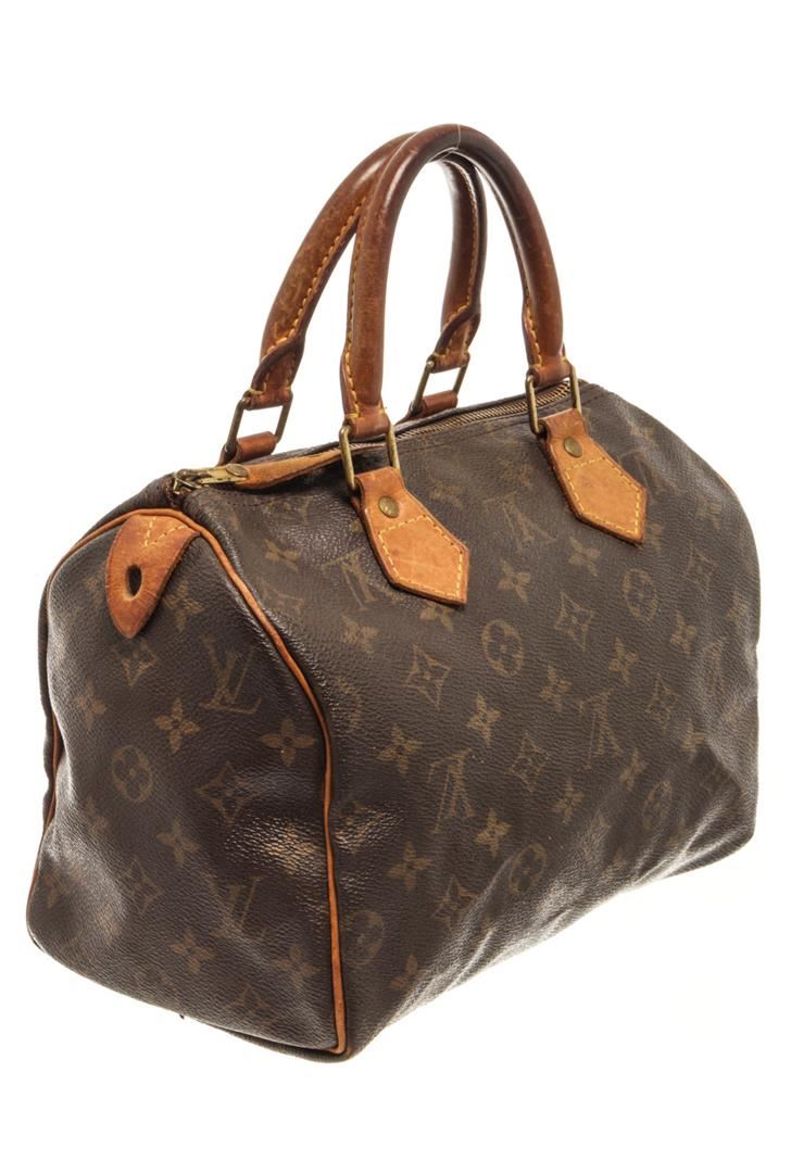One Louis Vuitton Brown Monogram Speedy 25 Handbag. Item is sold AS-IS. All available information is listed in the description and shown in the photo. Louis Vuitton Brown Monogram Speedy 25 Handbag with gold tone hardware, monogram canvas, vachetta handles and trim, a top zip closure, and an interior pocket. 7.5" L x 9.8" W x 5.9" D, 3.5" drop / 19.05 L x 24.89 W x 14.98 D CM, 8.89 CM drop