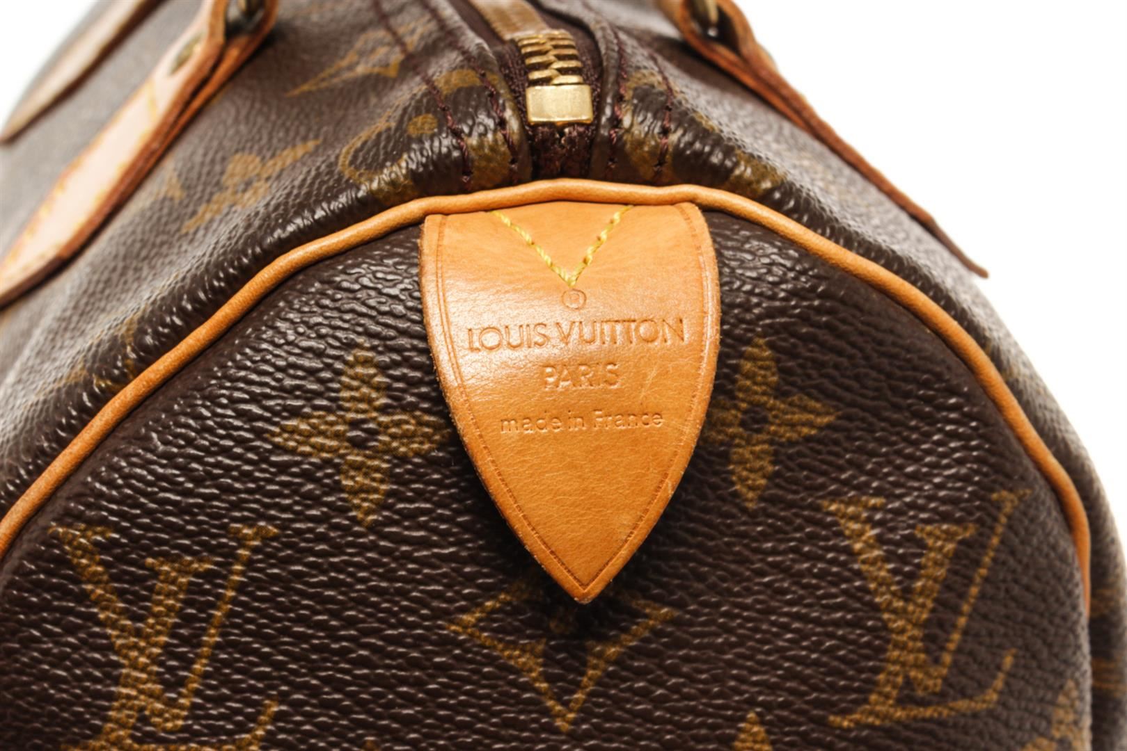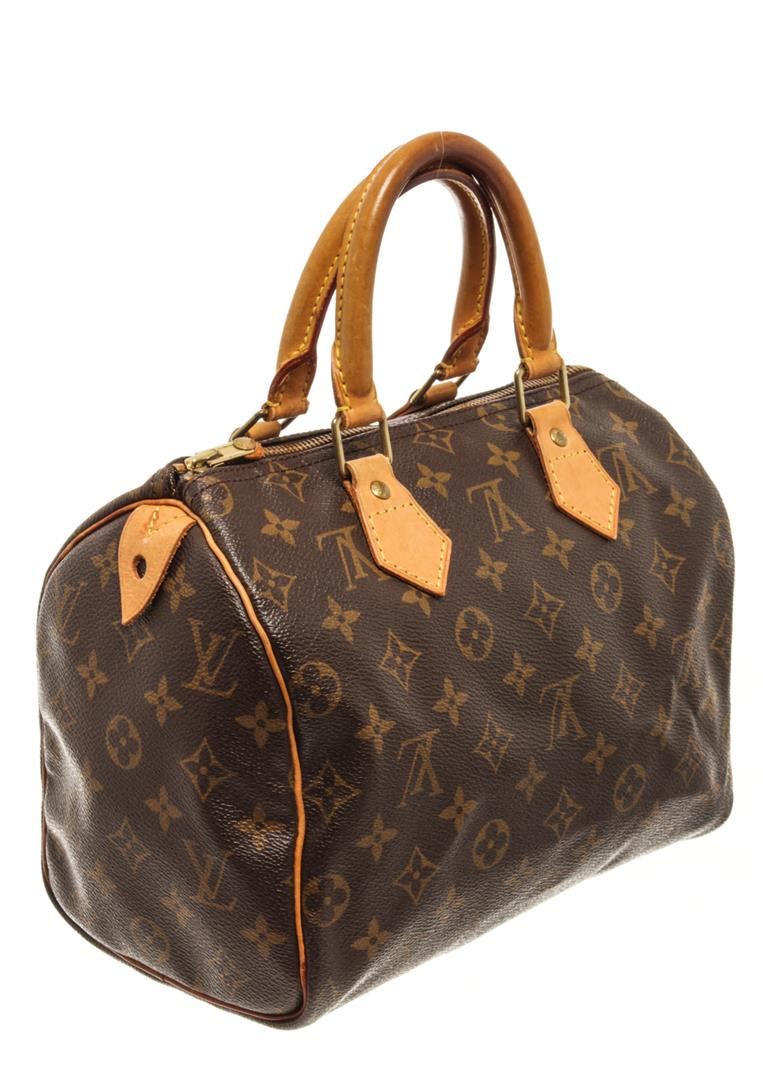 One Louis Vuitton Brown Monogram Speedy 25 Handbag. Item is sold AS-IS. All available information is listed in the description and shown in the photo. Louis Vuitton Brown Monogram Speedy 25 Handbag with gold tone hardware, monogram canvas, vachetta handles and trim, a top zip closure, and an interior pocket. 7.5" L x 9.8" W x 5.9" D, 3.5" drop / 19.05 L x 24.89 W x 14.98 D CM, 8.89 CM drop