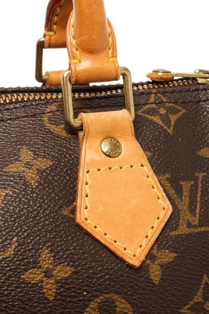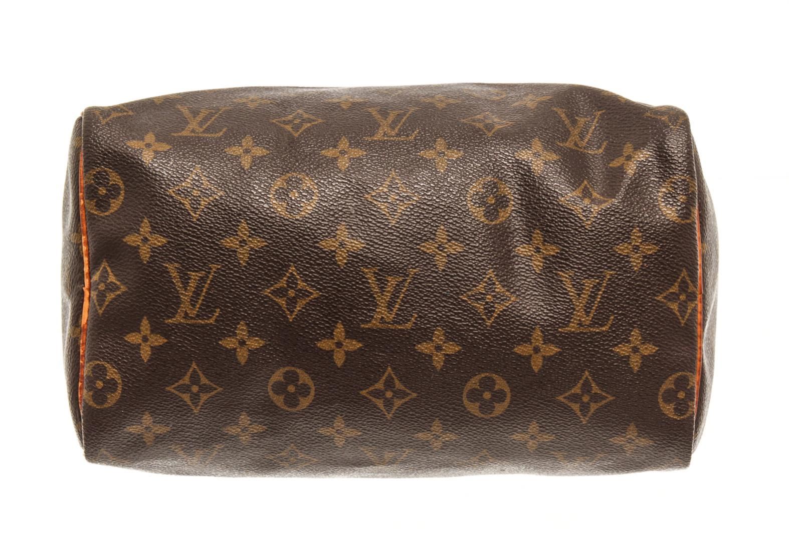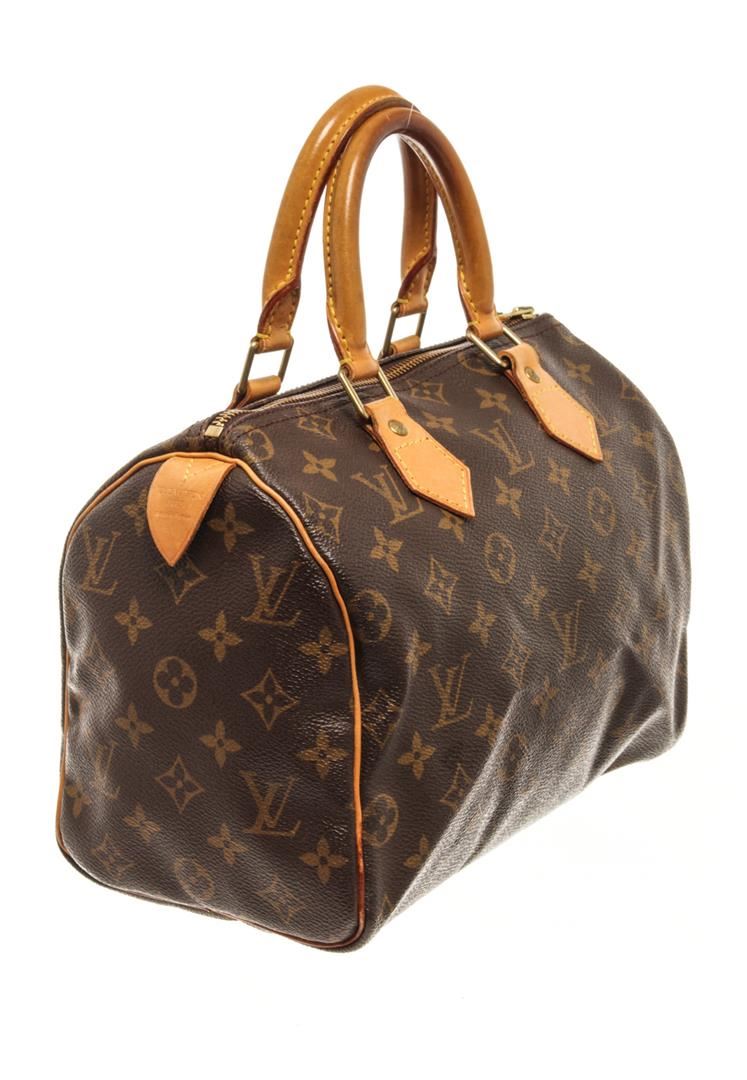 One Louis Vuitton Brown Monogram Speedy 25 Handbag. Item is sold AS-IS. All available information is listed in the description and shown in the photo. Louis Vuitton Brown Monogram Speedy 25 Handbag with gold tone hardware, monogram canvas, vachetta handles and trim, a top zip closure, and an interior pocket. 7.5" L x 9.8" W x 5.9" D, 3.5" drop / 19.05 L x 24.89 W x 14.98 D CM, 8.89 CM drop