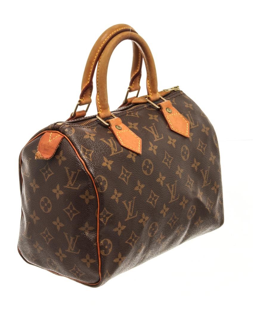 One Louis Vuitton Brown Monogram Speedy 25 Handbag. Item is sold AS-IS. All available information is listed in the description and shown in the photo. Louis Vuitton Brown Monogram Speedy 25 Handbag with brown and tan monogram coated canvas, brass hardware, tan vachetta leather trim, dual rolled top handles, brown interior canvas, single slit pocket at interior, zip closure on top. Height 7", Width 10", Depth 6", Handle Drop 3.25 Inch / 17.78 x 25.4 x 15.24 CM, Handle Drop 8.25 CM