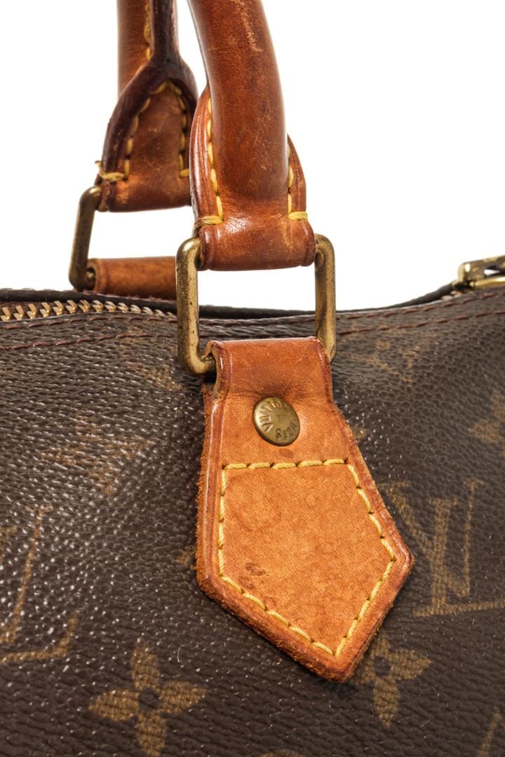 One Louis Vuitton Brown Monogram Speedy 25 Handbag. Item is sold AS-IS. All available information is listed in the description and shown in the photo. Louis Vuitton Brown Monogram Speedy 25 Handbag with gold tone hardware, monogram canvas, vachetta handles and trim, a top zip closure, and an interior pocket. 7.5" L x 9.8" W x 5.9" D, 3.5" drop / 19.05 L x 24.89 W x 14.98 D CM, 8.89 CM drop
