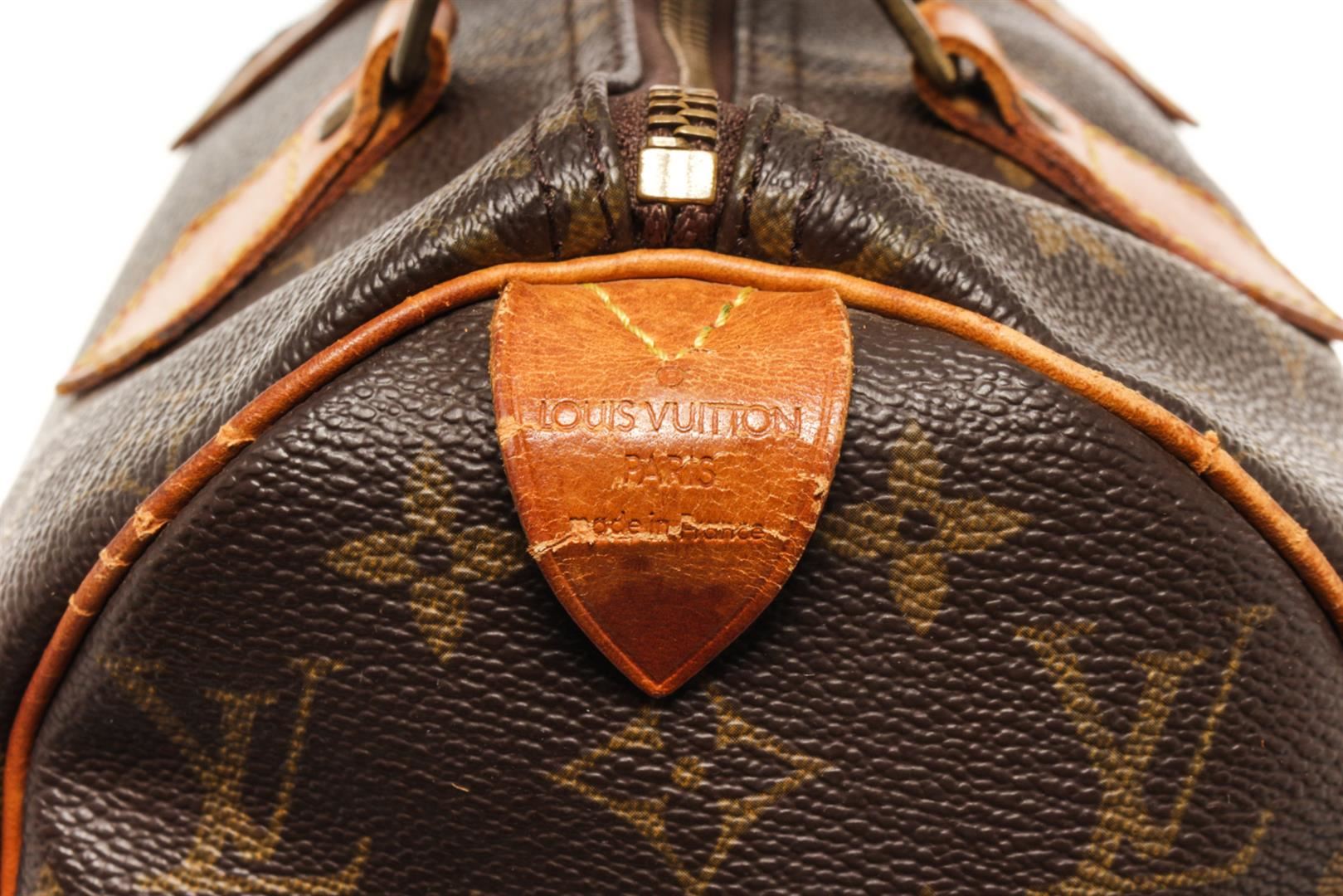 One Louis Vuitton Brown Monogram Speedy 25 Handbag. Item is sold AS-IS. All available information is listed in the description and shown in the photo. Louis Vuitton Brown Monogram Speedy 25 Handbag with brown louis vuitton monogram speedy 25 bag. the speedy 25 features the monogram canvas, vachetta handles and trim, a top zip closure, and an interior pocket. 7.5" L x 9.8" W x 5.9" D, 3.5" drop / 19.05 L x 24.89 W x 14.98 D CM, 8.89 CM drop