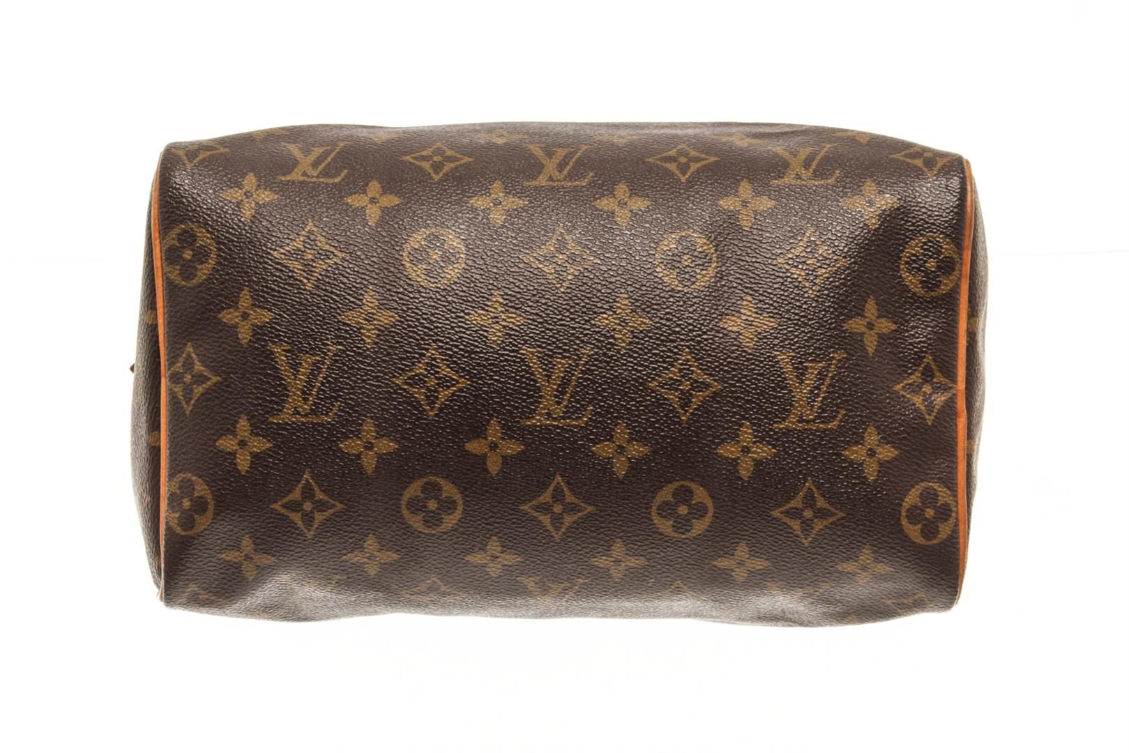 One Louis Vuitton Brown Monogram Speedy 25 Handbag. Item is sold AS-IS. All available information is listed in the description and shown in the photo. Louis Vuitton Brown Monogram Speedy 25 Handbag with brown and tan monogram coated canvas, brass hardware, tan vachetta leather trim, dual rolled top handles, brown interior canvas, single slit pocket at interior, zip closure on top. Height 7", Width 10", Depth 6", Handle Drop 3.25 Inch / 17.78 x 25.4 x 15.24 CM, Handle Drop 8.25 CM