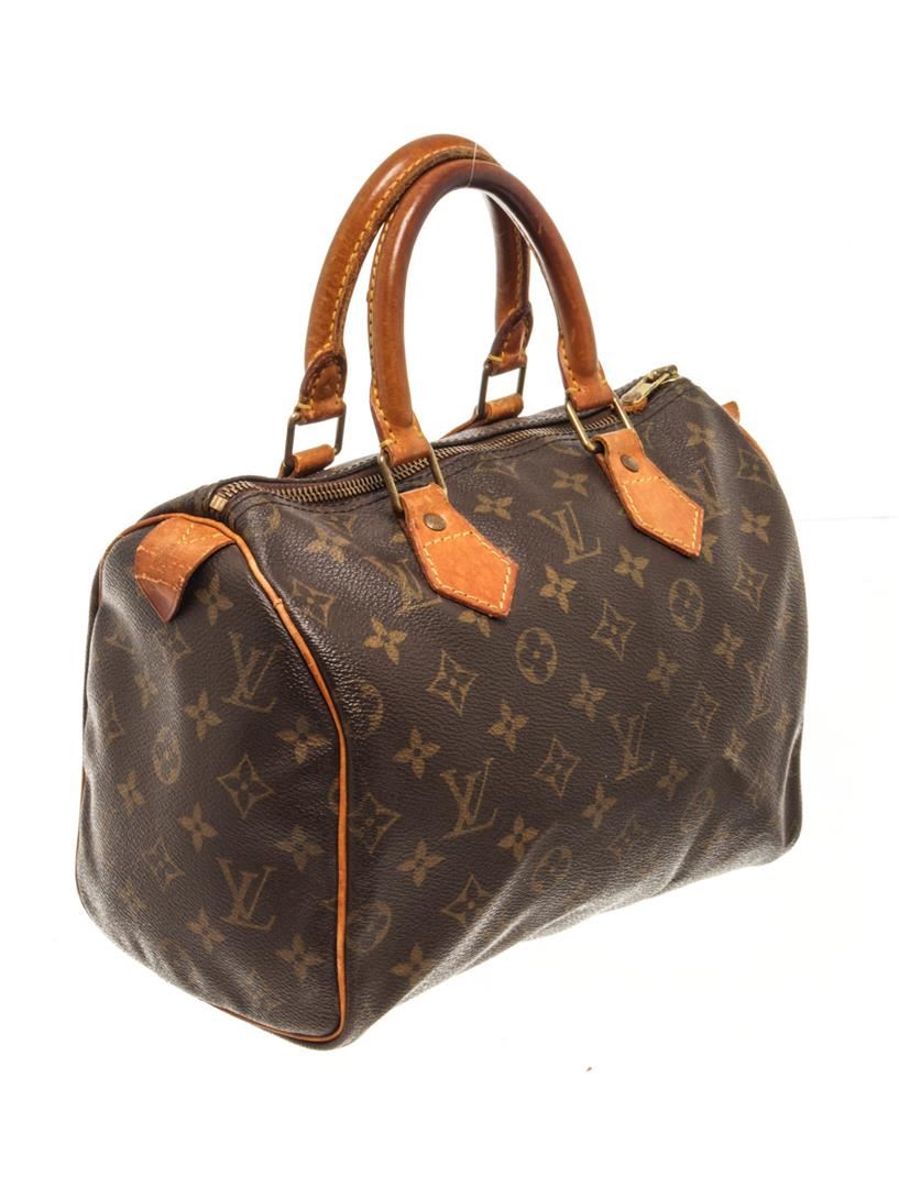 One Louis Vuitton Brown Monogram Speedy 25 Handbag. Item is sold AS-IS. All available information is listed in the description and shown in the photo. Louis Vuitton Brown Monogram Speedy 25 Handbag with brown louis vuitton monogram speedy 25 bag. the speedy 25 features the monogram canvas, vachetta handles and trim, a top zip closure, and an interior pocket. 7.5" L x 9.8" W x 5.9" D, 3.5" drop / 19.05 L x 24.89 W x 14.98 D CM, 8.89 CM drop