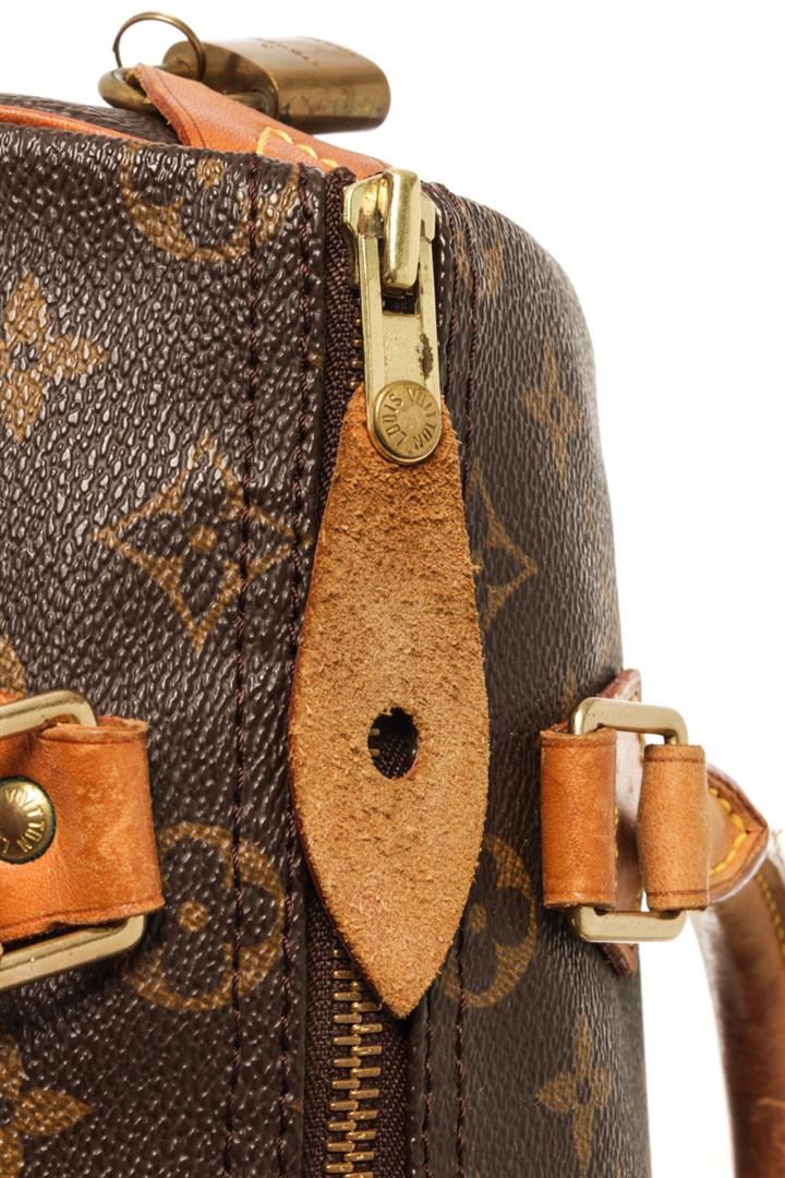 One Louis Vuitton Brown Monogram Speedy 25 Handbag. Item is sold AS-IS. All available information is listed in the description and shown in the photo. Louis Vuitton Brown Monogram Speedy 25 Handbag with brown and tan monogram coated canvas, brass hardware, tan vachetta leather trim, dual rolled top handles, brown interior canvas, single slit pocket at interior, zip closure on top. Height 7", Width 10", Depth 6", Handle Drop 3.25 Inch / 17.78 x 25.4 x 15.24 CM, Handle Drop 8.25 CM