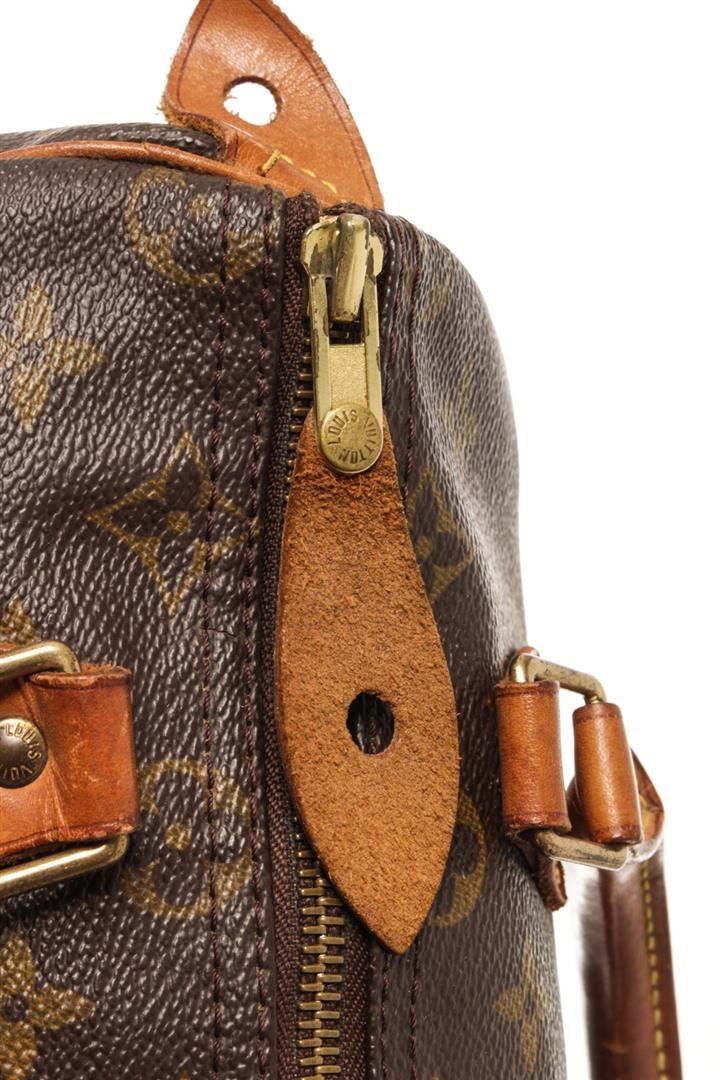 One Louis Vuitton Brown Monogram Speedy 25 Satchel Bag. Item is sold AS-IS. All available information is listed in the description and shown in the photo. Louis Vuitton Brown Monogram Speedy 25 Satchel Bag with gold tone hardware, monogram canvas, vachetta handles and trim, a top zip closure, and an interior pocket. 7.5" L x 9.8" W x 5.9" D, 3.5" drop / 19.05 L x 24.89 W x 14.98 D CM, 8.89 CM drop