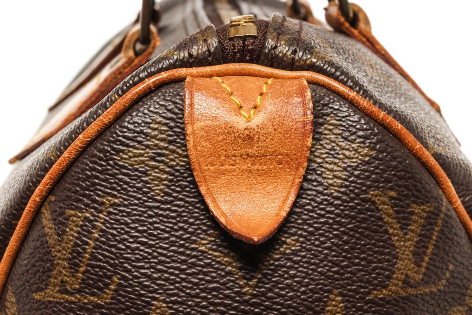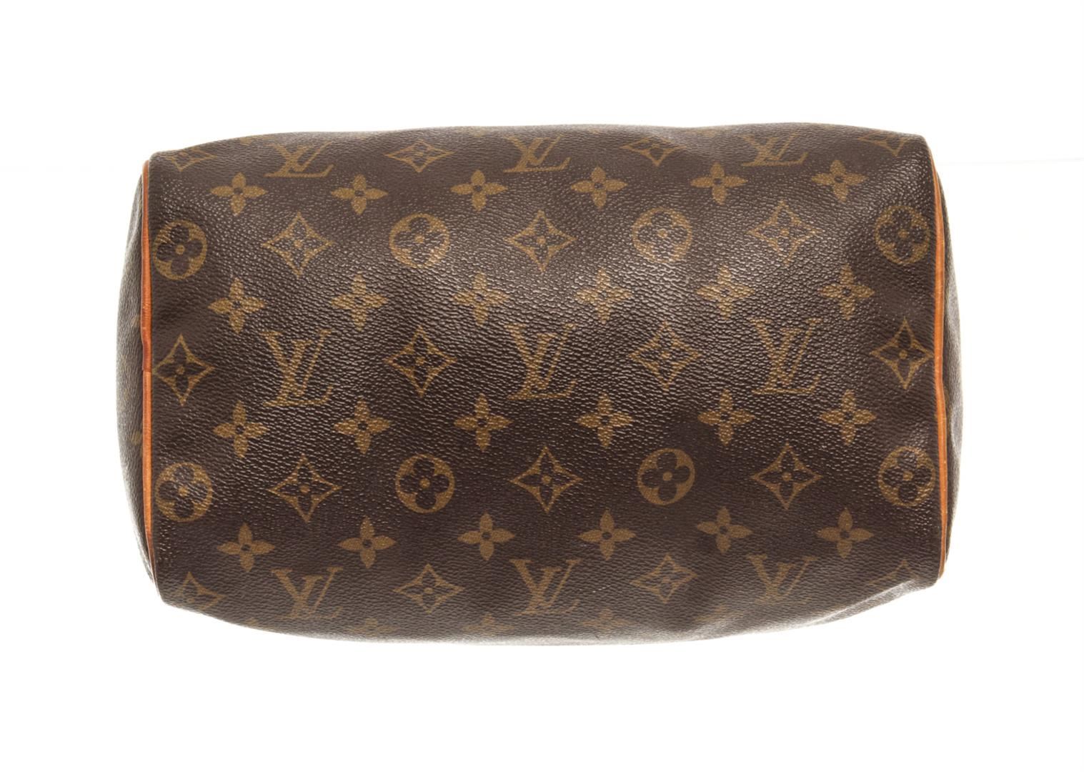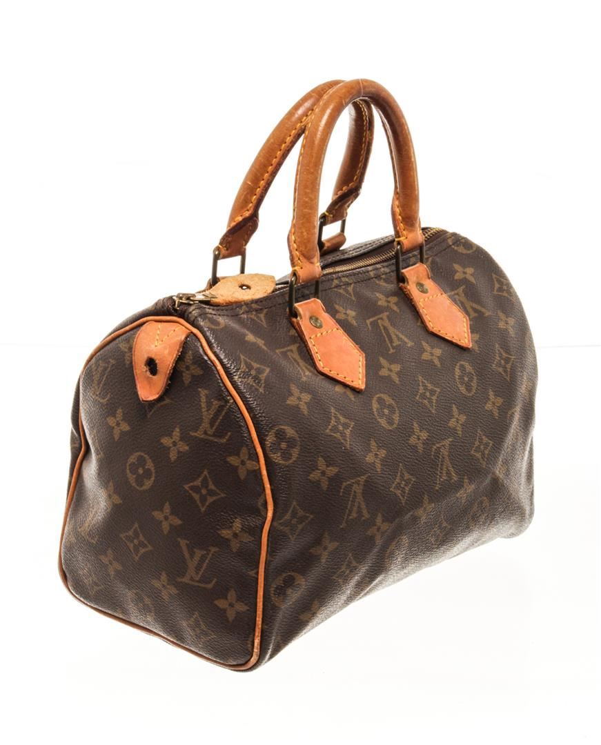 One Louis Vuitton Brown Monogram Speedy 25 Satchel Bag. Item is sold AS-IS. All available information is listed in the description and shown in the photo. Louis Vuitton Brown Monogram Speedy 25 Satchel Bag with, brown, printed, brass hardware, rolled handles, canvas lining & single interior pocket, zip closure at top. Height: 8", Width: 9.75", Depth: 5.5", Handle Drop: 3.75" / 20.32 x 24.76 x 13.97 Cm, Handle Drop: 9.52 CM