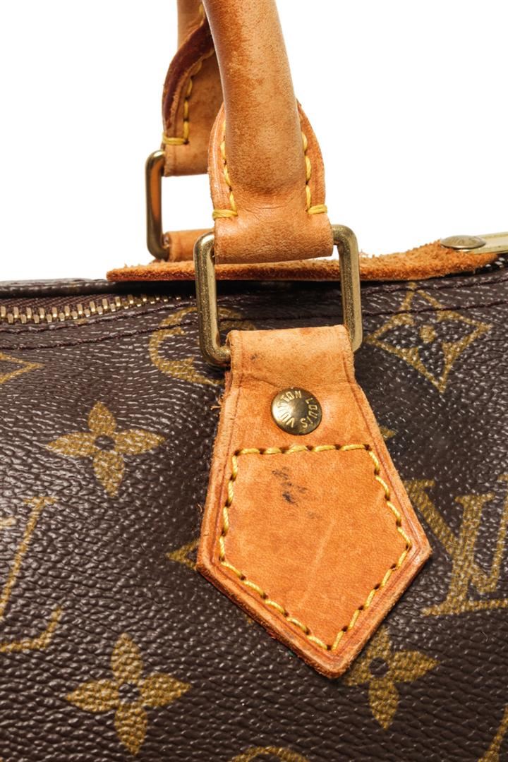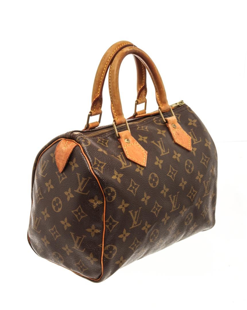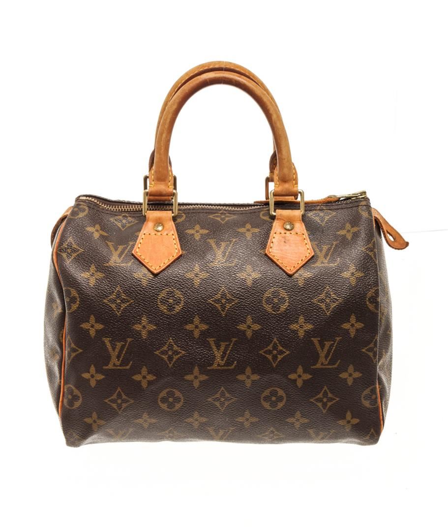 One Louis Vuitton Brown Monogram Speedy 25 Satchel Bag. Item is sold AS-IS. All available information is listed in the description and shown in the photo. Louis Vuitton Brown Monogram Speedy 25 Satchel Bag with gold tone hardware, brown, monogram canvas, vachetta handles and trim, a top zip closure, and an interior pocket. 7.5" L x 9.8" W x 5.9" D, 3.5" drop / 19.05 L x 24.89 W x 14.98 D CM, 8.89 CM drop
