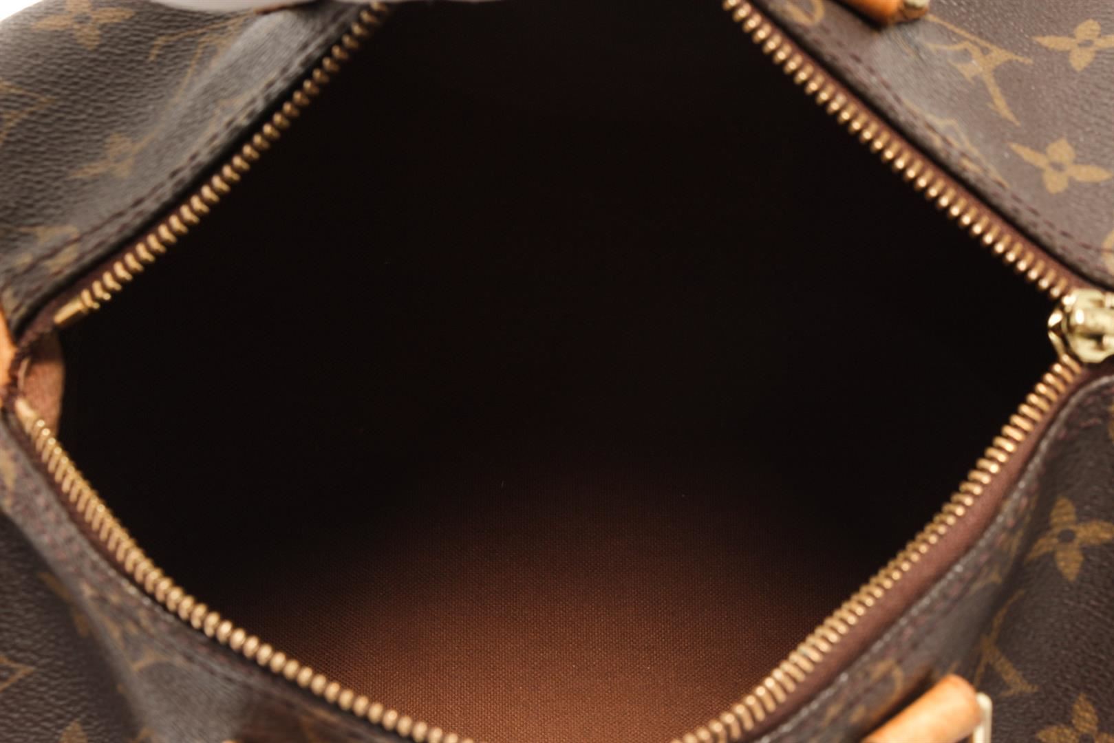 One Louis Vuitton Brown Monogram Speedy 25 Satchel Bag. Item is sold AS-IS. All available information is listed in the description and shown in the photo. Louis Vuitton Brown Monogram Speedy 25 Satchel Bag with brown louis vuitton monogram speedy 25 bag. the speedy 25 features the monogram canvas, vachetta handles and trim, a top zip closure, and an interior pocket. 7.5" L x 9.8" W x 5.9" D, 3.5" drop / 19.05 L x 24.89 W x 14.98 D CM, 8.89 CM drop