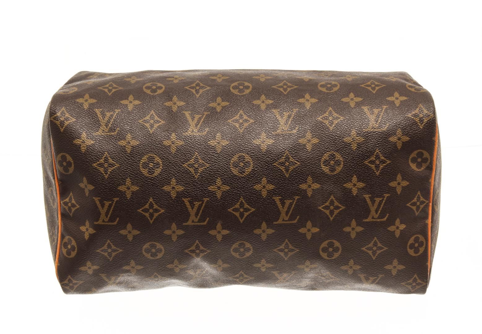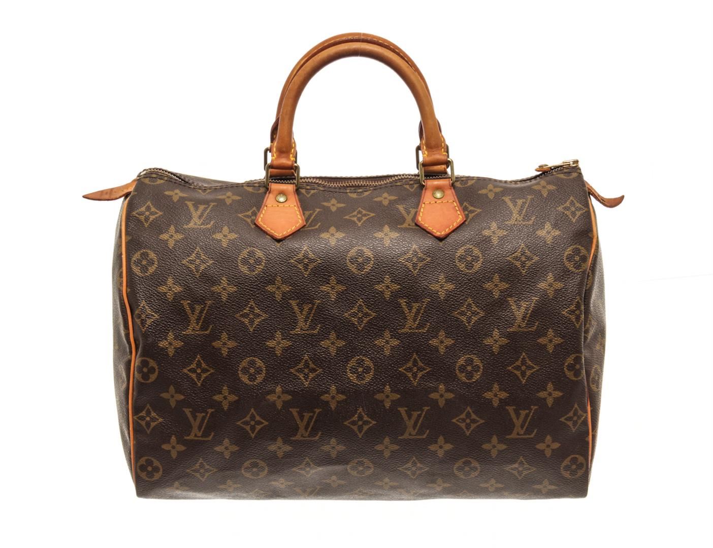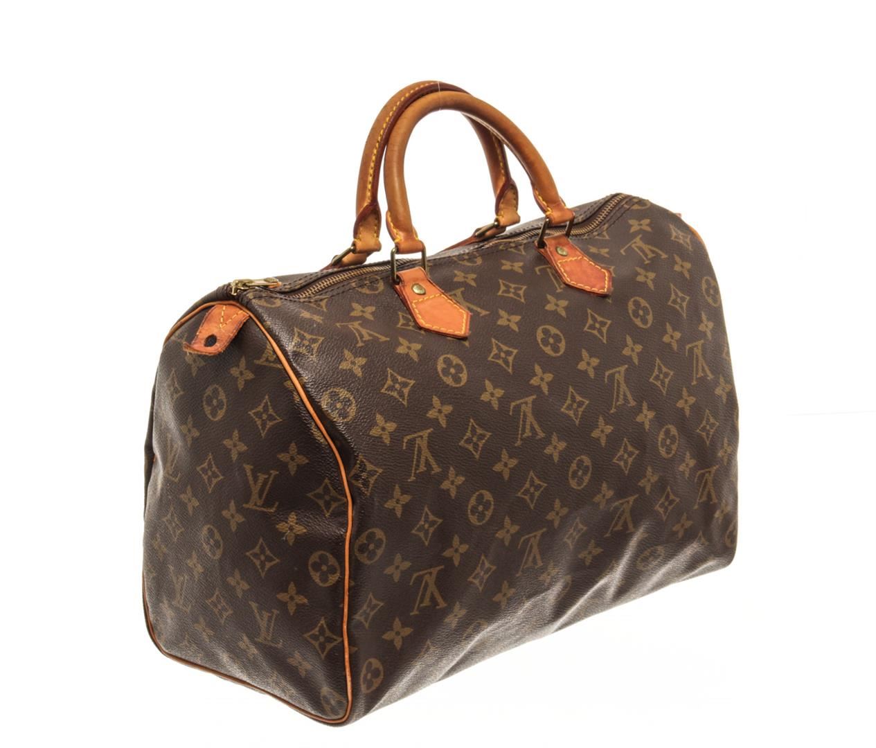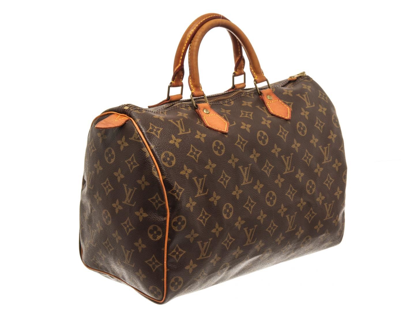 One Louis Vuitton Brown Monogram Speedy 35 Satchel Bag. Item is sold AS-IS. All available information is listed in the description and shown in the photo. Louis Vuitton Brown Monogram Speedy 35 Satchel Bag with brown louis vuitton monogram speedy 35 bag. the speedy 35 features the monogram canvas, vachetta handles and trim, a top zip closure, and an interior pocket. 9.1" L x 13.8" W x 7.1" D, 3.5" drop / 23.11 x 35.05 x 18.03, 8.89 drop