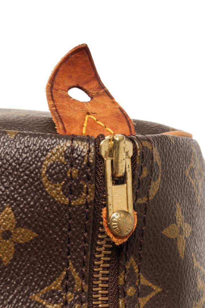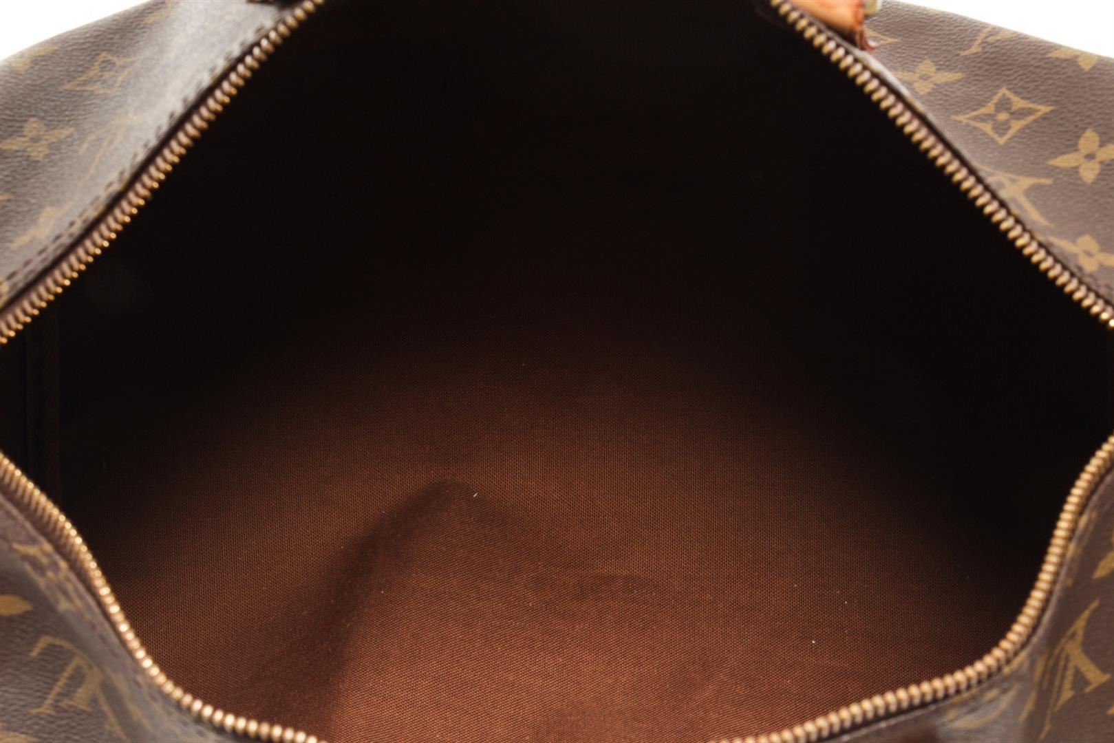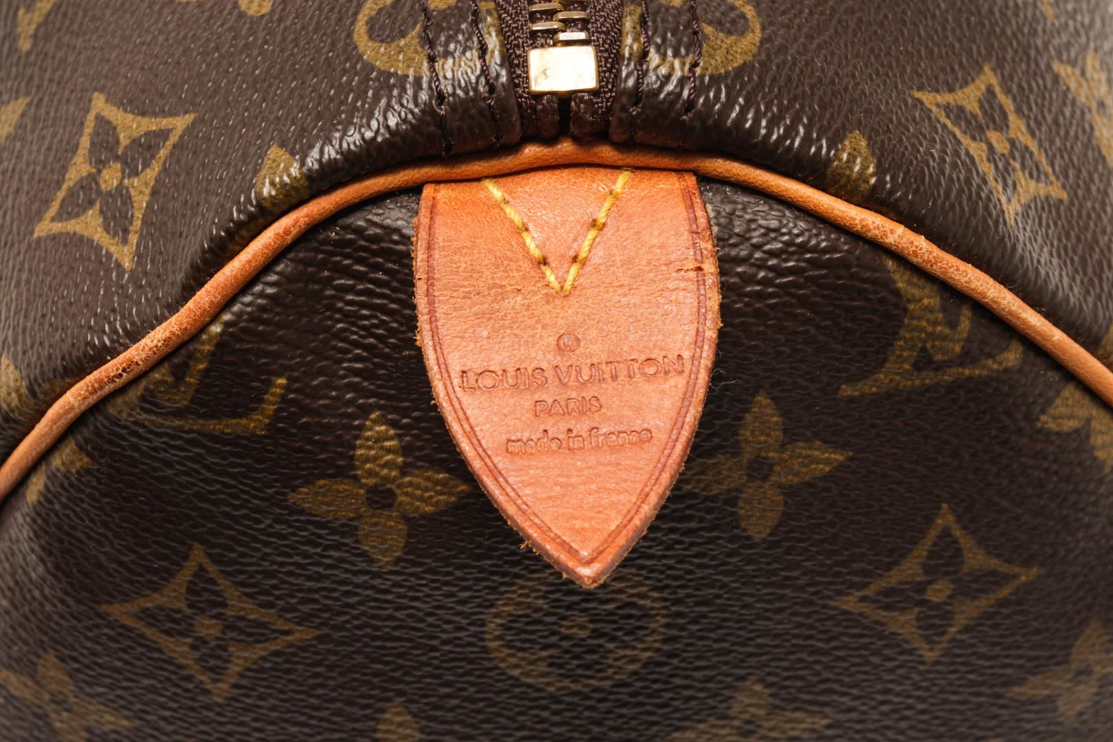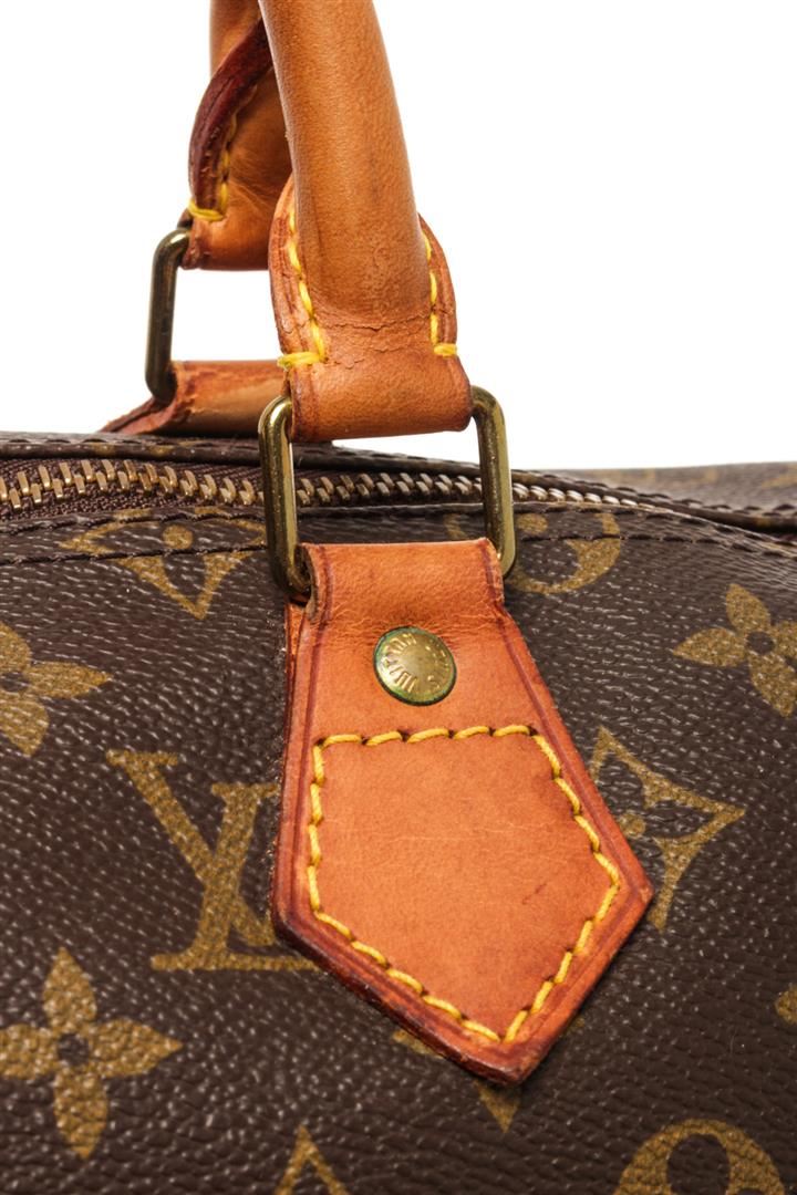 One Louis Vuitton Brown Monogram Speedy 35 Satchel Bag. Item is sold AS-IS. All available information is listed in the description and shown in the photo. Louis Vuitton Brown Monogram Speedy 35 Satchel Bag with brown louis vuitton monogram speedy 35 bag. the speedy 35 features the monogram canvas, vachetta handles and trim, a top zip closure, and an interior pocket. 9.1" L x 13.8" W x 7.1" D, 3.5" drop / 23.11 x 35.05 x 18.03, 8.89 drop