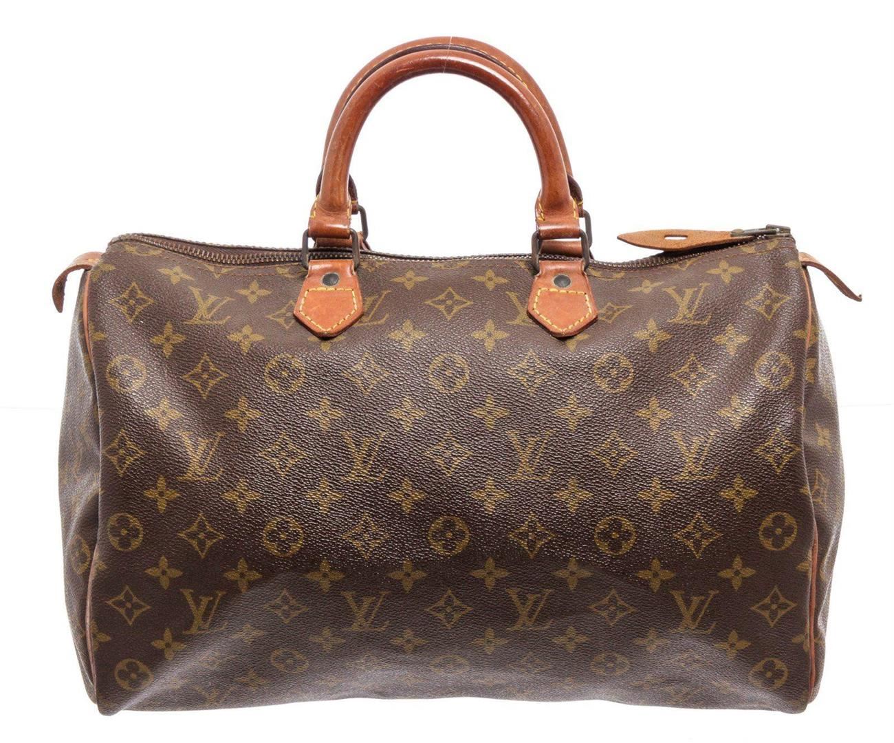 Louis Vuitton Brown Monogram Speedy 35cm Satchel with gold-tone hardware, brown leather trim, exterior zip pockets, interior zip pockets, dual top handle, leather shoulder strap, and zipper closure.     Measurements:  Length: 7.08 in / 18 cm  Width: 9.84 in / 25 cm  13.77 in / 35 cmCONDITION: Pre-Owned Good overall, please see photographs for detail.
