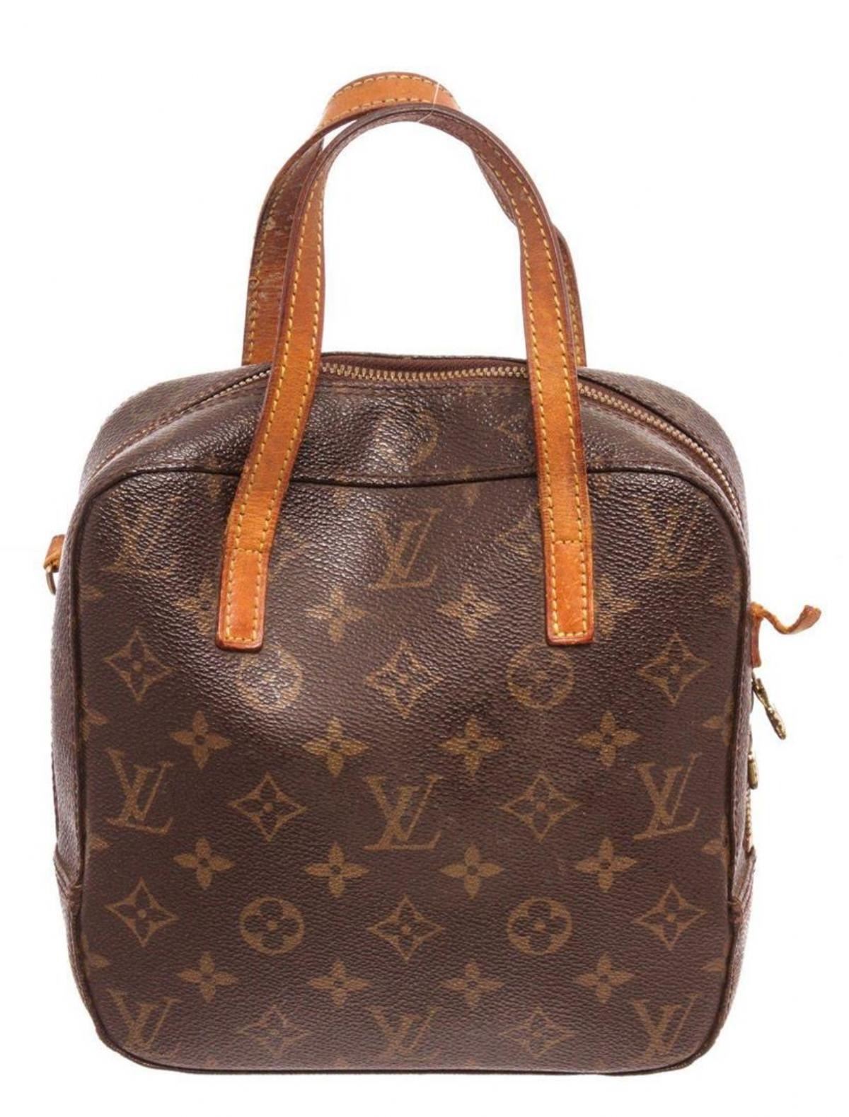 Louis Vuitton Brown Monogram Spontini Satchel Bag with gold-tone hardware, tan vachetta leather trim, interior slip pockets, dual flat top handles, single flat detachable shoulder strap, and zip closure. Please note: broken leather hoop at side. Measurements: Length: 3 in / 8 cm Width: 7.75 in / 20 cm 8 in / 20 cmCONDITION: Pre-Owned Good overall, please see photographs for detail.