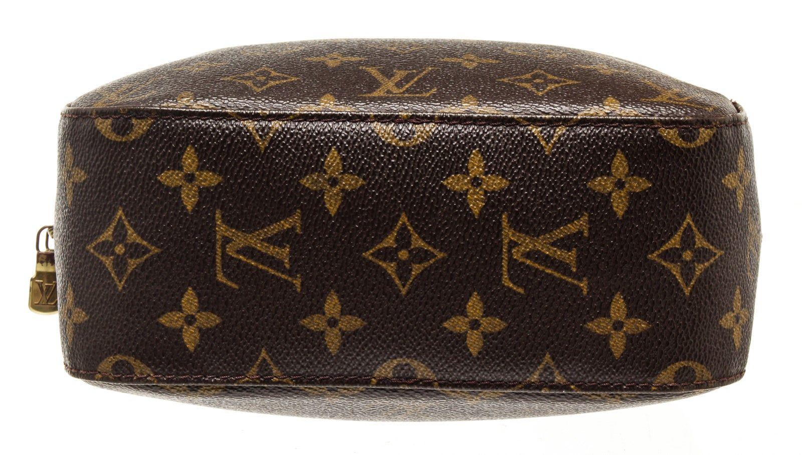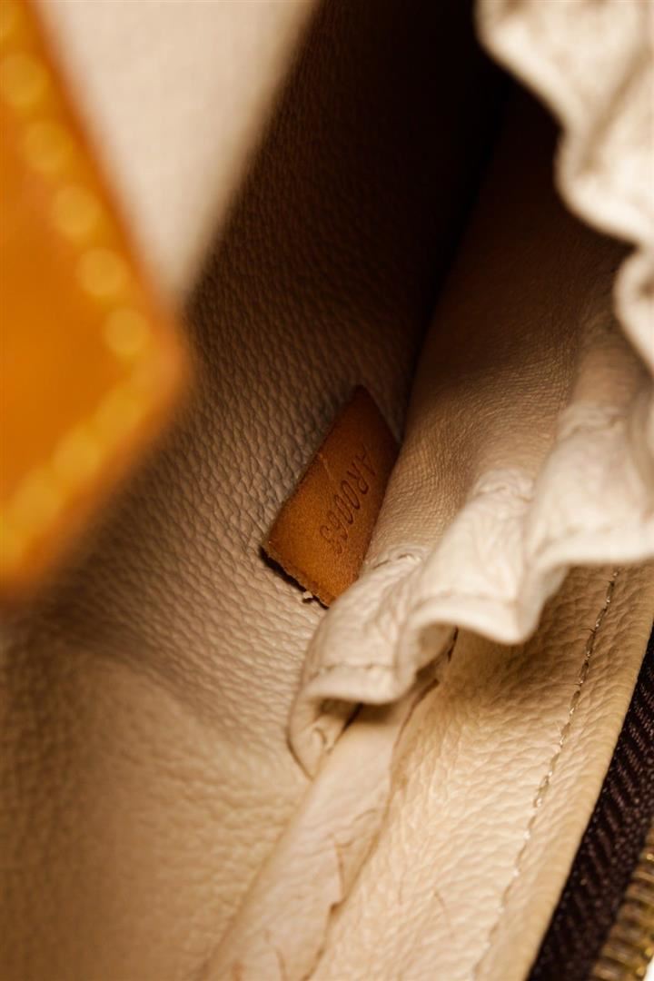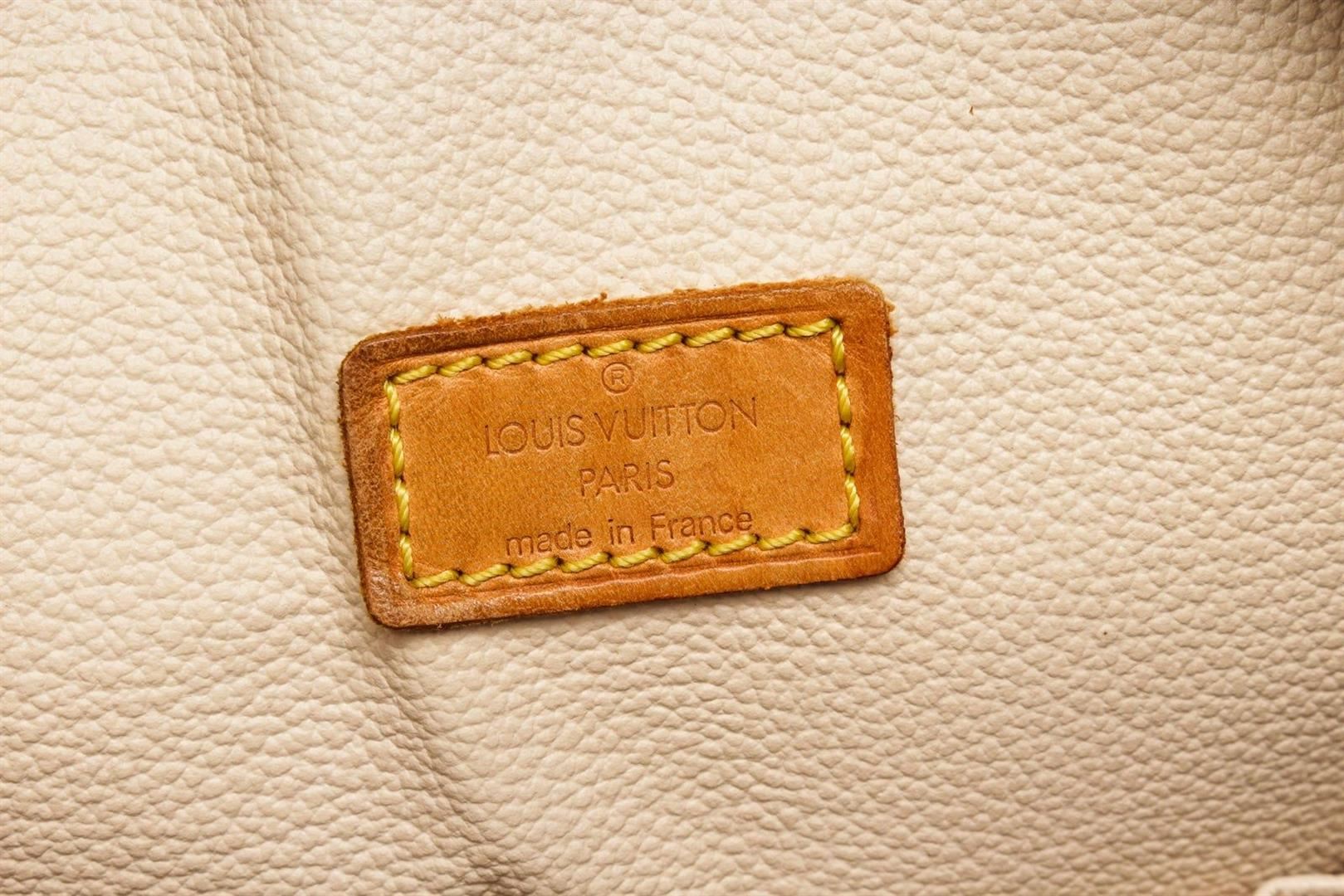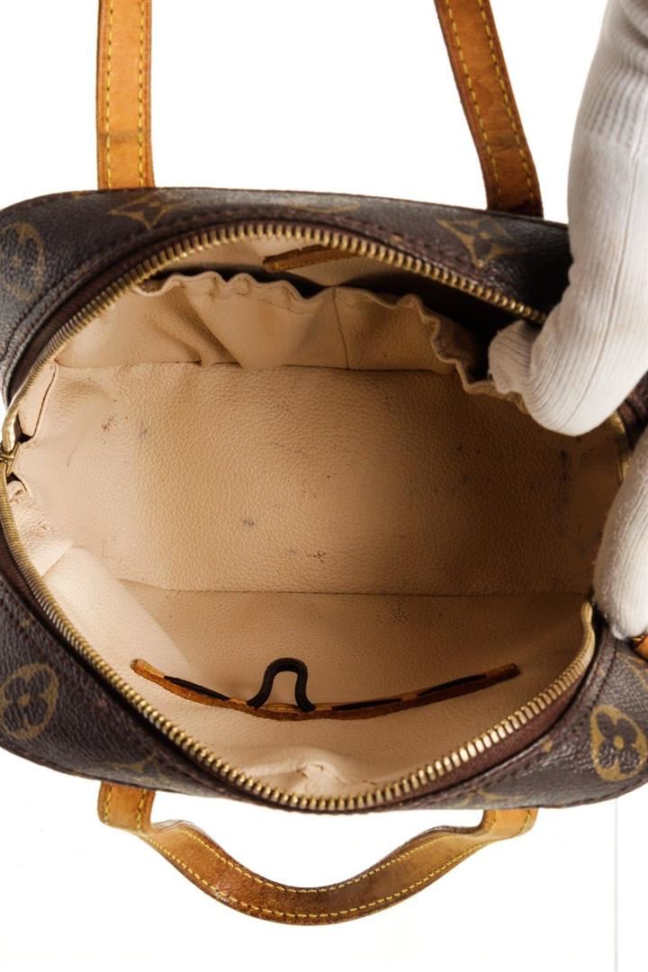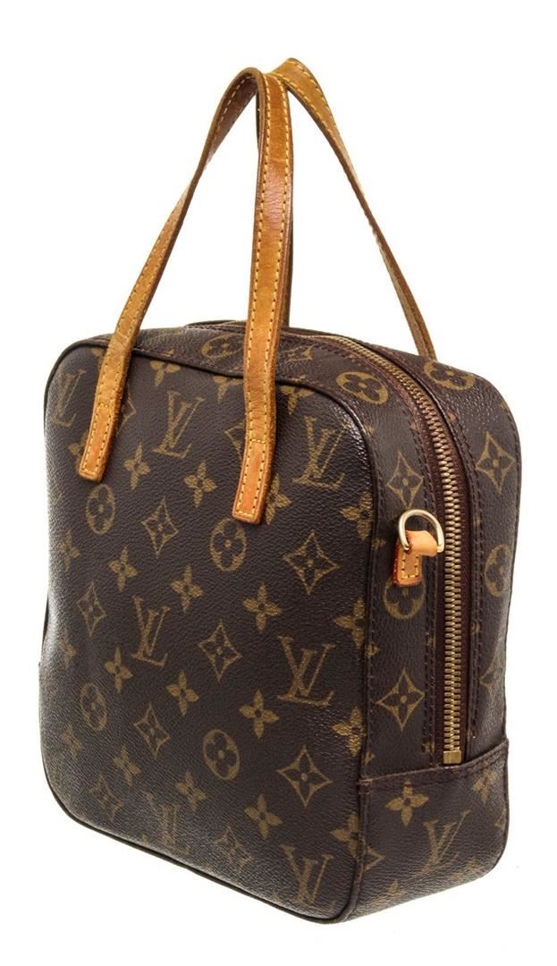Louis Vuitton Brown Monogram Spontini Satchel Bag with monogram canvas, gold-tone hardware, tan vachetta leather trim, interior slip pockets, shoulder strap, and zip closure.