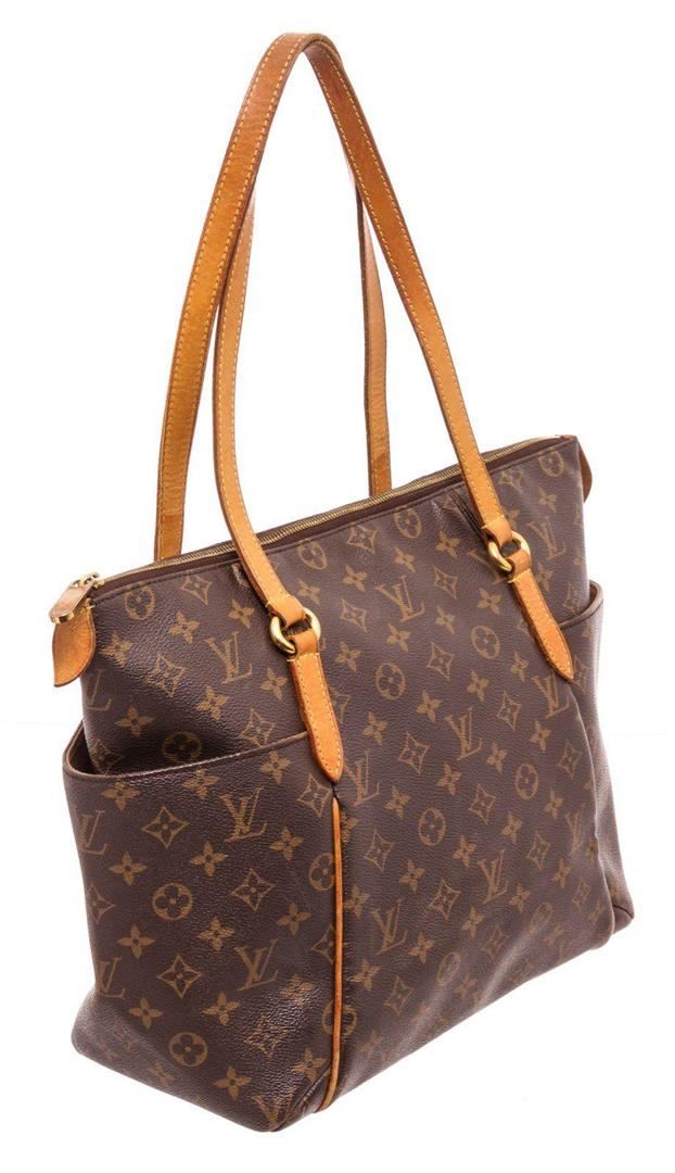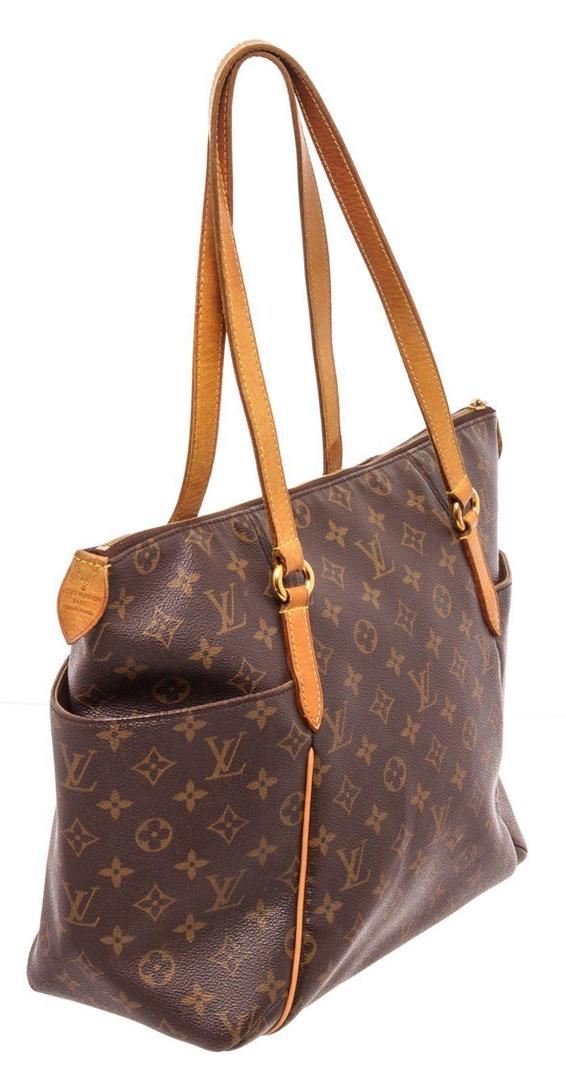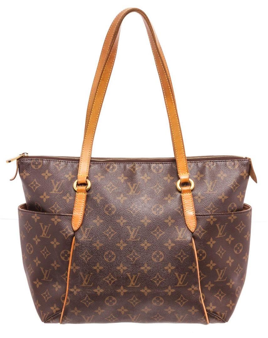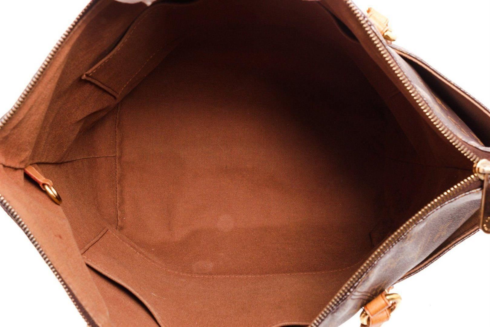 Louis Vuitton Brown Monogram Totally MM Tote Bag with gold-tone hardware, trim tan vachetta leather, interior slpi pocket, shoulder strap and zipper closure.