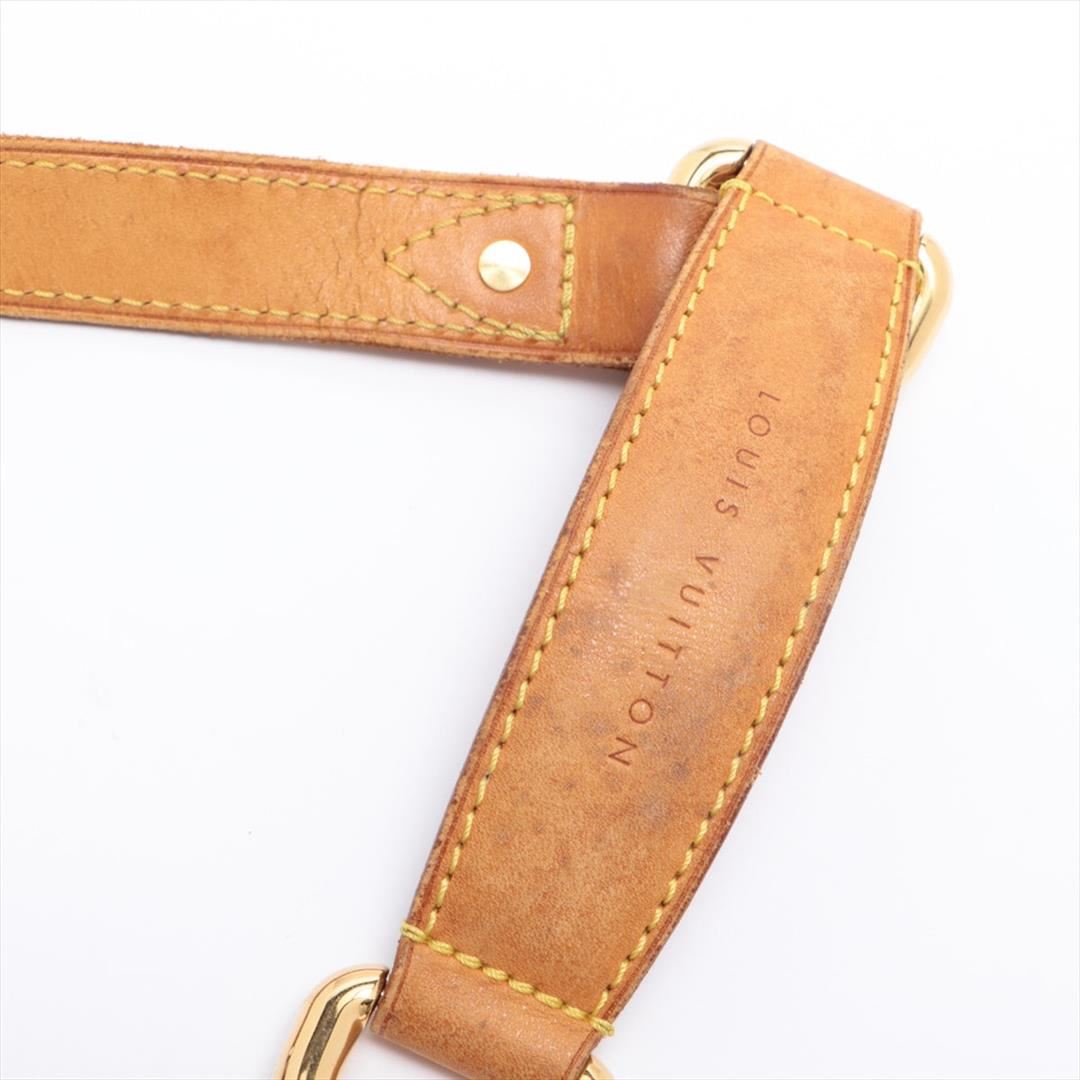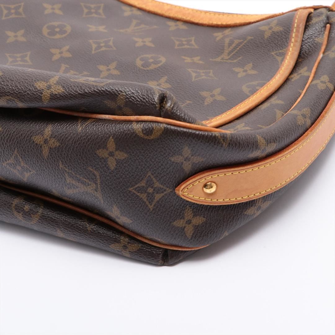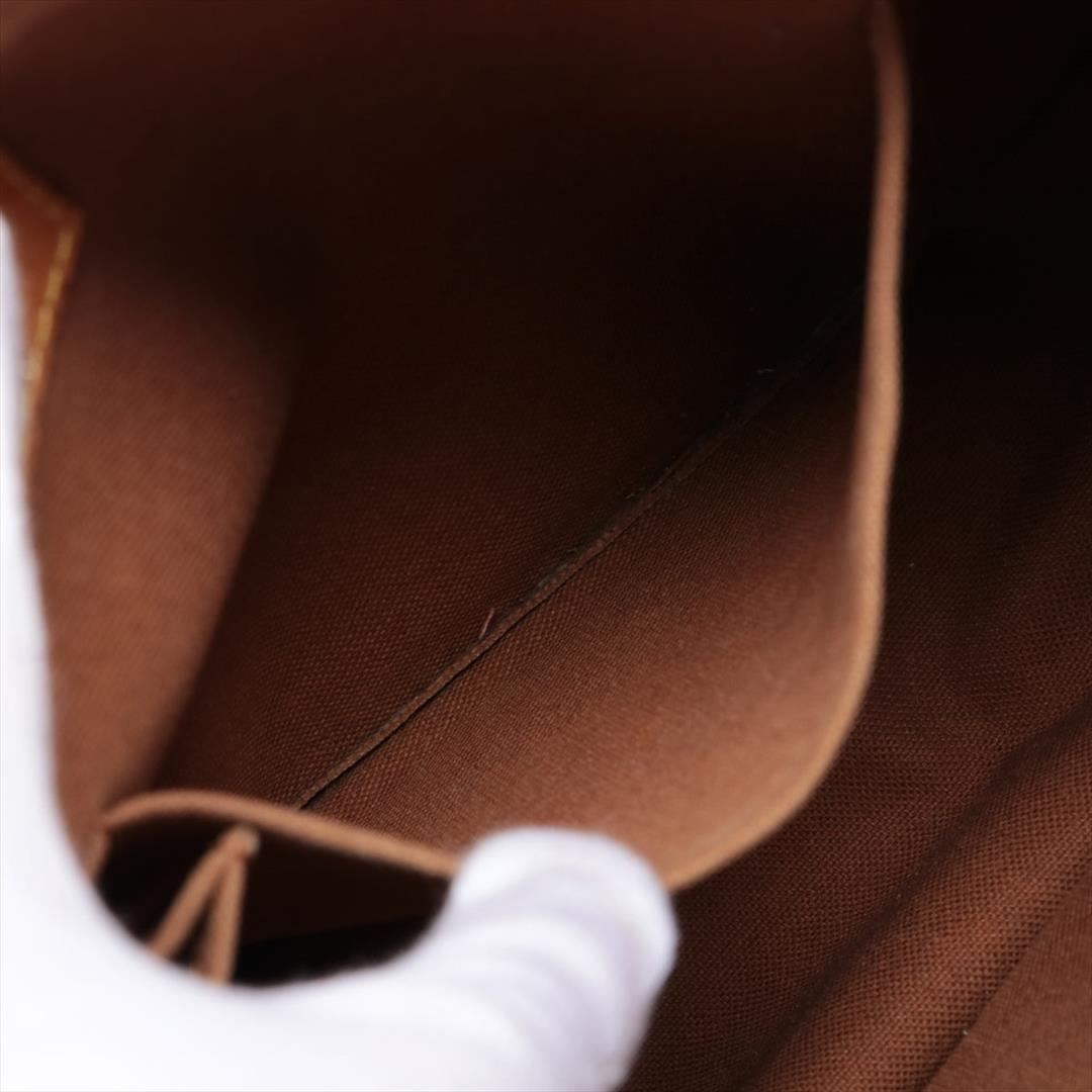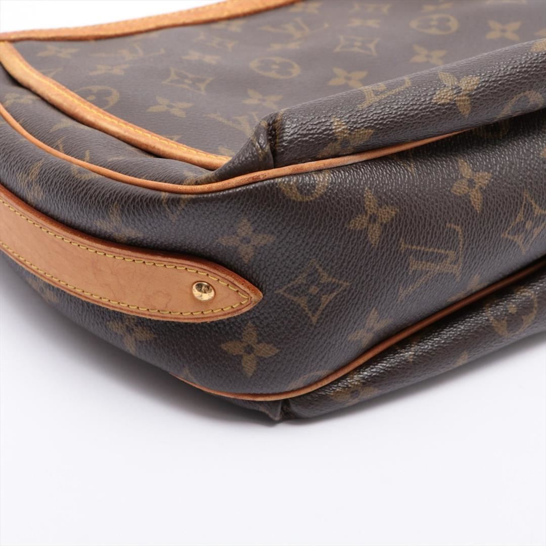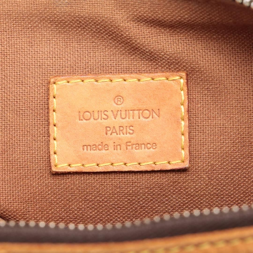 Brown and tan monogram coated canvas Louis Vuitton Tulum PM with brass hardware, tan vachetta leather accents, adjustable flat shoulder strap, single exterior pocket with brass turn lock, brown coated canvas interior, dual interior compartments, and zip c