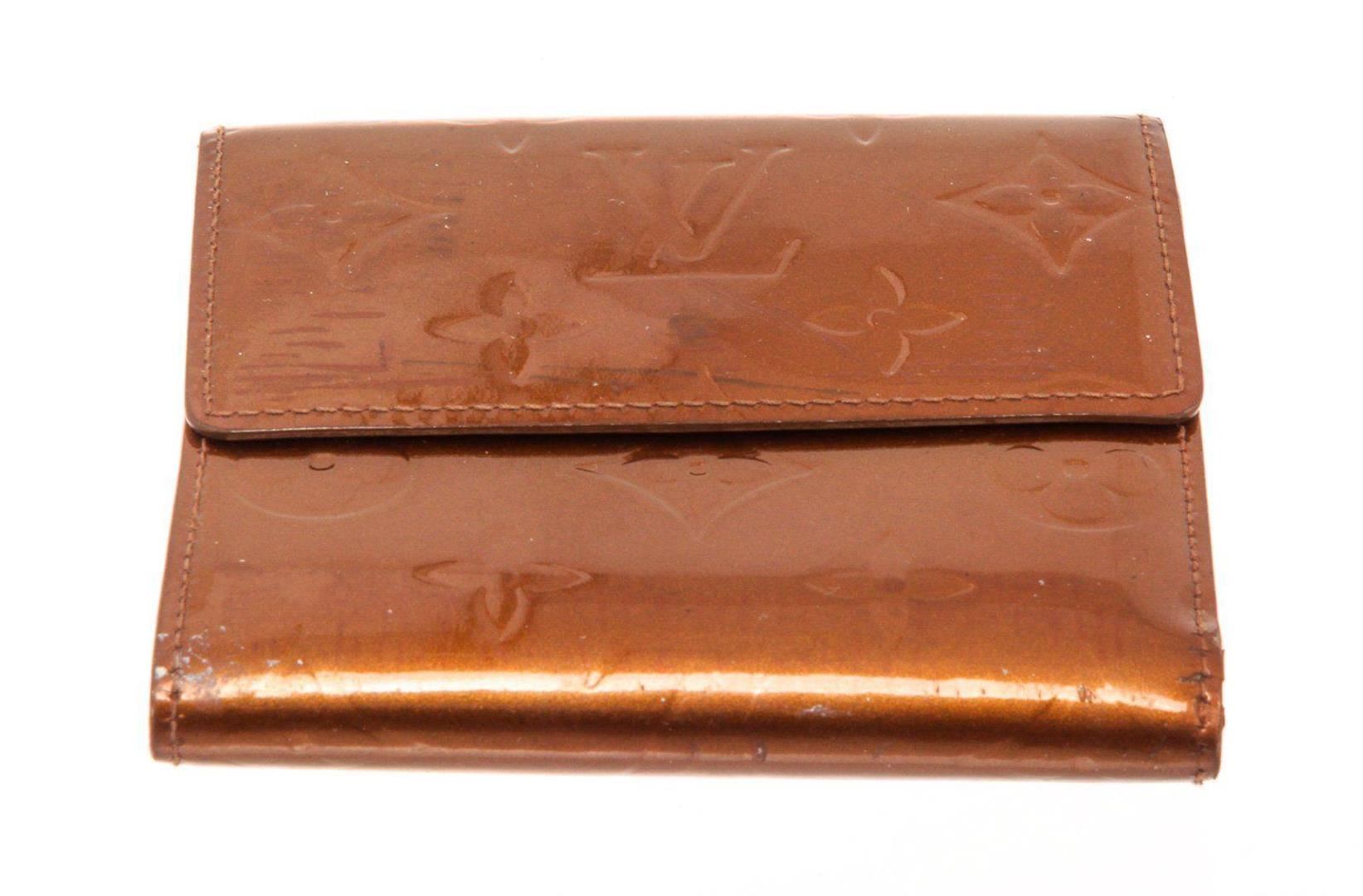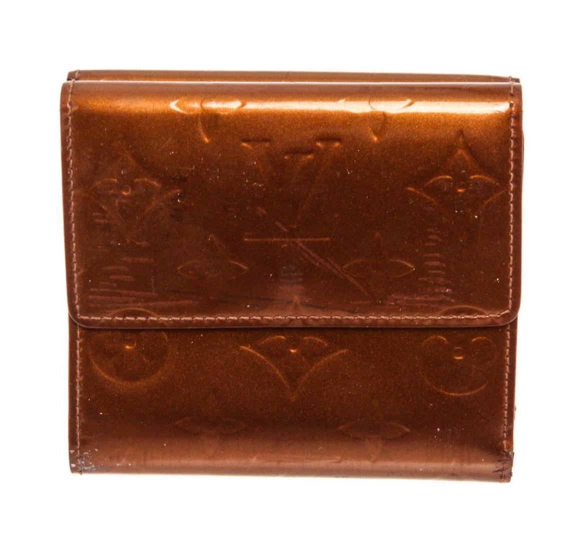 Louis Vuitton Brown Monogram Vernis Leather Elise Sarah Wallet with material monogram vernis leather, gold-tone hardware, trim tan vachetta, interior cardholder pocket and snap closure. MEASUREMENTS: Length 0.5 in / 1 cm Width 4.25 in / 11 cm Height 4 in / 10 cm Condition: Pre-Owned Good overall, please see photographs for detail.