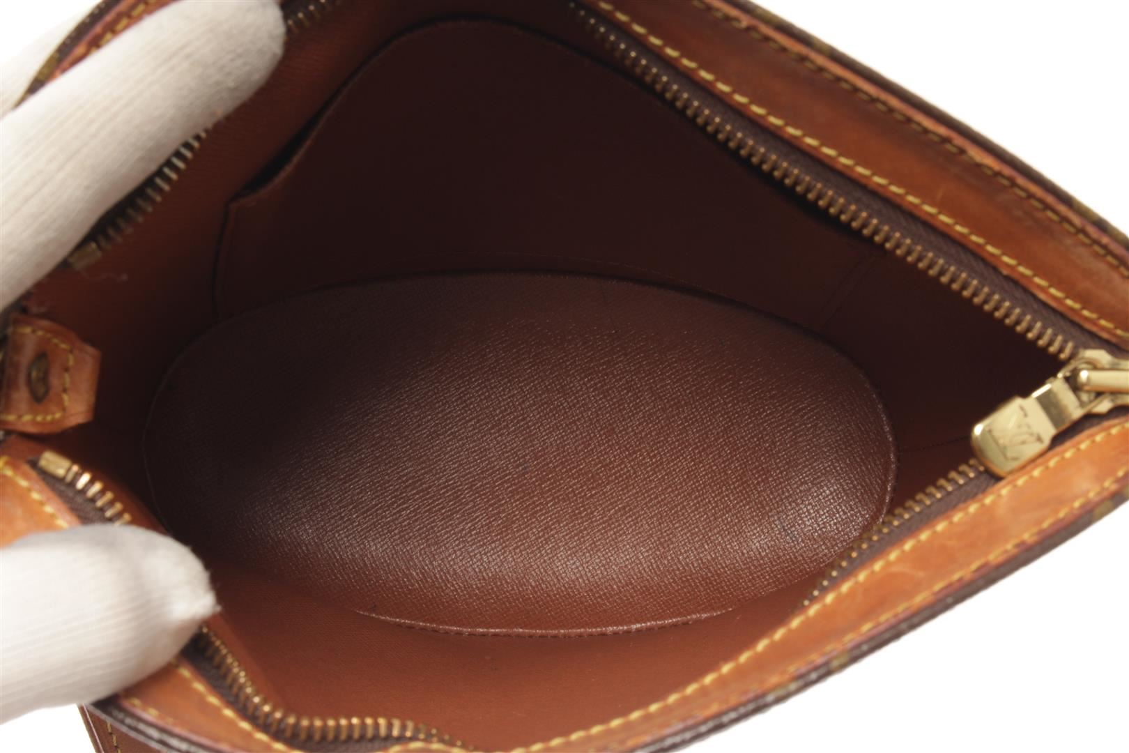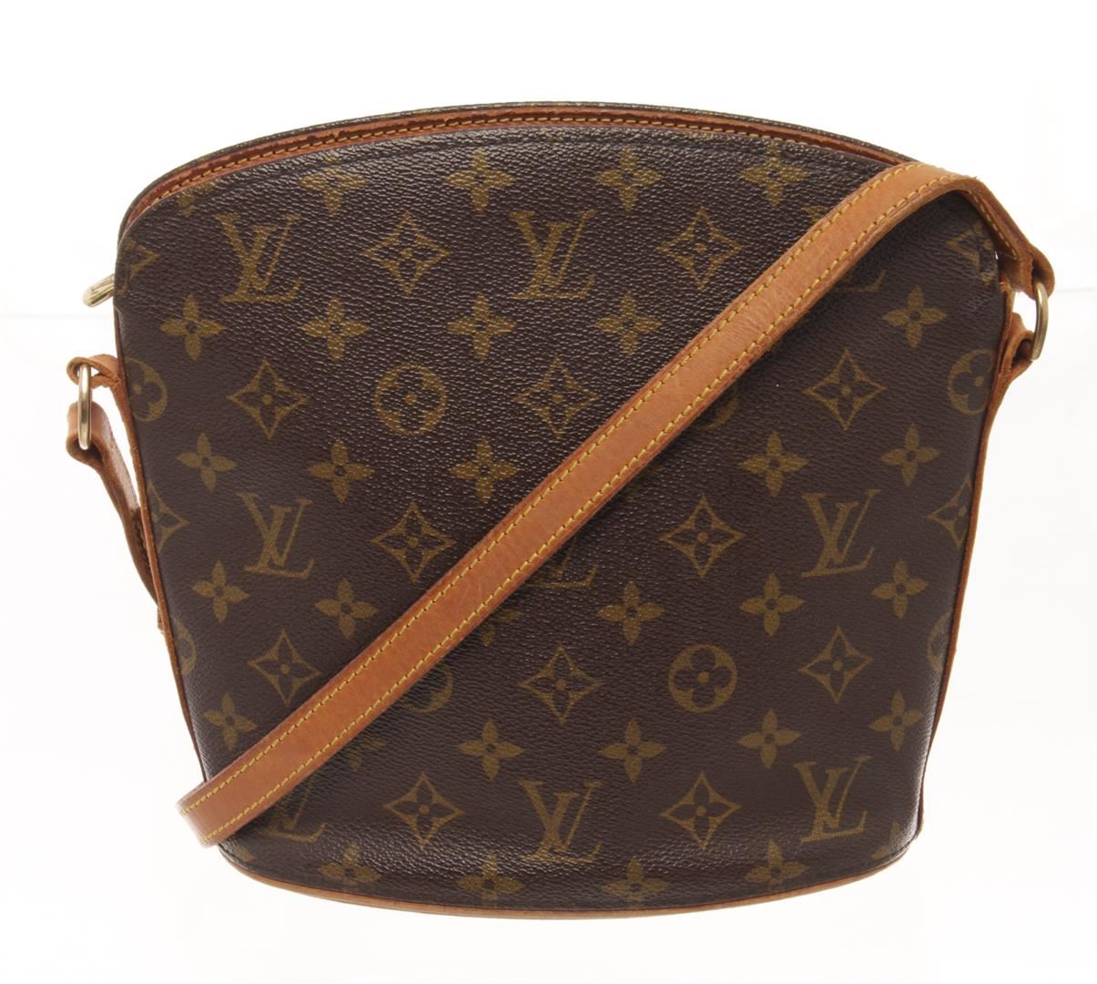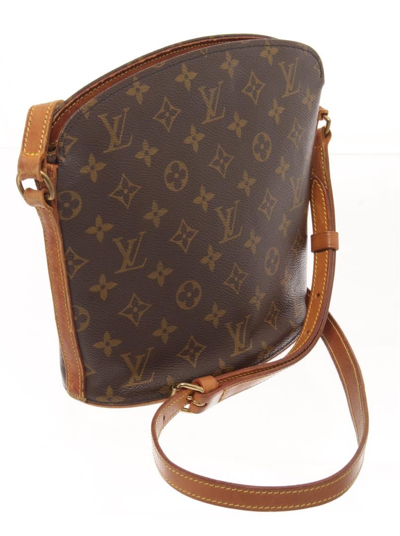 One Louis Vuitton Brown Monogram canvas Drouot Crossbody Bag. Item is sold AS-IS. All available information is listed in the description and shown in the photo. Louis Vuitton Brown Monogram canvas Drouot Crossbody Bag with adjustable shoulder strap, leather lining, interior slip pocket, gold tone hardware, zipper closure. There are some wear and water stains on the vachetta. Please refer to photos. Depth 3.9 in, Height 8.7 in, Width 9.4 in / Depth 10 cm, Height 22 cm, Width 24 cm