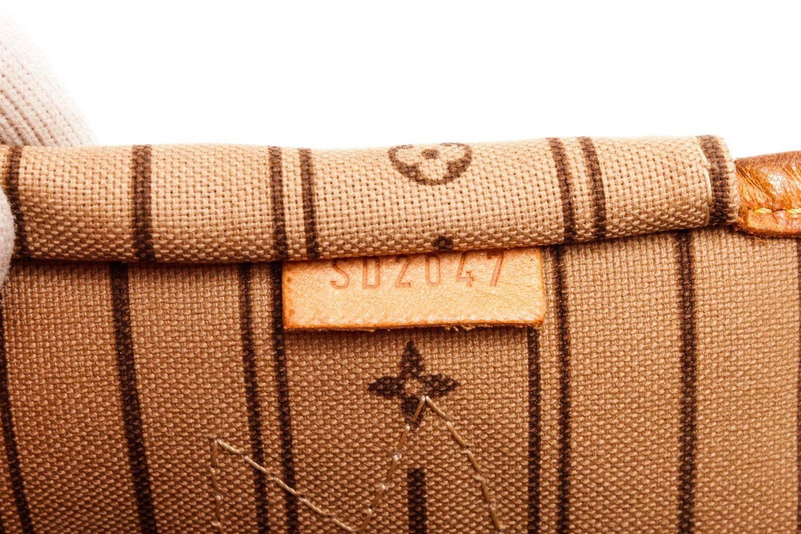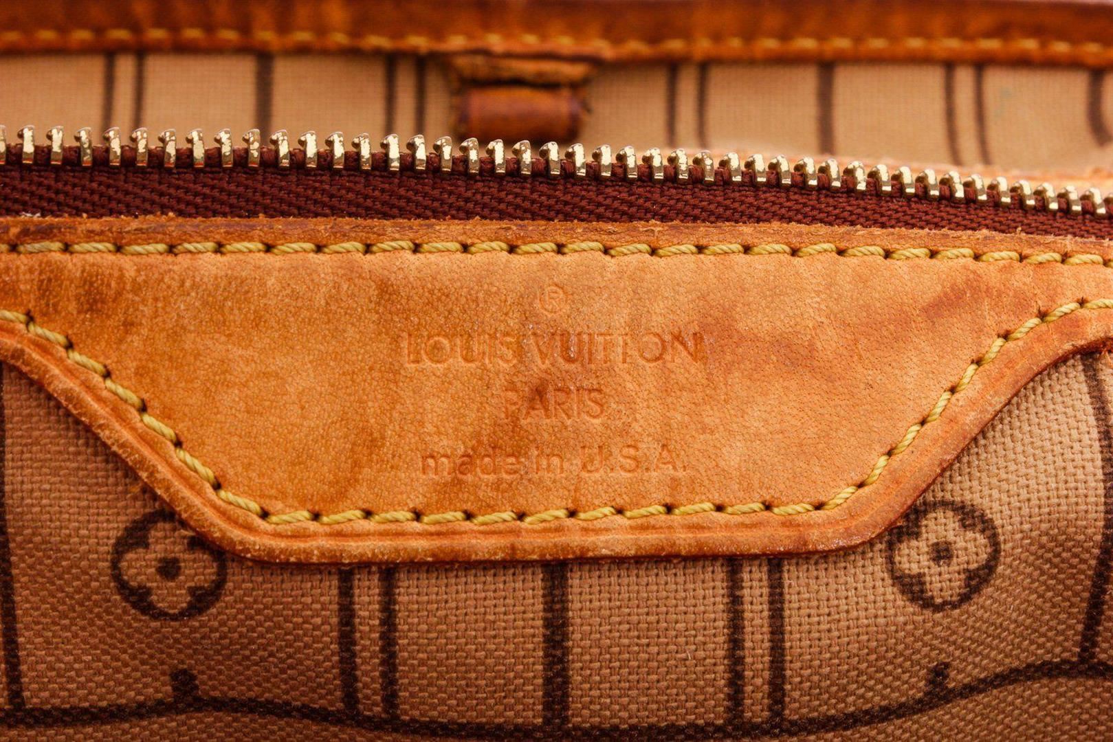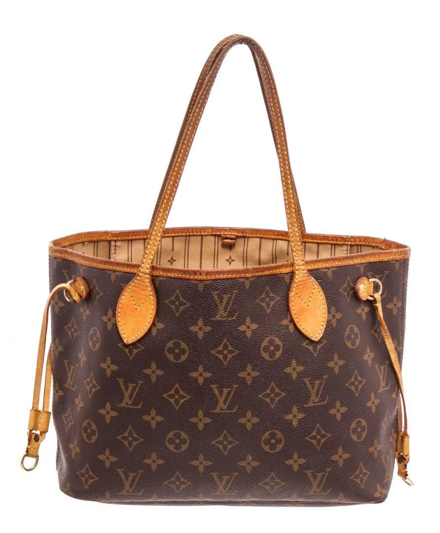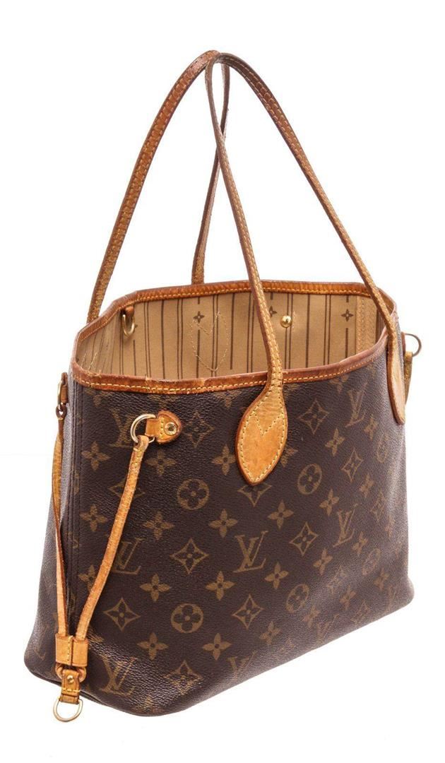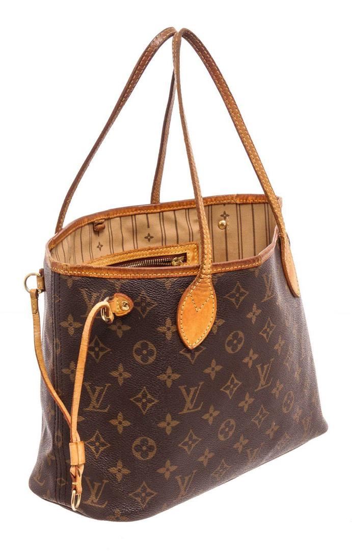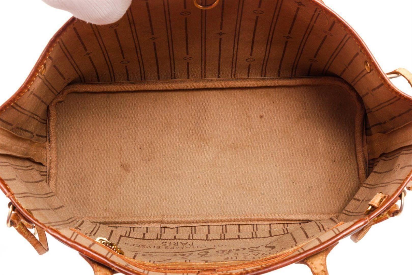 Louis Vuitton Brown Neverfull PM Tote Bag with gold-tone hardware, trim tan vachetta leather, interior zip pocket, dual top handle, shoulder straps and flap closure.