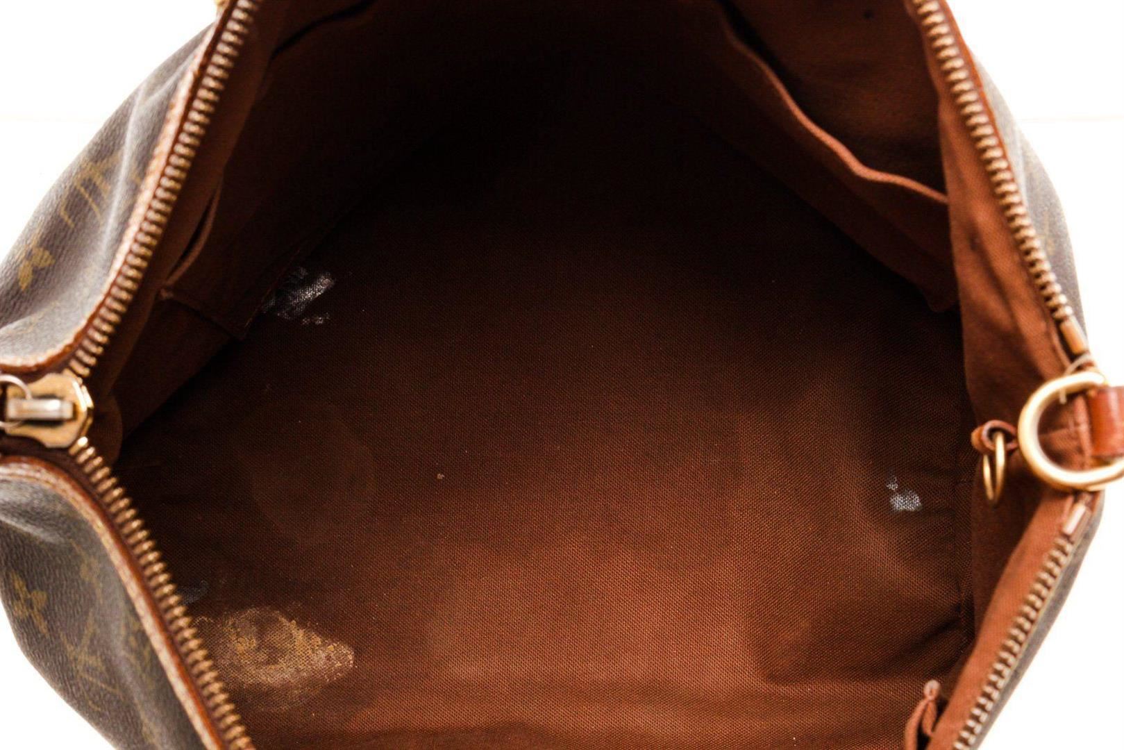 Louis Vuitton Brown Palermo PM Tote Bag with monogram canvas, gold-tone hardware, trim tan vachetta leather, interior slip pocket, canvas lining, shoulder strap and zipper closure.