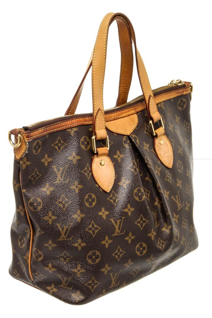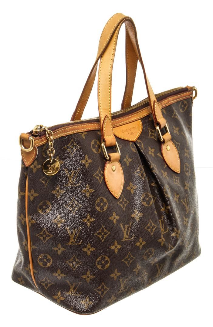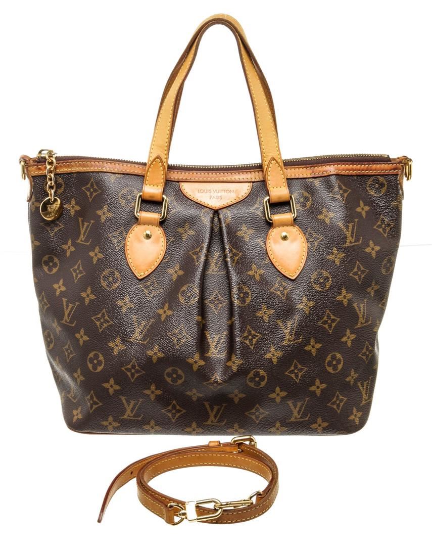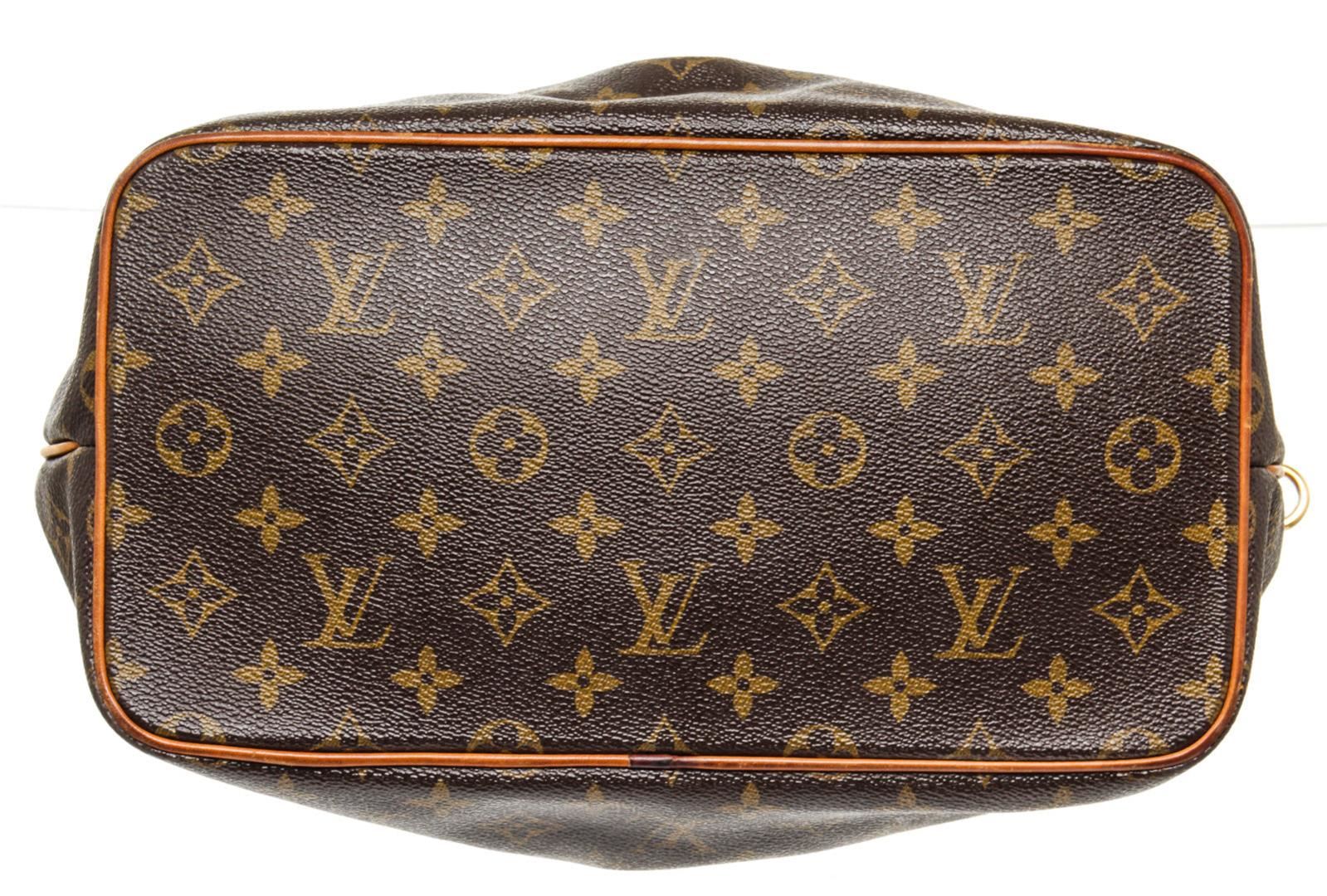 Louis Vuitton Brown Palermo PM Tote Bag with monogram canvas, gold-tone hardware, trim tan vachetta leather, interior slip pocket, canvas lining, shoulder strap and zipper closure.