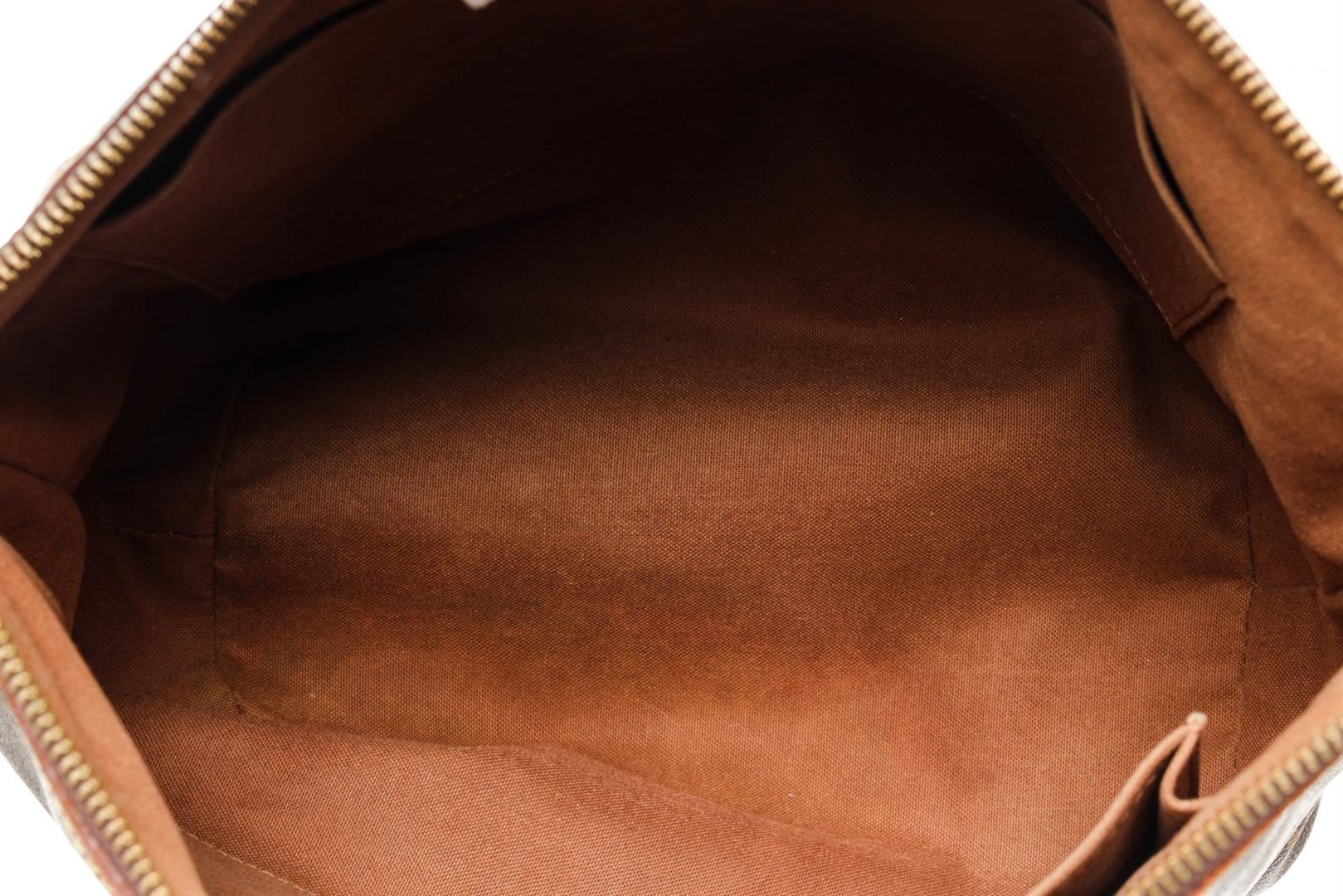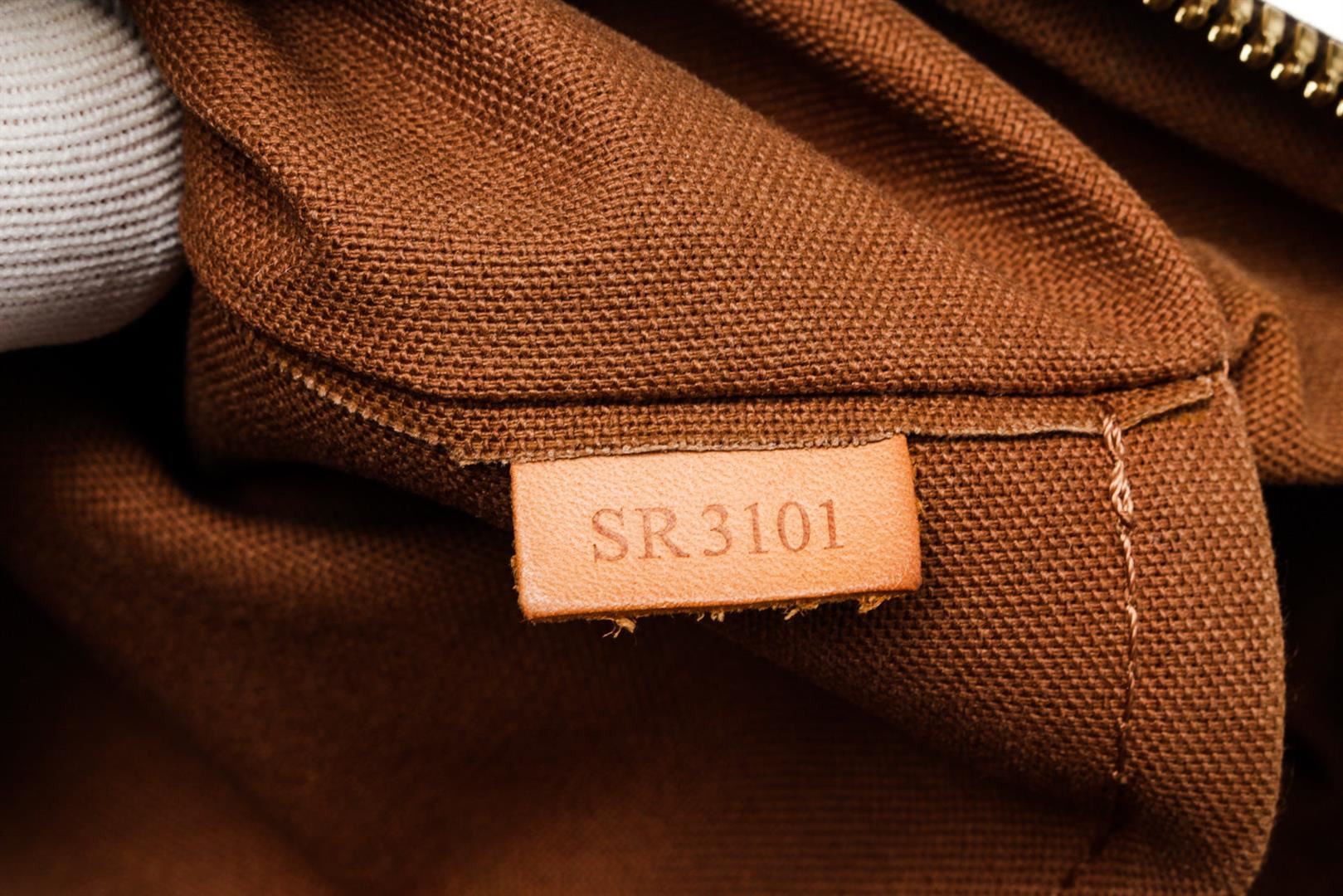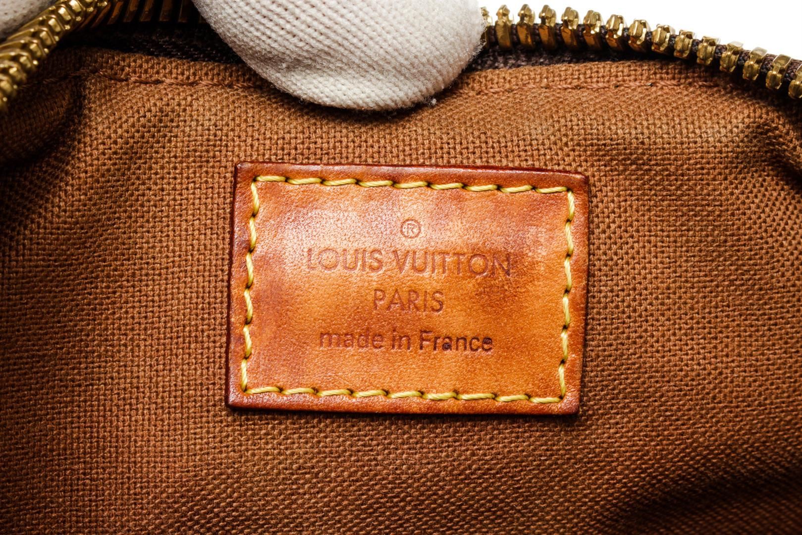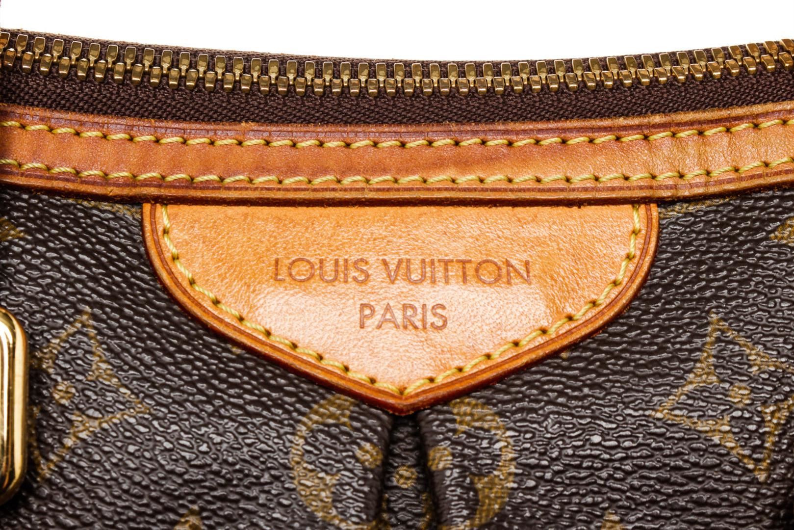 Louis Vuitton Brown Palermo PM Tote Bag with monogram canvas, gold-tone hardware, trim tan vachetta leather, interior slip pocket, canvas lining, shoulder strap and zipper closure.