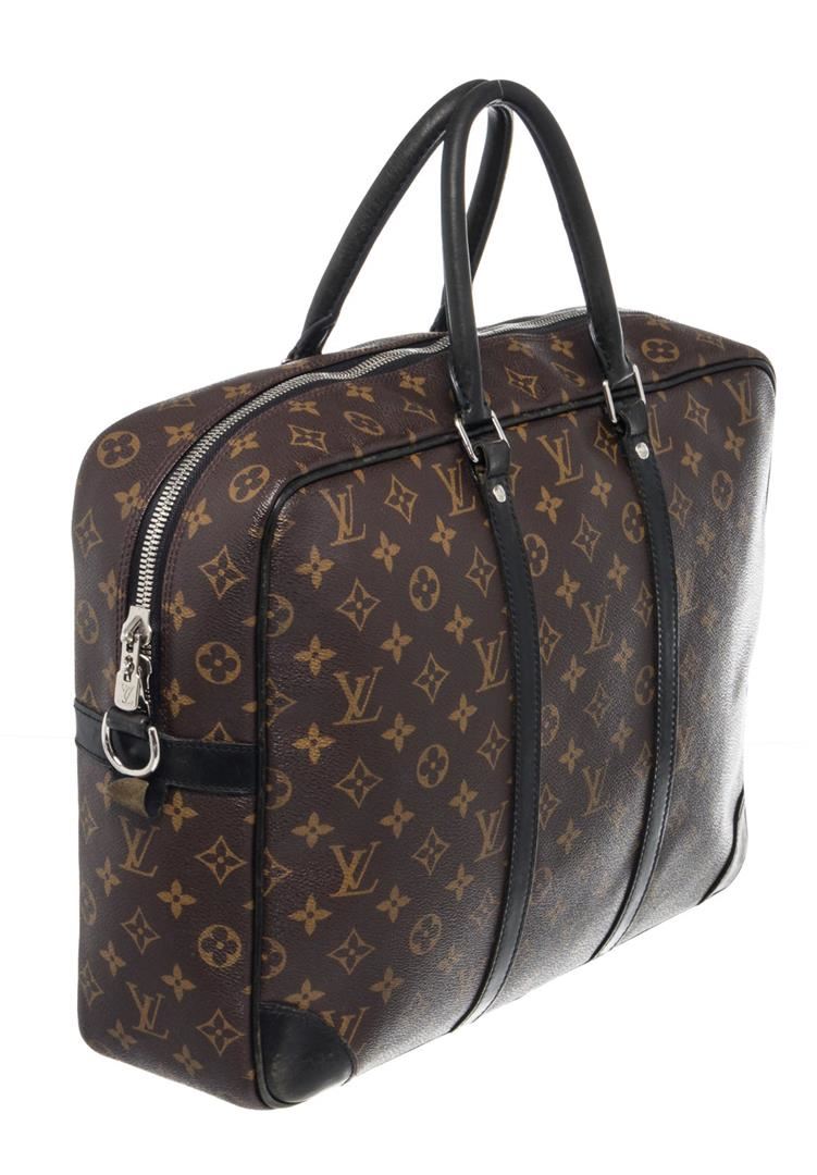 Louis Vuitton Brown Porte Document Voyage Briefcases with monogram canvas gold-tone hardware, trim tan vachetta leather, interior three pocket, canvas lining, dual top handle and zipper closure.