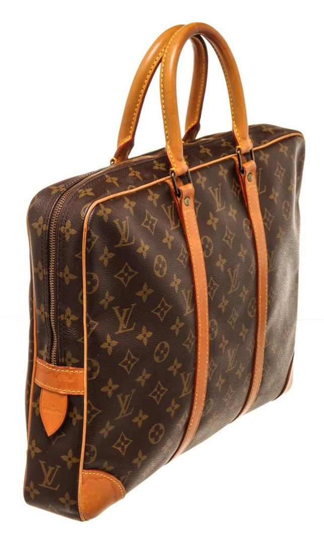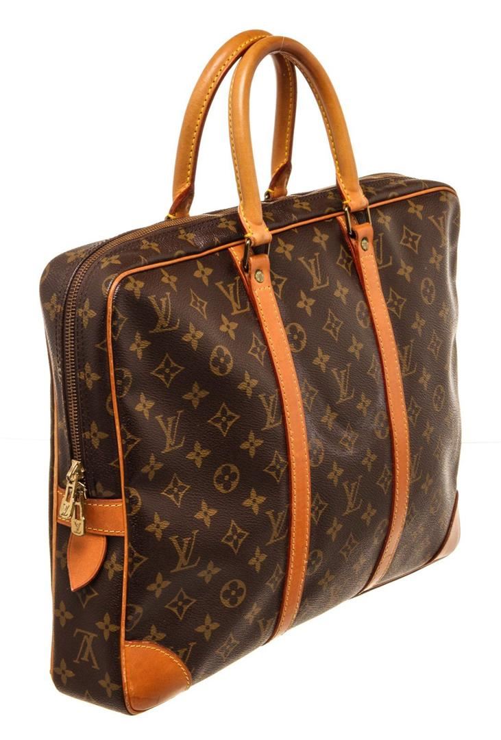 Louis Vuitton Brown Porte Document Voyage Briefcases with material monogram canvas gold-tone hardware, trim tan vachetta leather, interior three pocket, canvas lining, dual top handle and zipper closure.