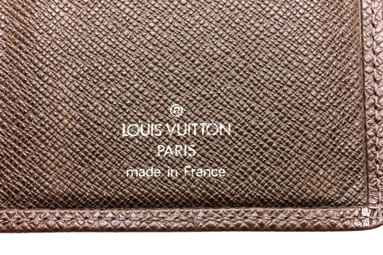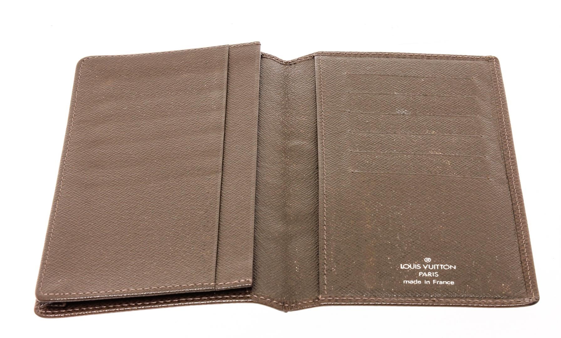 Brown Taiga leather Louis Vuitton Checkbook Cover with debossed logo accent at front, tonal Taiga leather lining, foil-stamped logo accent, three interior slit compartments, six card slots and bifold closure.