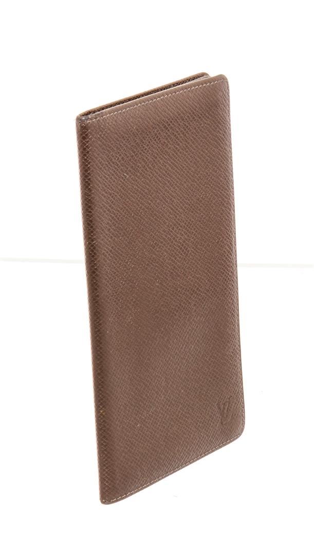 Brown Taiga leather Louis Vuitton Checkbook Cover with debossed logo accent at front, tonal Taiga leather lining, foil-stamped logo accent, three interior slit compartments, six card slots and bifold closure.