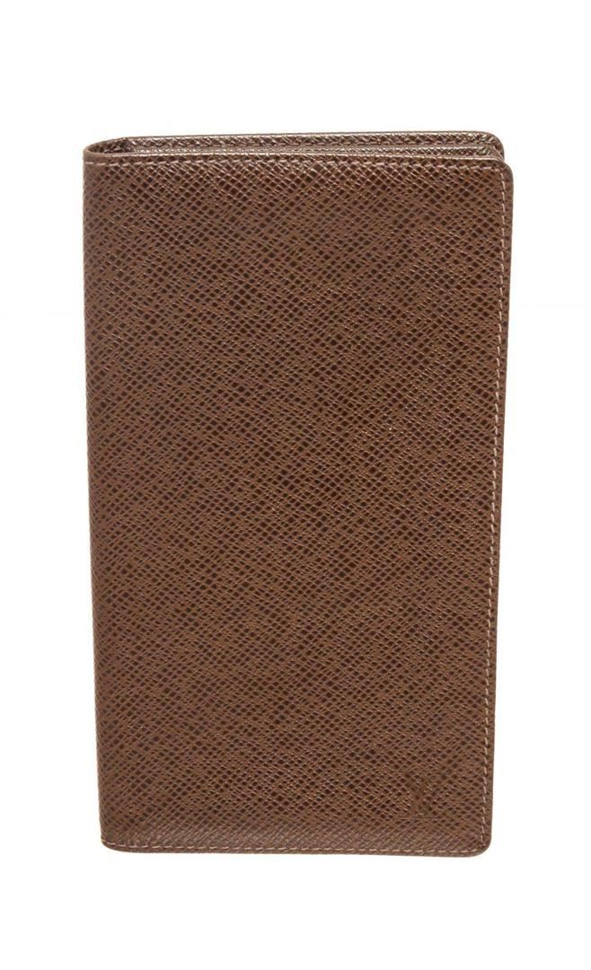 Louis Vuitton Brown Taiga Leather Wallet with gold-tone hardware, tan vachetta leather trim, interior flap pockets, leather lining, adjustable strap, and flap closure. CONDITION: Pre-Owned Good overall, please see photographs for detail.