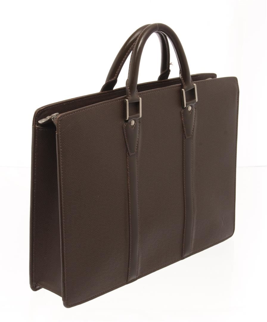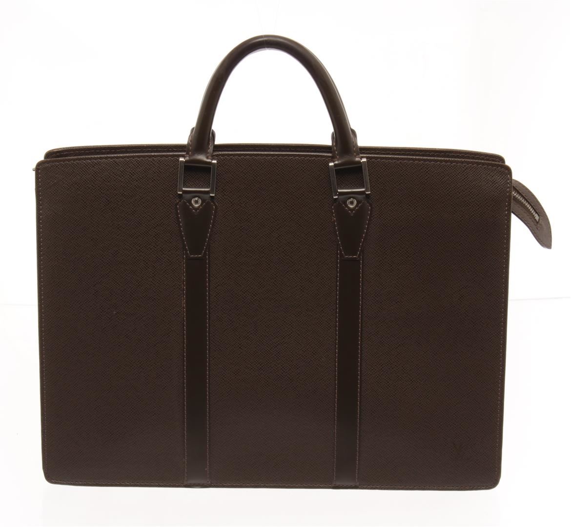 One Louis Vuitton Brown Taiga Leather Porte Document Briefcase. Item is sold AS-IS. All available information is listed in the description and shown in the photo. louis vuitton brown taiga leather porte document briefcase with silver hardware, brown leather handles, interior pockets to hold documents, and a zipper closure. Height: 30.5 cm (12.01 in), Width: 8 cm (3.15 in), Length: 41 cm (16.15 in)