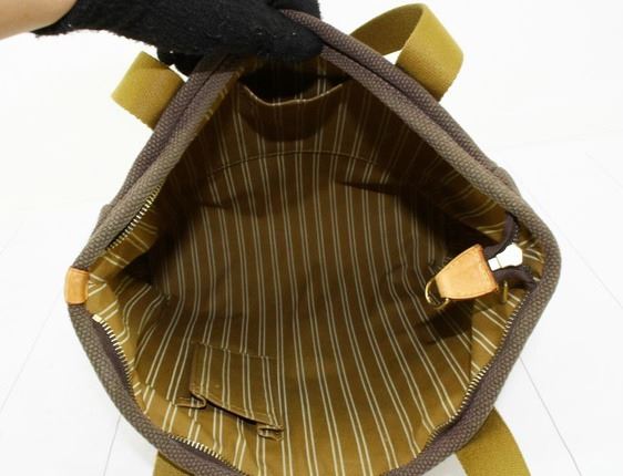 Brown Toile canvas Louis Vuitton Cabas Antigua MM tote bag with gold-tone hardware, dual shoulder straps, green poplin lining & single interior pocket with card slots and zip closure at top. Height: 11" Width: 11" Depth: 3.5" Shoulder Strap Drop: 8.5"