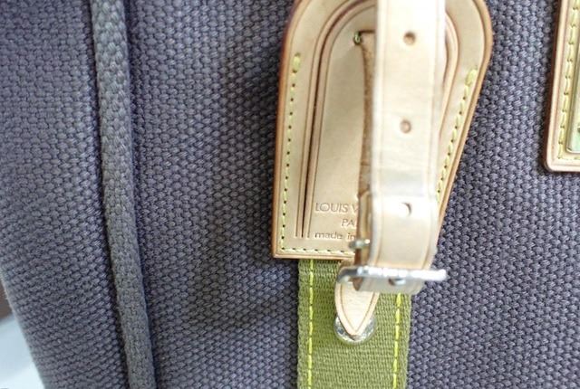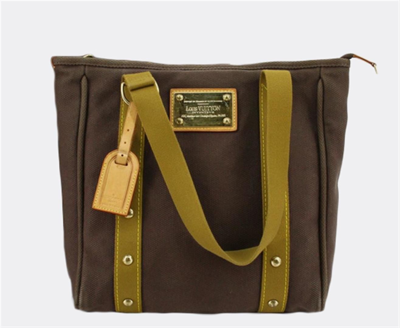 Brown Toile canvas Louis Vuitton Cabas Antigua MM tote bag with gold-tone hardware, dual shoulder straps, green poplin lining & single interior pocket with card slots and zip closure at top. Height: 11" Width: 11" Depth: 3.5" Shoulder Strap Drop: 8.5"