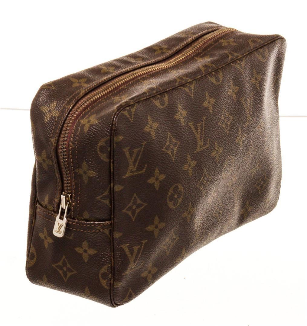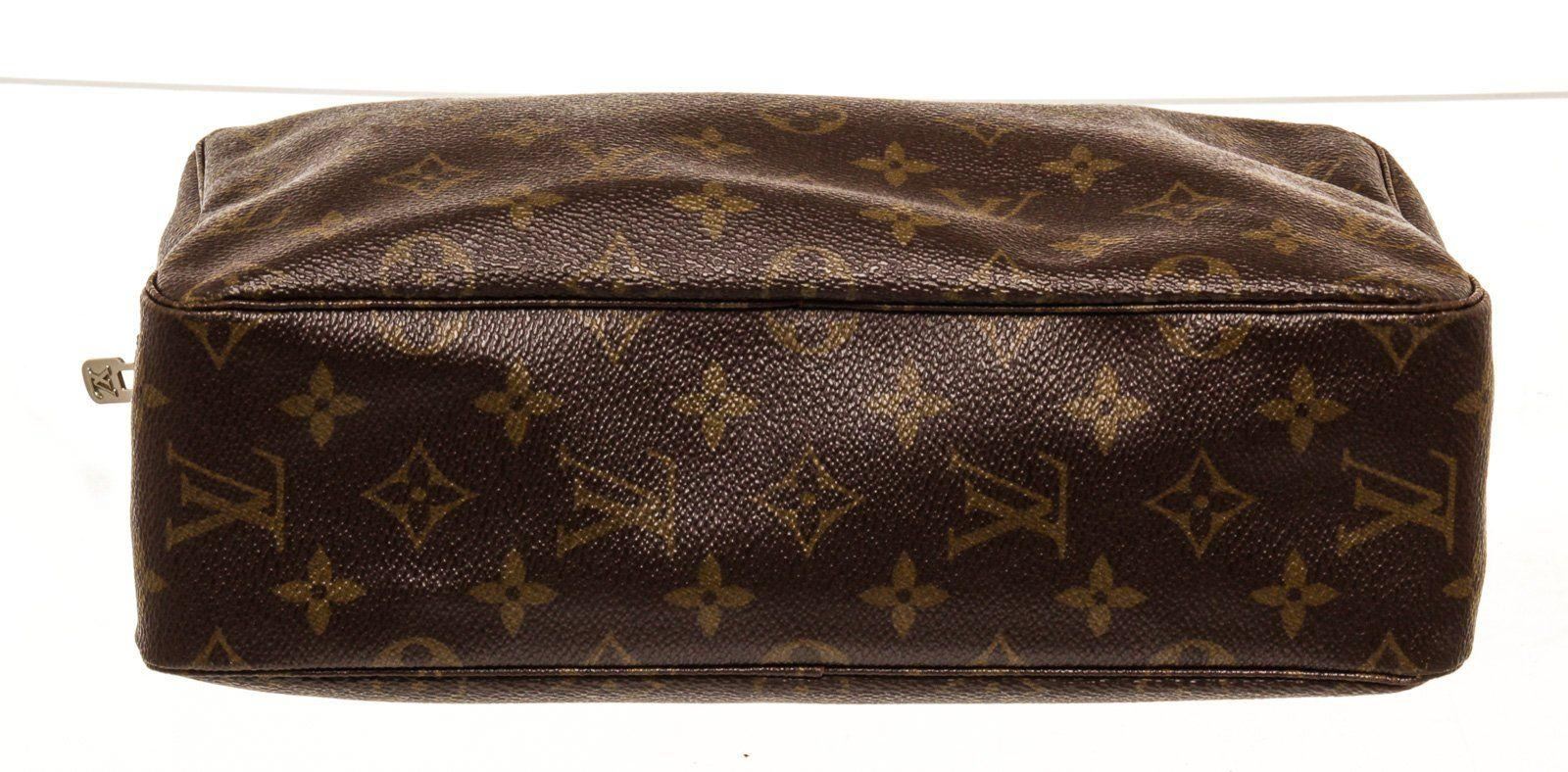 Louis Vuitton Brown Toiletry 28cm Cosmetic Bag with monogram canvas, gold-tone hardware, trim tan vachetta leather, interior slip pocket and zipper closure.