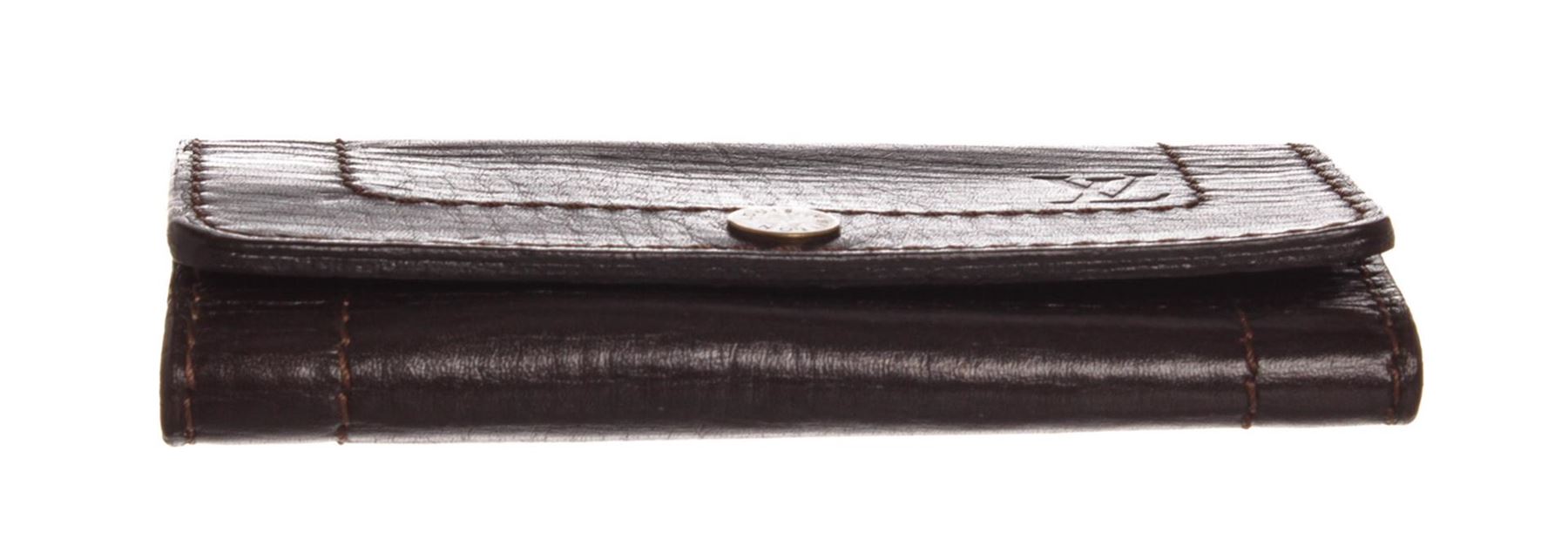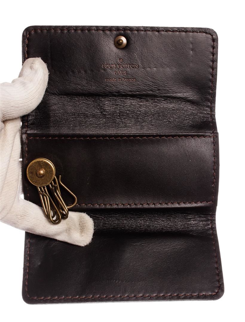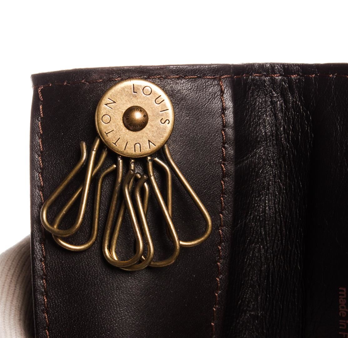 Dark brown Utah Leather Louis Vuitton 6 key case with leather interior featuring six key holders and snap closure at front.