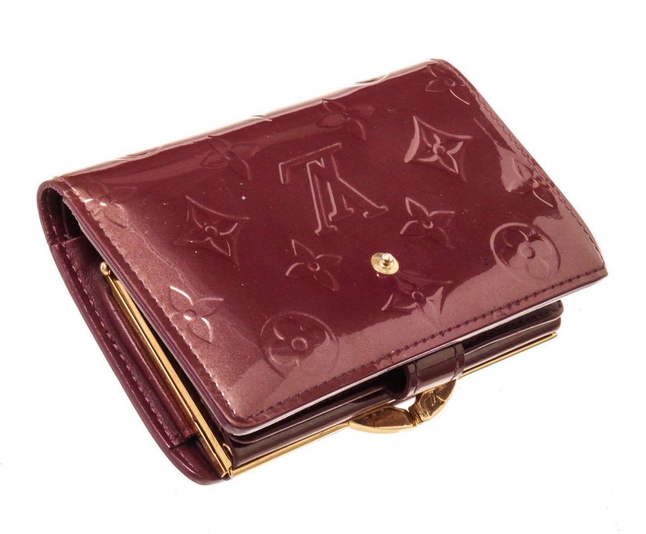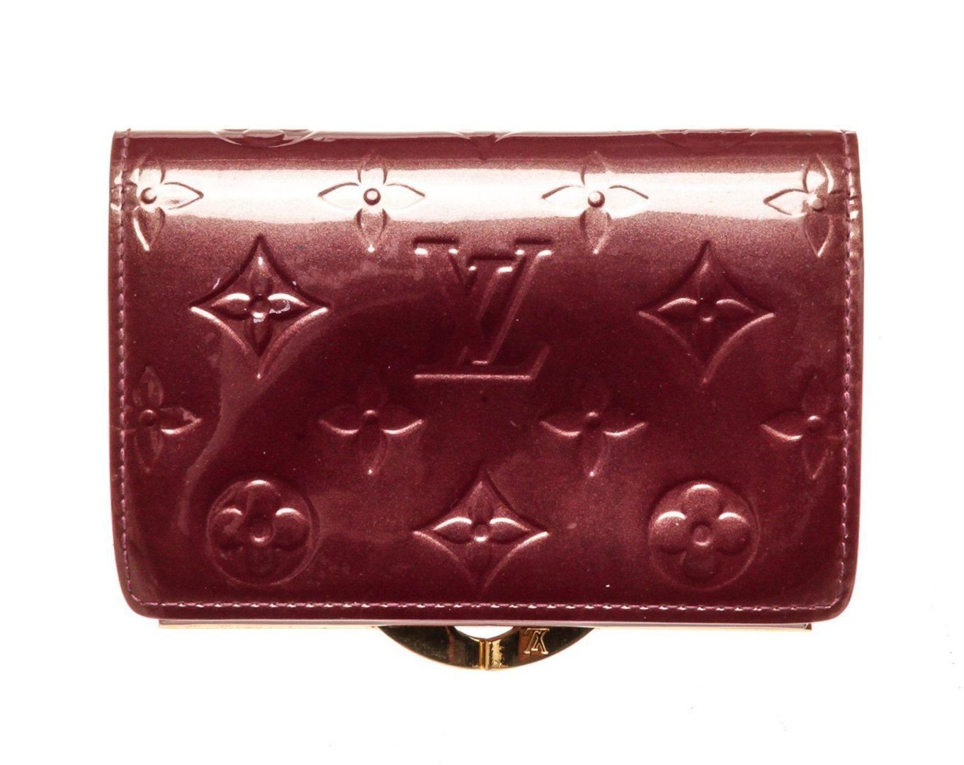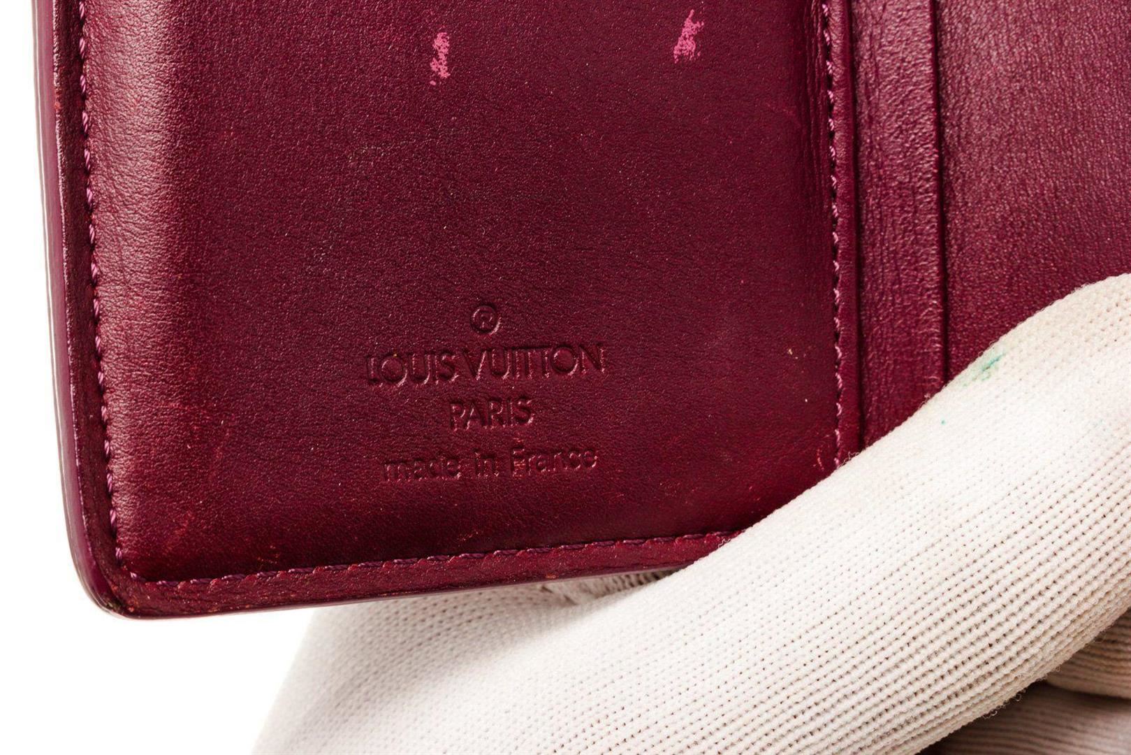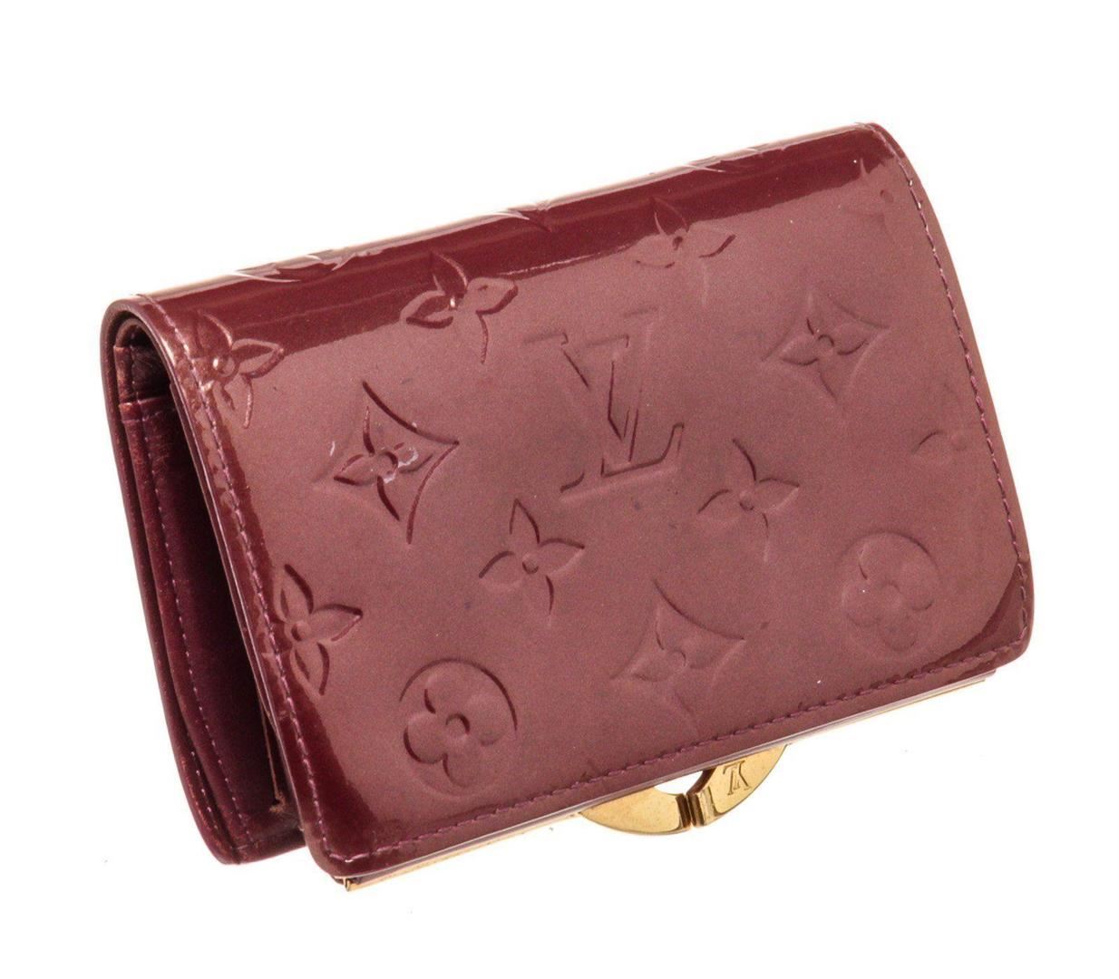 Louis Vuitton Brown Vernis Leather French Wallet with vernis leather, gold-tone hardware, trim tan vachetta leather, three interior compartments pockets, leather lining and snap closure.