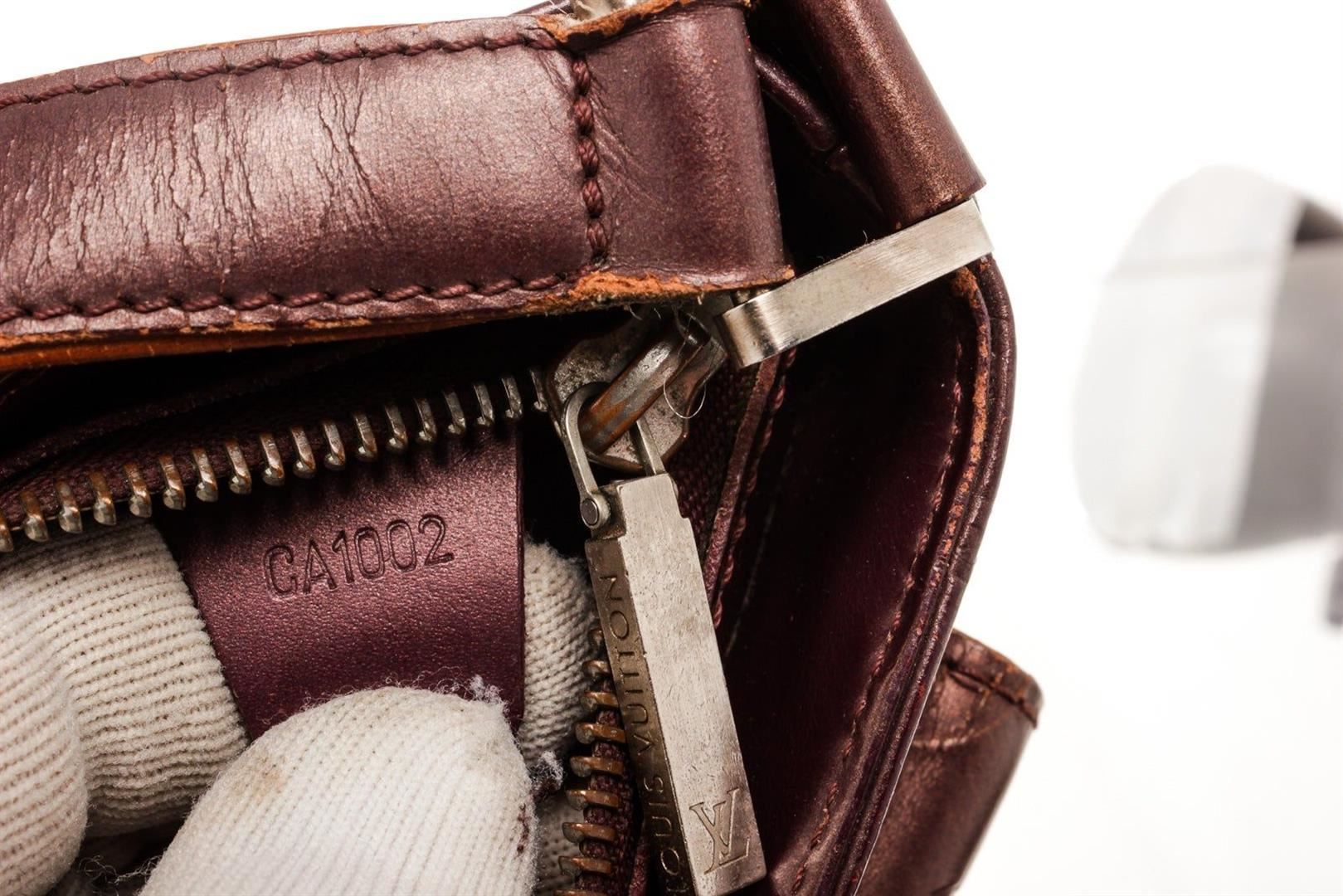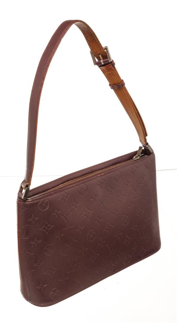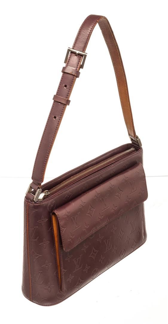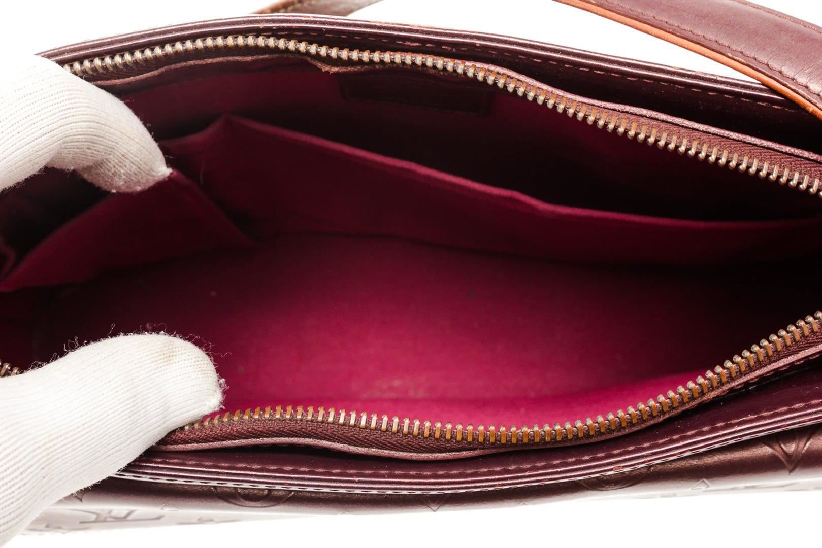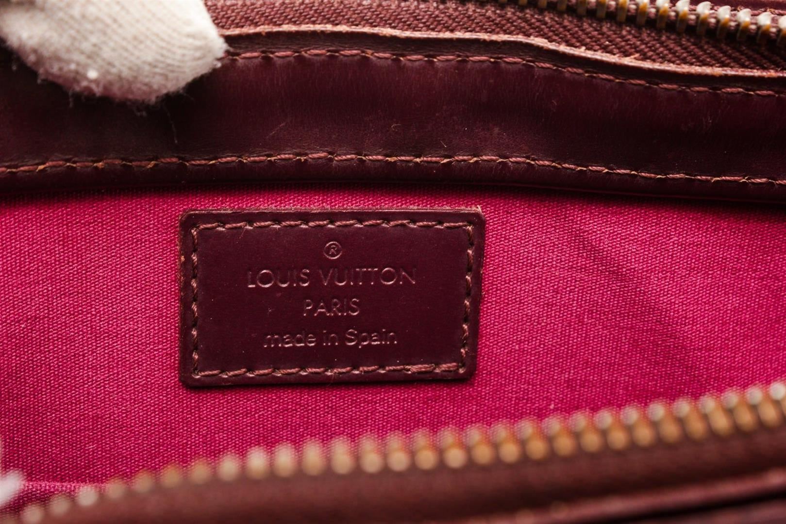 Louis Vuitton Brown Vernis Leather Mat Allston Shoulder Bag with vernis leather, gold-tone hardware, trim tan vachetta leather, exterior slip pocket, interior slip pocket, shoulder strap and zipper closure.
