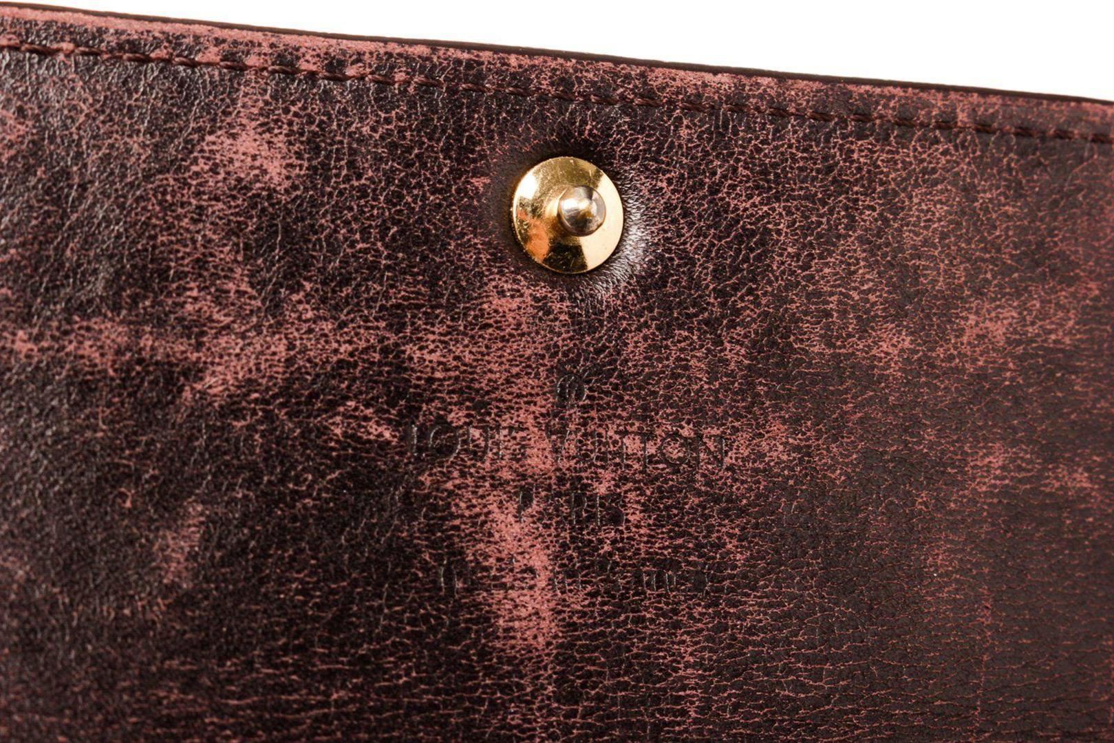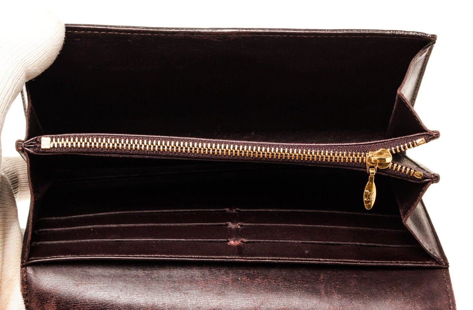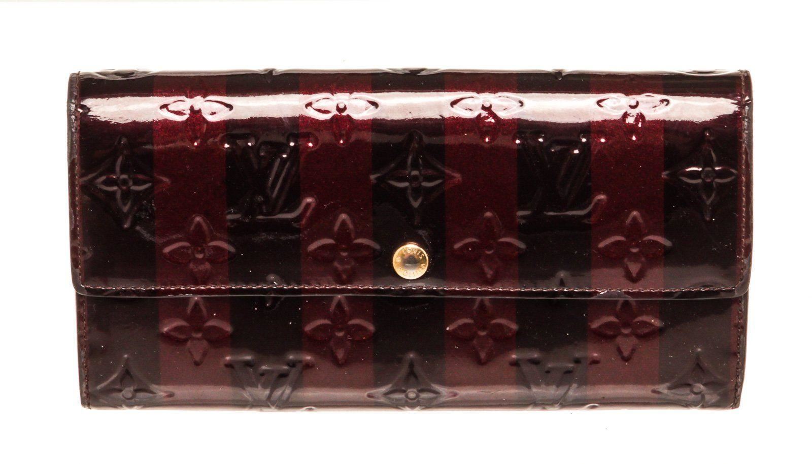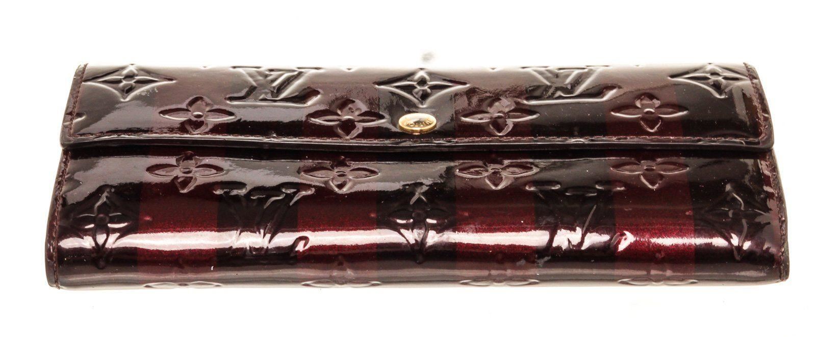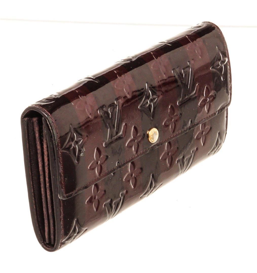 Louis Vuitton Brown Vernis Leather Sarah Wallet with vernis leather, gold-tone hardware, three interior compartments pockets, trim tan vachetta leather and snap closure.