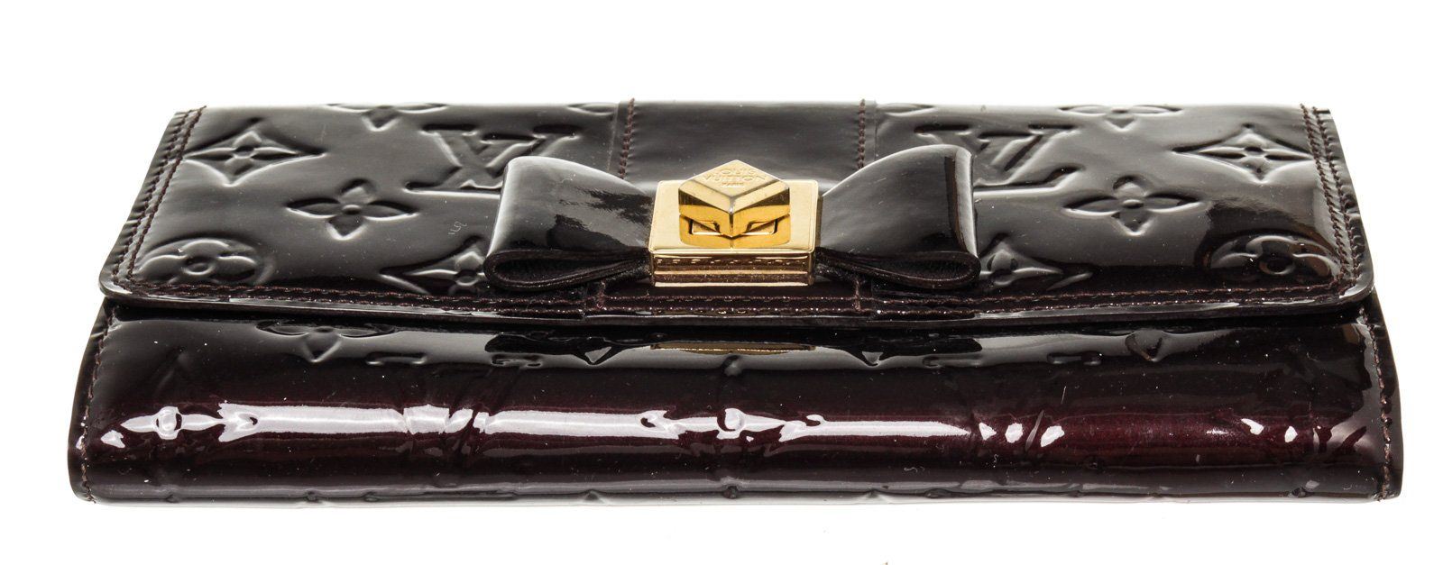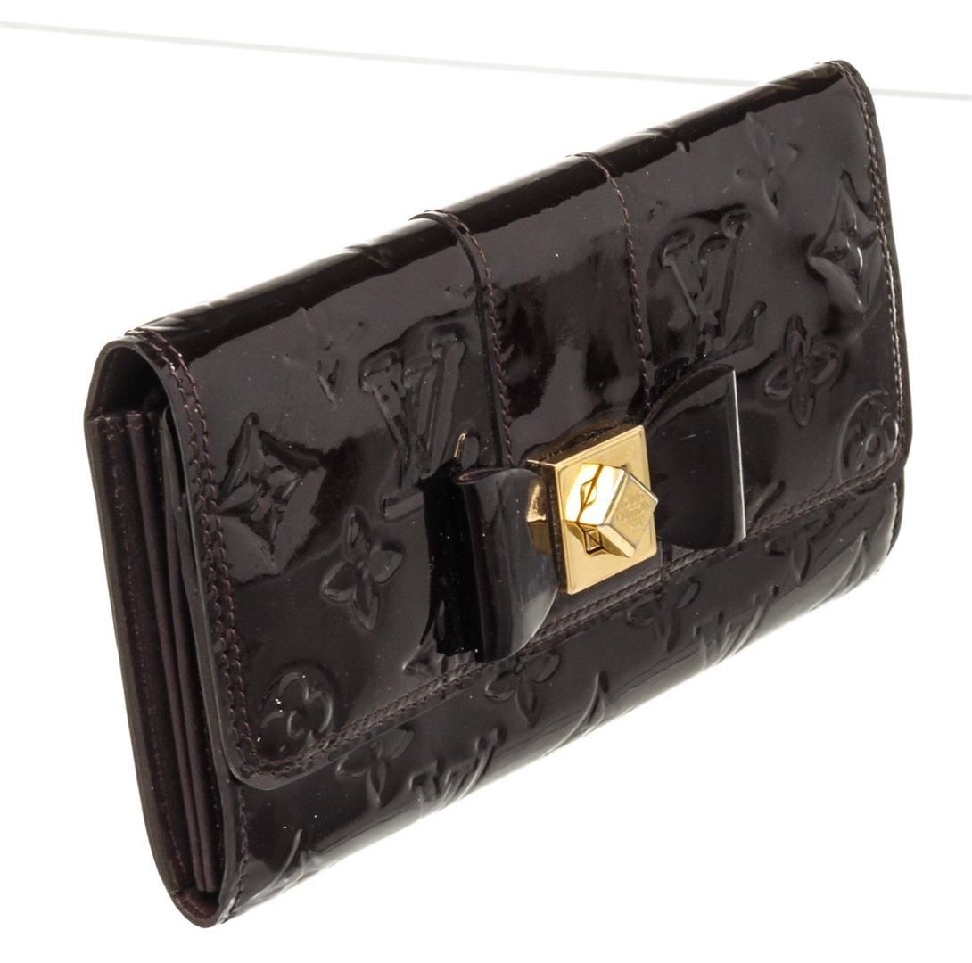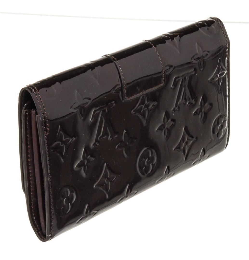 Louis Vuitton Brown Vernis Leather Wallet with vernis leather, gold-tone hardware, trim tan vachetta leather, interior three compartments pockets and zipper closure.